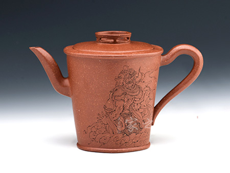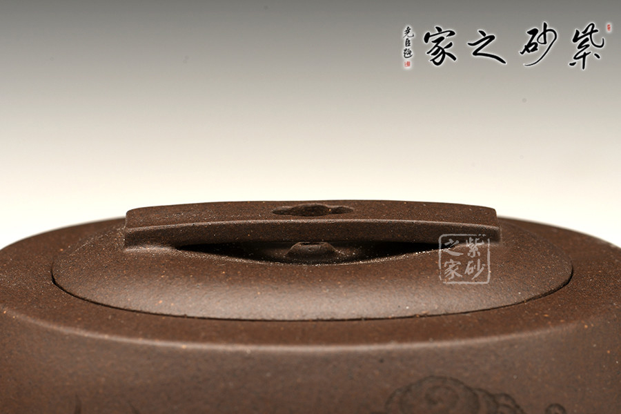 這款“漢玉”壺呈圓柱形狀,上部稍斂,直嘴耳把,再加上嵌蓋壓壺,渾然一體,整器頗得拙中藏巧的漢韻風(fēng)格。原礦紫泥制壺,幽幽光澤由內(nèi)煥發(fā),似壺似玉,珍貴異常。