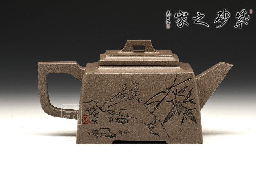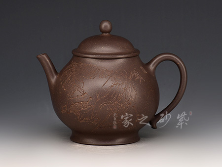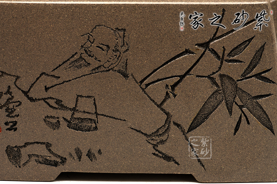 B面: 裝飾: 竹林居士圖 裝飾者:何忍群 裝飾內(nèi)容: 有竹林風(fēng)吹,有香茗茶飲,居士安然之態(tài)躍然壺上