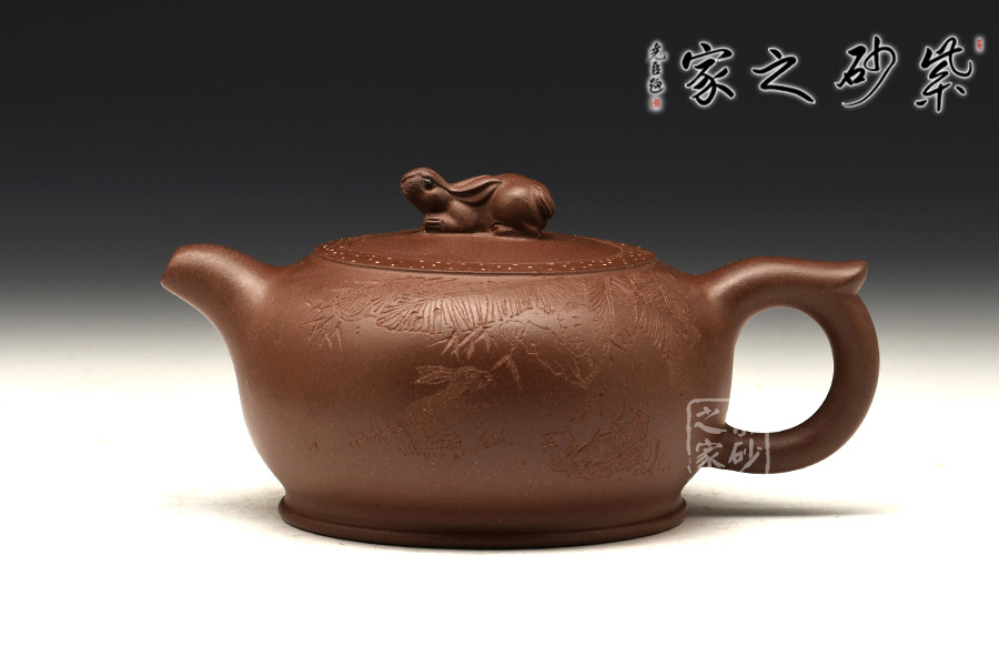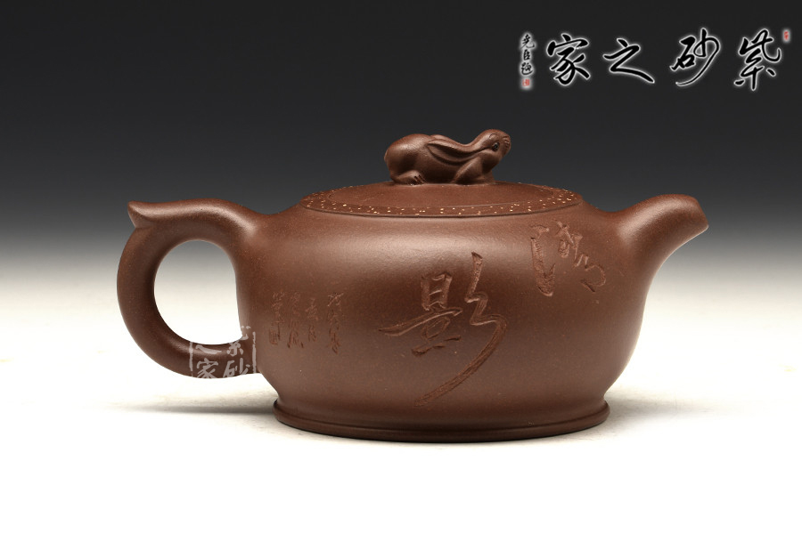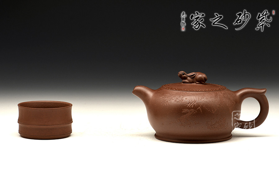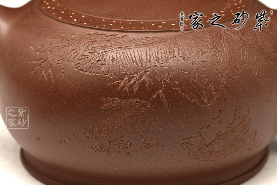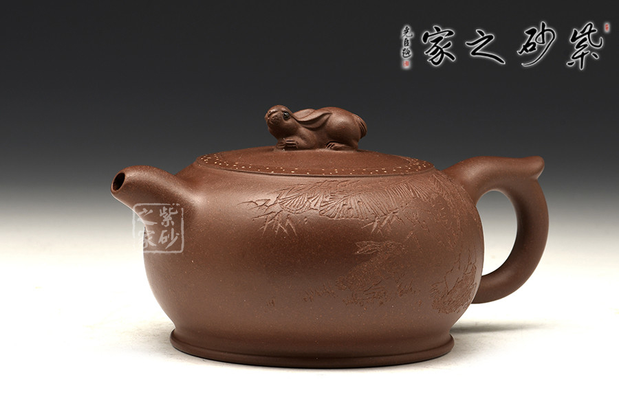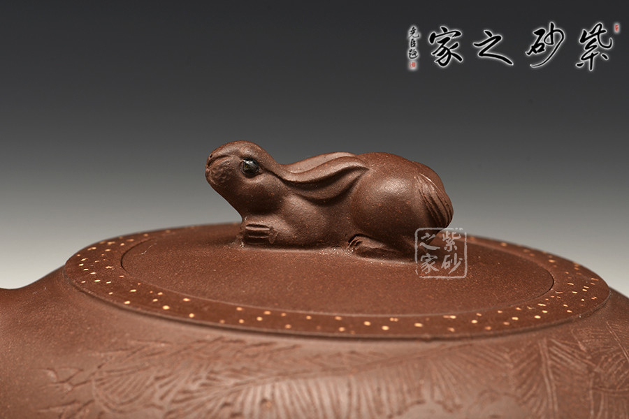 此壺造型新穎、主題鮮明,扁圓壺身,敦實可愛;彎嘴飛把,簡約之間更顯和諧美感;嵌蓋于壺,渾然一體;此壺點睛之處在于蓋面上的兔子形鈕,呼應(yīng)“玉兔壺”主題,更顯作品的觀賞價值,別致有趣。