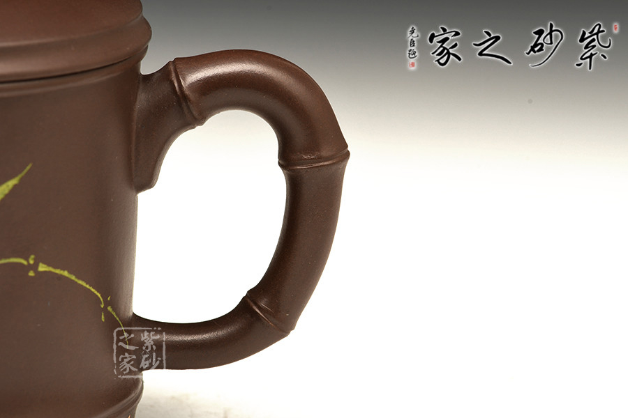 作品創(chuàng)作靈感來(lái)源于竹,整壺“以竹入壺”,壺身為竹節(jié)形狀,挺拔厚實(shí)。三彎嘴、拱形鈕、耳形把也均為竹節(jié)形狀設(shè)計(jì),彎繞過(guò)渡自然,強(qiáng)勁有力之感。壺底部環(huán)圈圍繞,鋪砂裝飾,更添了此壺的藝術(shù)美感。