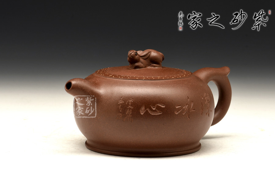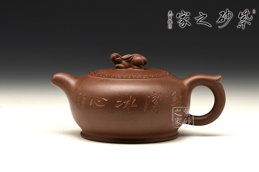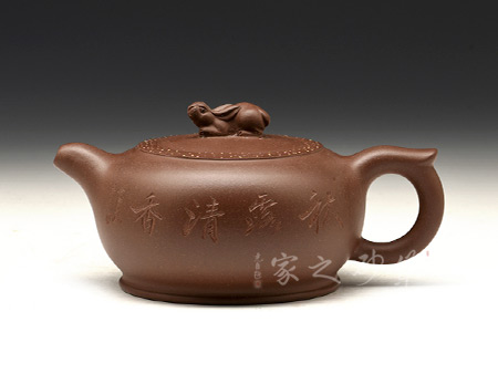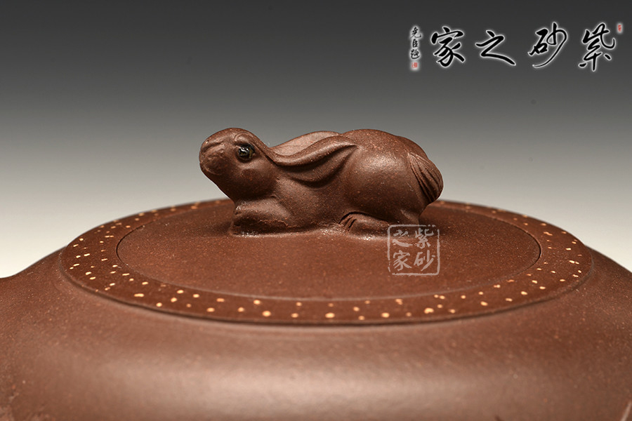 作品造型新穎,線條圓潤柔和,扁圓壺身,敦實(shí)可愛;彎嘴飛把,簡(jiǎn)約又具和諧美感;嵌蓋于壺,渾然一體,加上壺蓋周圍點(diǎn)點(diǎn)鋪砂裝飾,增添了此壺的觀賞價(jià)值;此壺點(diǎn)睛之處在于蓋面上的兔子形鈕,呼應(yīng)“玉兔壺”主題。整器觀來就想立即握于手間,細(xì)細(xì)把玩一番。