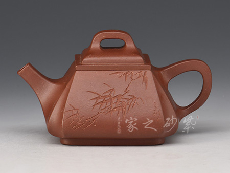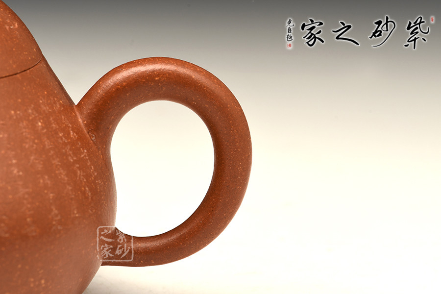 這款“梨式”因形狀似梨而得名,整壺敦厚穩(wěn)重,壺體勻稱,腹部飽滿,口蓋較大,氣韻渾樸。作品曲線明顯,圈把秀麗,圓球形鈕,彎嘴自壺腹向上胥出,流口簡練,風格柔美。