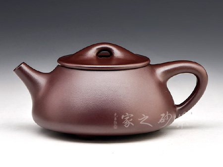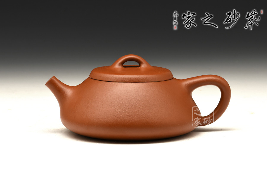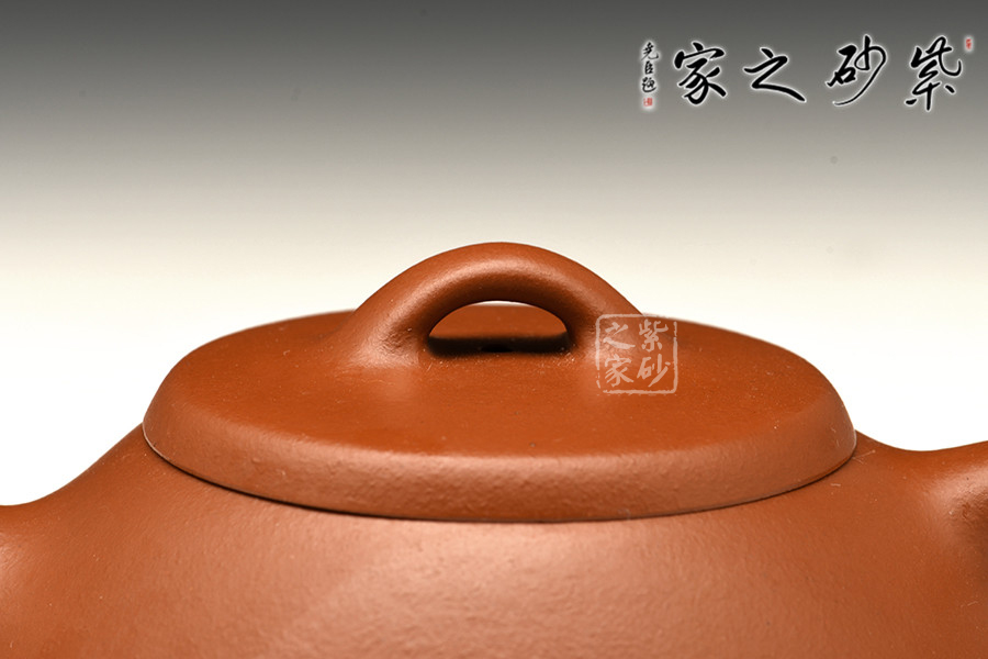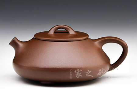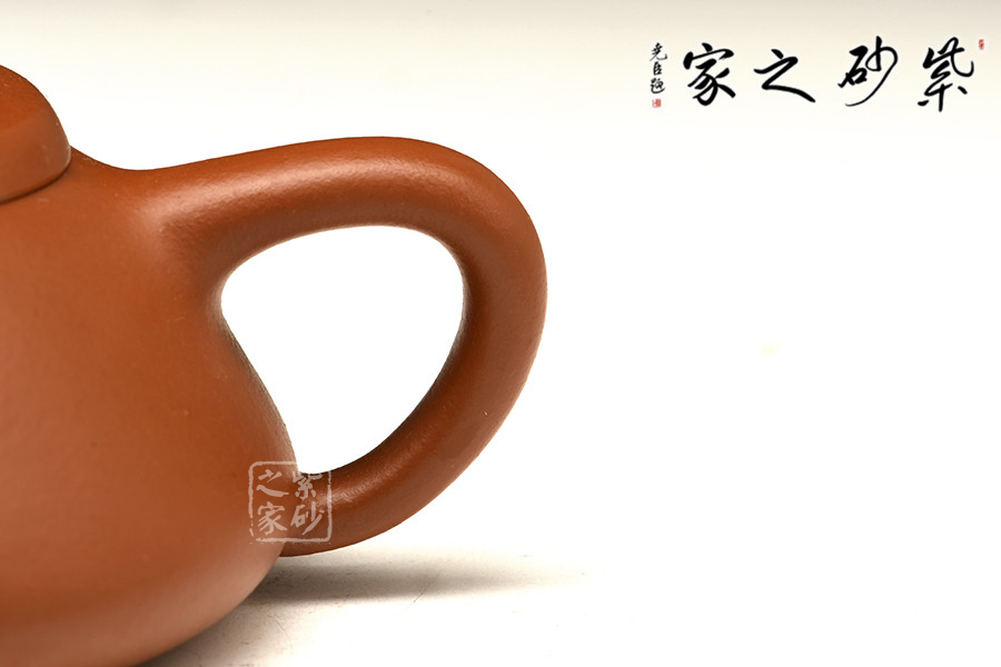 石瓢壺,造型、線條特別是韻味極難把握。整個(gè)壺體是等腰梯形,給人穩(wěn)重大方、百看不厭之感。壺嘴似炮管,力度強(qiáng)勁,干凈利落;三角形環(huán)把與壺身過渡自然嚴(yán)謹(jǐn),拿捏適度;厚蓋、橋鈕、釘足又體現(xiàn)了一種陽剛之美。此壺造型簡潔、實(shí)用性強(qiáng),原礦朱泥制壺,高貴迷人,整壺一種剛?cè)嵯酀?jì)的觀感。