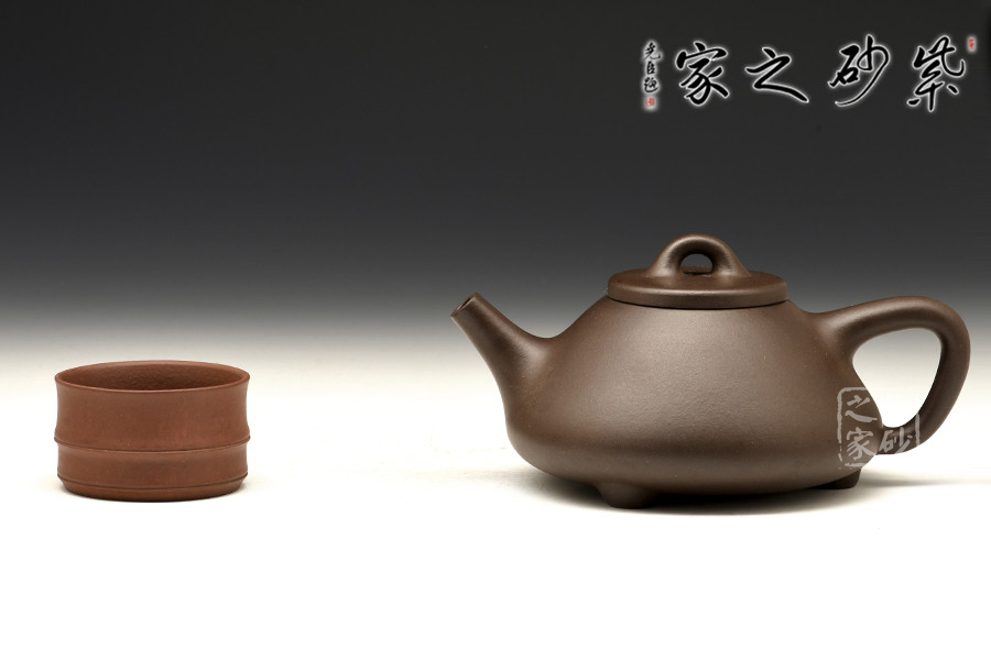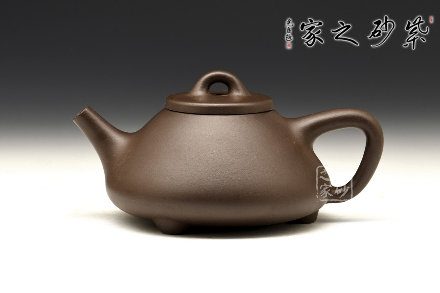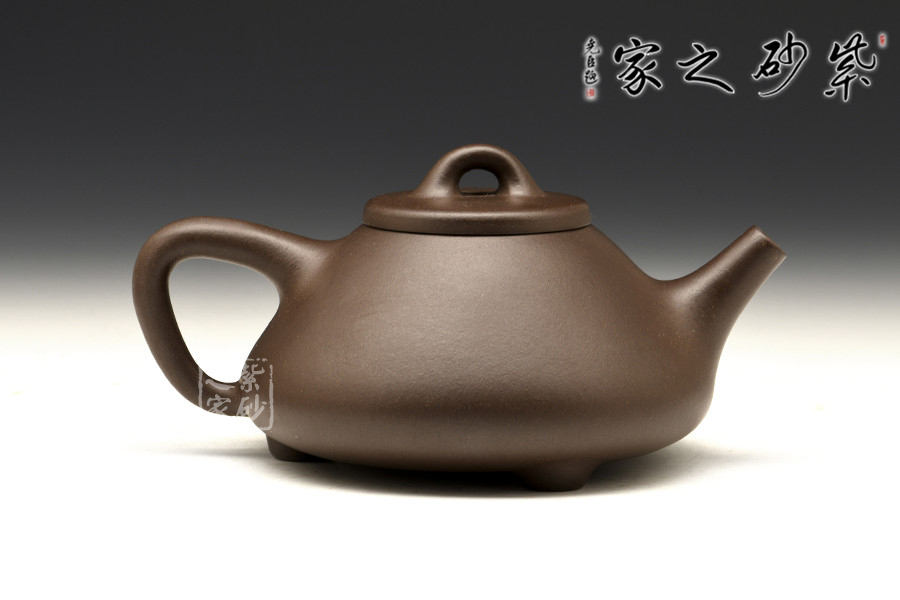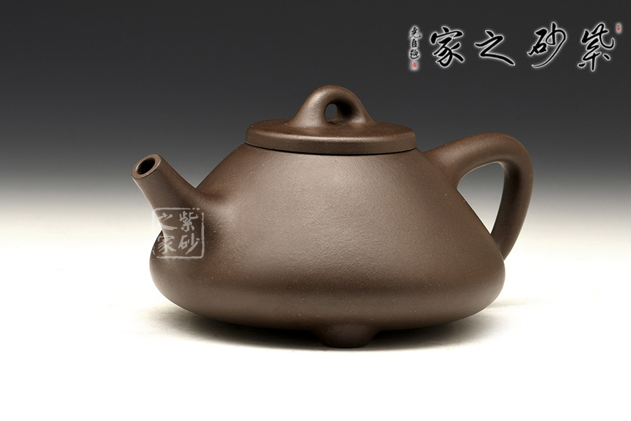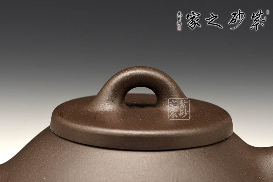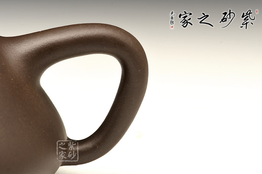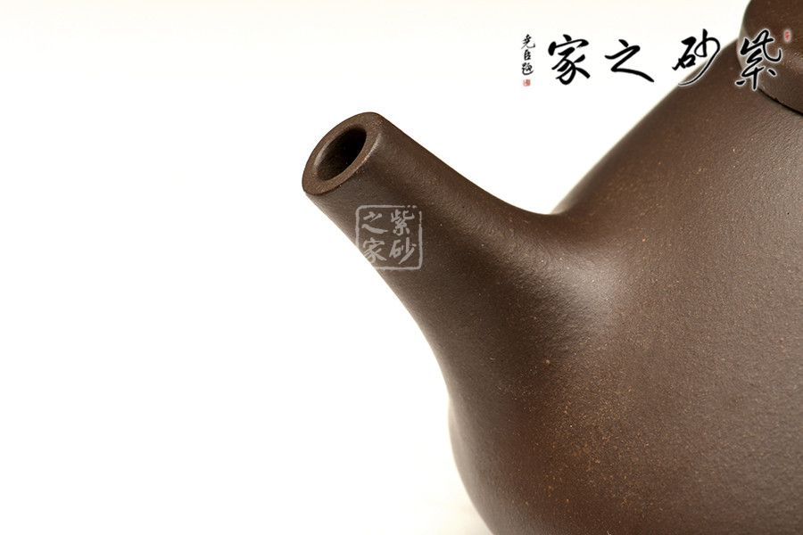 此壺壺身輪廓呈“金字塔”式,上小下大,重心下垂;壺流為矮而有力的直筒形,壺流、壺口、壺把三點形成水平直線,觀賞端莊敦穆;壺蓋厚薄適宜,與橋形的壺鈕自然融合。