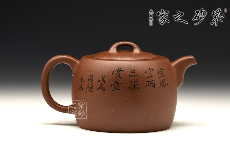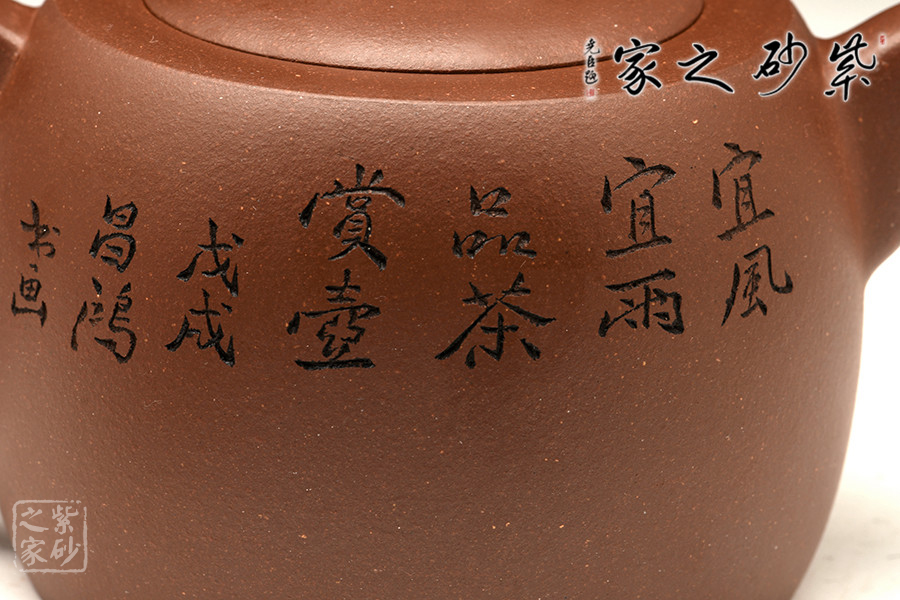 B面: 裝飾: 句刻 裝飾者:李昌鴻 裝飾內(nèi)容: “宜風(fēng)宜雨品茶賞壺”