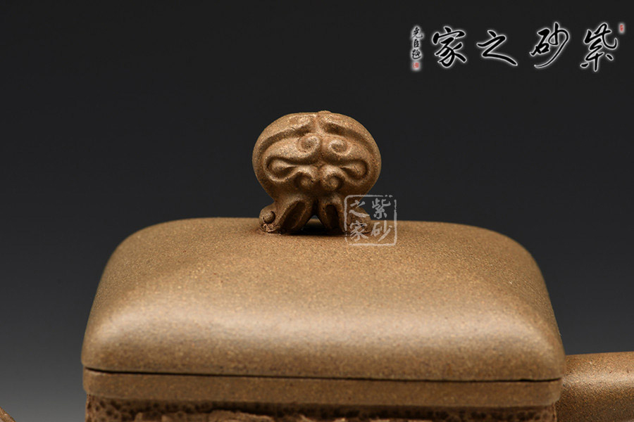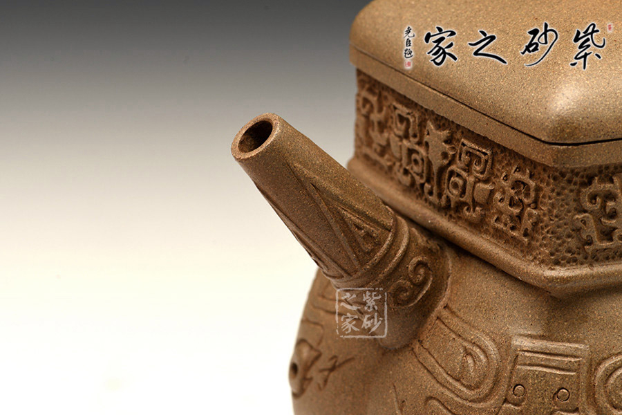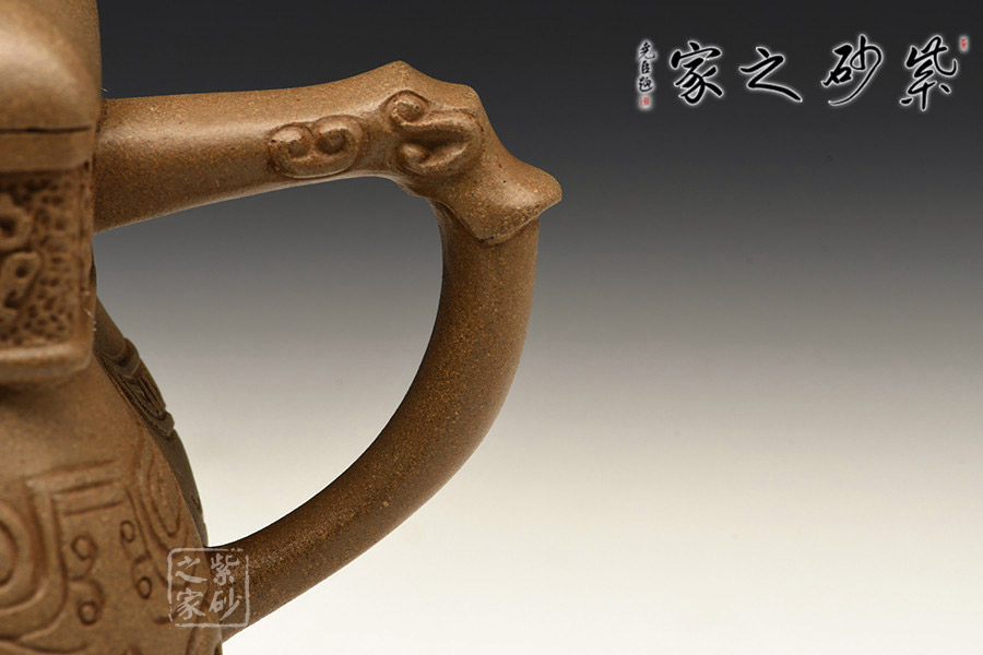 作品直形壺嘴,挺拔有力,出水方便;壺把彎折有度,拿捏平穩(wěn);蓋面高聳,其上壺鈕精巧別致,更顯得此壺的神秘大氣。此種壺型足可見作者的深厚的制壺功底及裝飾技巧,用于收藏投資具有極大的升值空間。