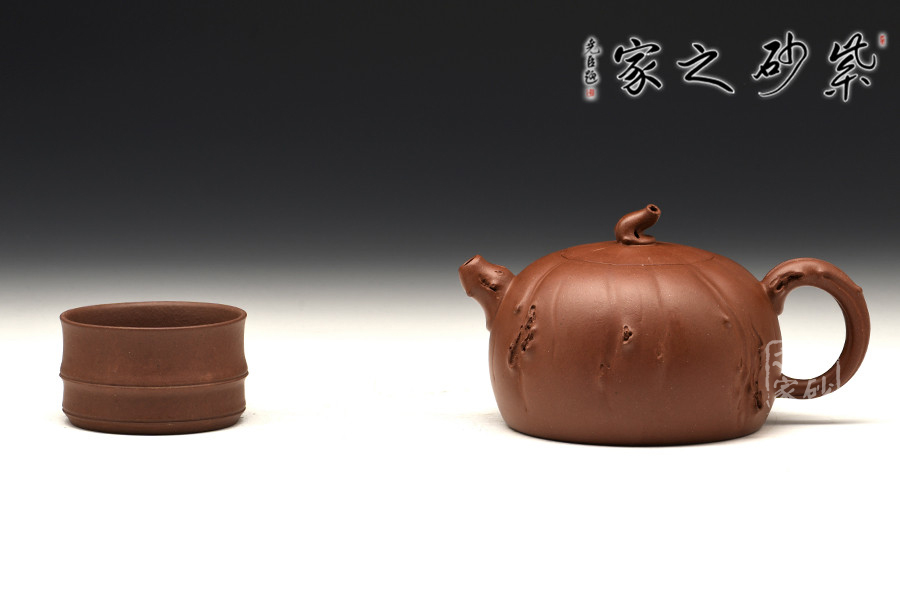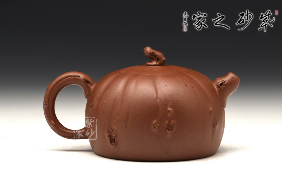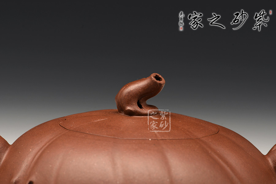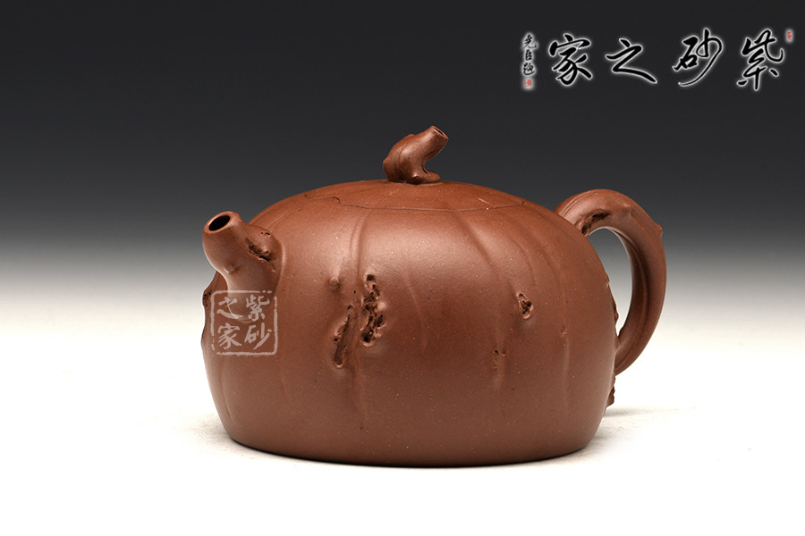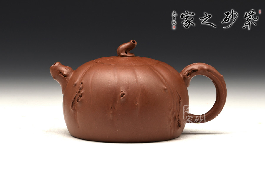此壺雅致清新,勻稱飽滿,弧線優(yōu)美。壺以瓜體為身,瓜蒂、瓜藤為鈕,為流,為把,壺身紋絡(luò)逼真細(xì)致,和諧自然,茶水洗心,清心怡情。