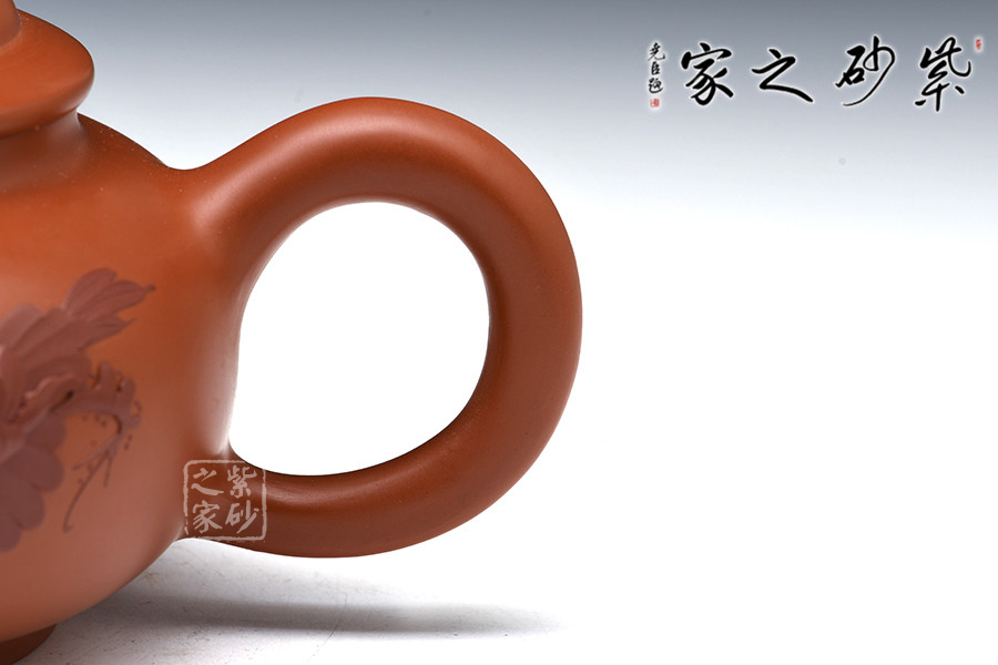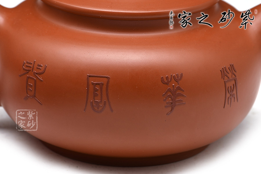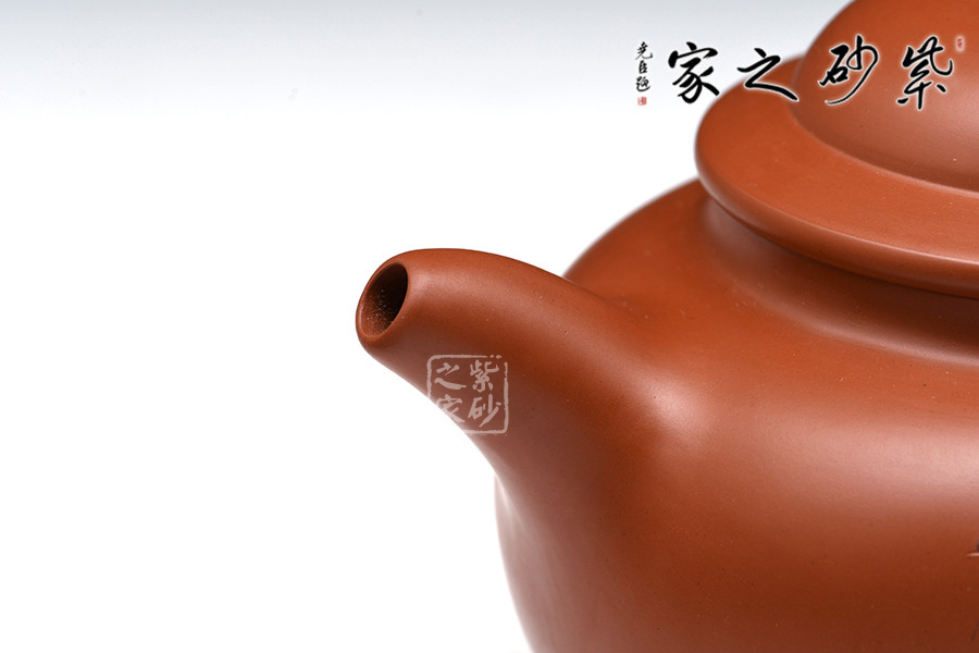該壺精工細(xì)致,古樸典雅,自然而飽滿,簡單卻不單調(diào)。身略扁、腹鼓,圓潤優(yōu)美;壓蓋珠鈕,和諧美觀;彎嘴耳把,挺拔有力。