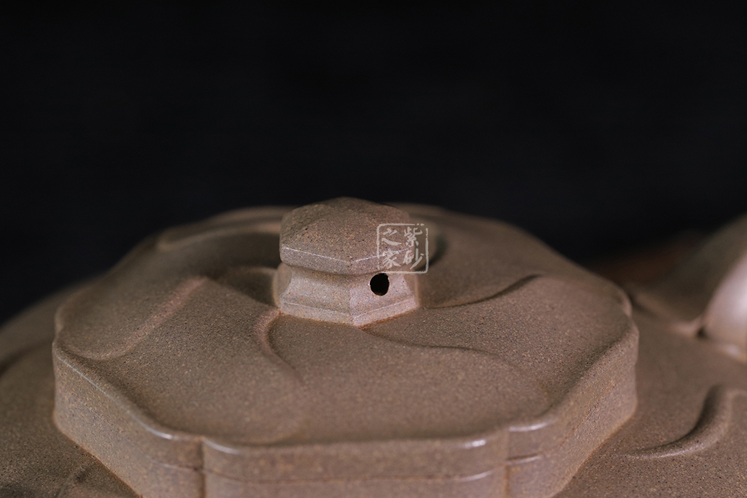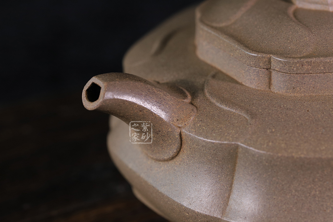 此器選用上等青段泥為胎,色澤古雅,質(zhì)感綿密。整器形體類似扁圓,在此基礎(chǔ)上加以創(chuàng)新改制,觀之別有韻味,展現(xiàn)了作者壺藝的精湛及構(gòu)思的巧妙。