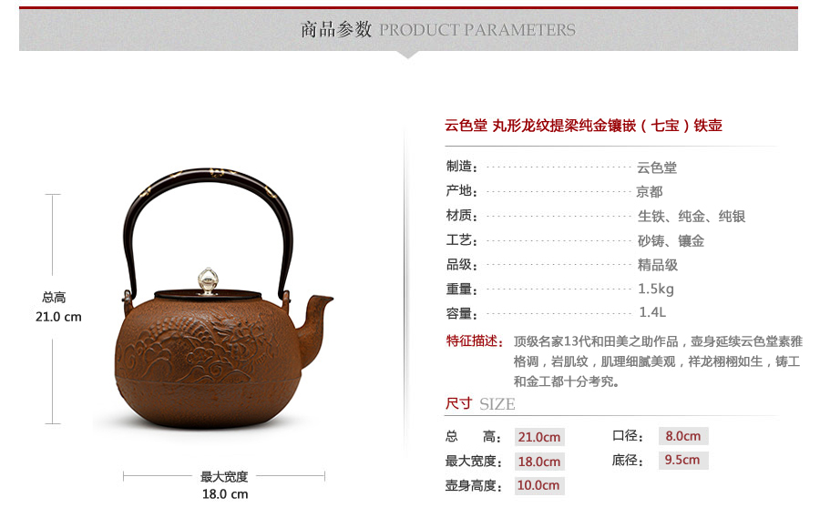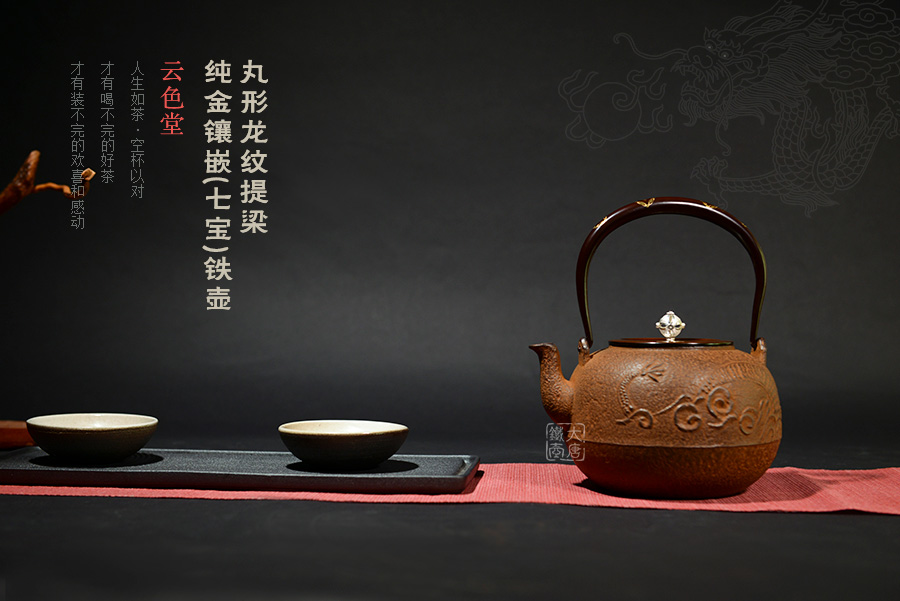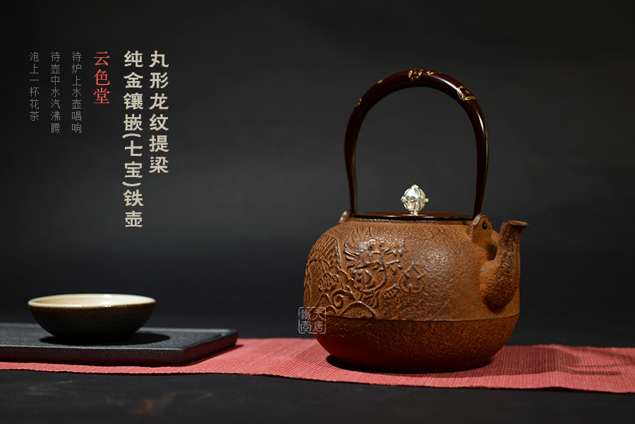 云色堂 丸形龍紋提梁純金鑲嵌(七寶)鐵壺 [ 編號:67306 ]