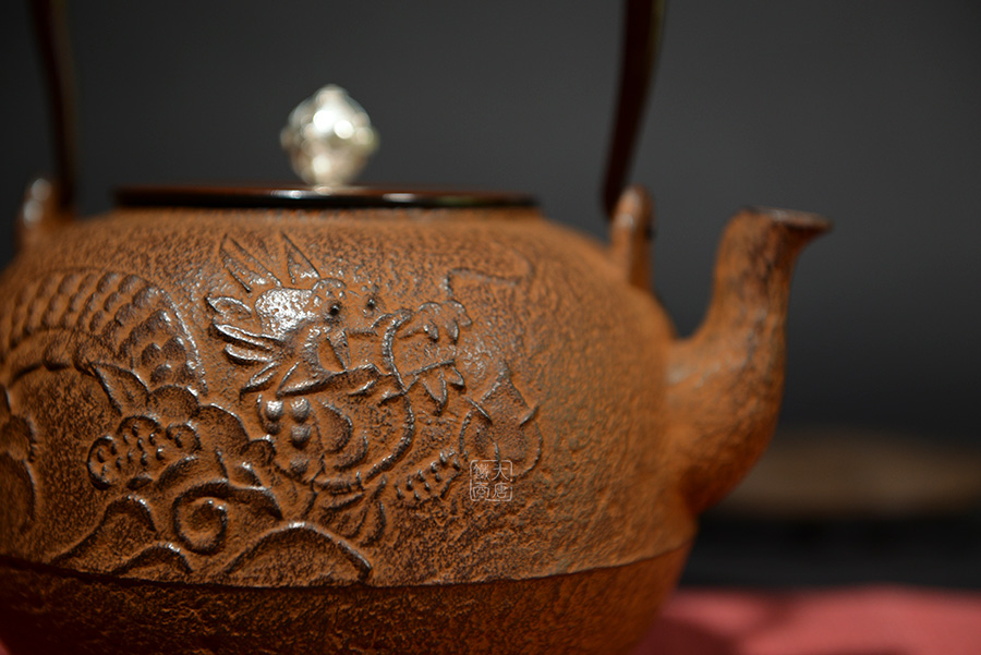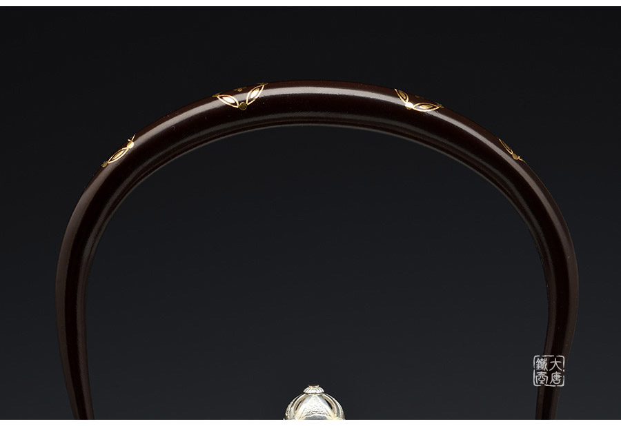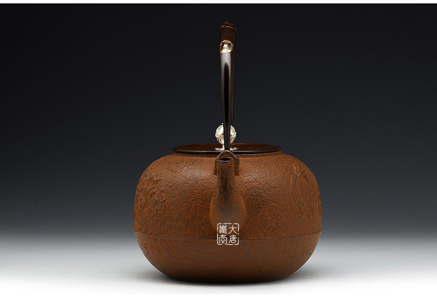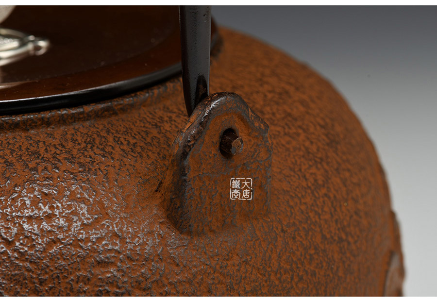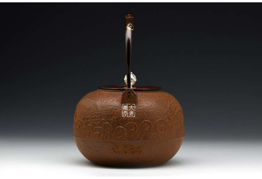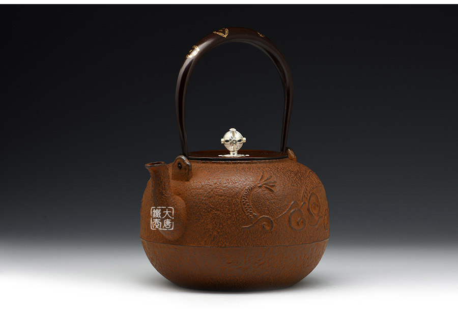 云色堂的鐵壺以豐美的裝飾技巧最為人稱道,描金及鑲金技術十分成熟。紋飾圖案的線條借鑒了日本古典瓷器的樣式。同時在一些細節(jié)的構建上,云色堂也不惜使用珍貴的材料來彰顯他華貴的氣質。在眾多堂口的鐵瓶中,這種特色使得其作品有很強的辨識性。
