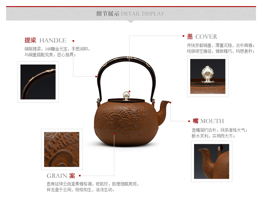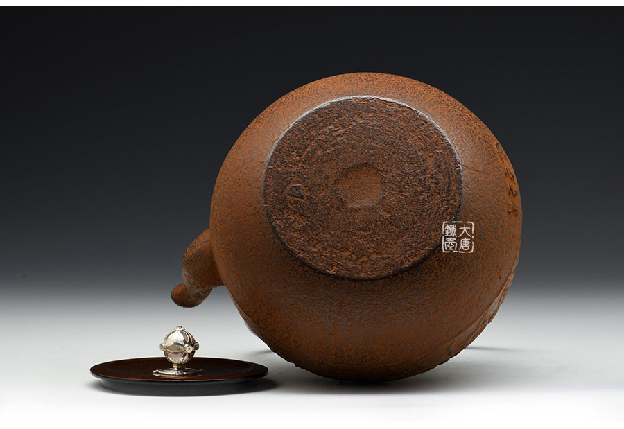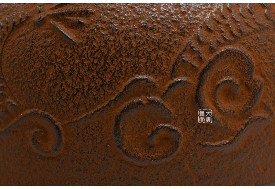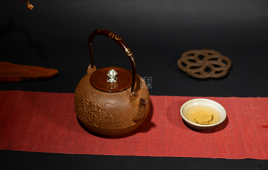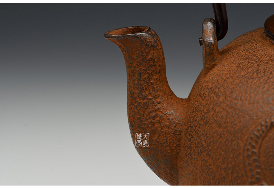 云色堂的鐵壺以豐美的裝飾技巧最為人稱道,描金及鑲金技術十分成熟。紋飾圖案的線條借鑒了日本古典瓷器的樣式。同時在一些細節(jié)的構建上,云色堂也不惜使用珍貴的材料來彰顯他華貴的氣質。在眾多堂口的鐵瓶中,這種特色使得其作品有很強的辨識性。