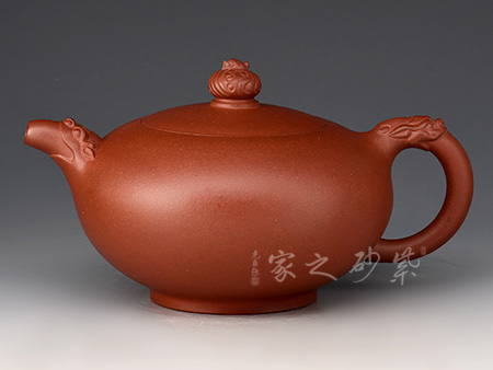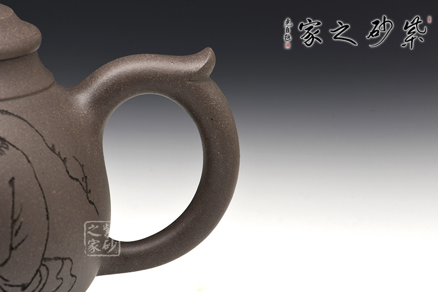 嘴流從壺身中伸展,其上雕刻龍頭,呈龍吐水之形,剛健有力,自然天成;耳狀飛把秀姿優(yōu)雅,和諧有度,