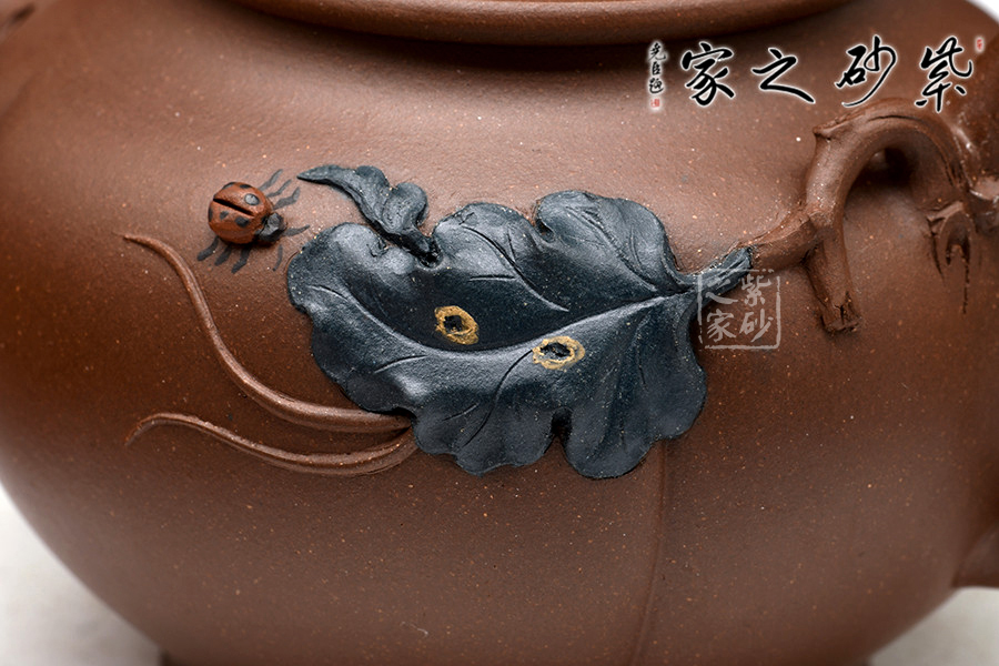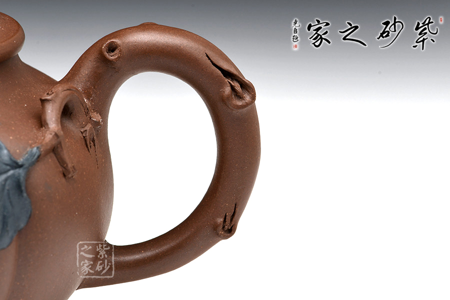 壺以瓜體為身,勻稱飽滿,蓋與身上下貫通,弧線優(yōu)美。瓜蒂為鈕,藤為壺把,流嘴為瓜葉裹挾而成,壺身雙色泥貼塑莖、須、葉,紋絡逼真細致,和諧自然。