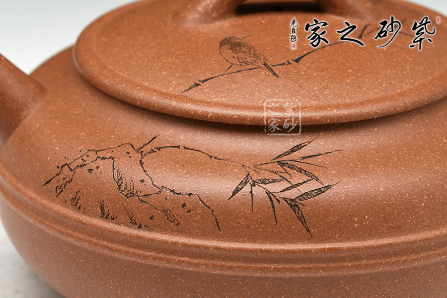 此壺圓扁壺身,短嘴環(huán)把,與壺身處銜接自然;壺鈕拱形鈕,形態(tài)挺拔有度,非常大氣。壺身腹部玉帶裝飾畫(huà)龍點(diǎn)晴,流動(dòng)和飄逸感十足,給人一種心靈上的精神享受。