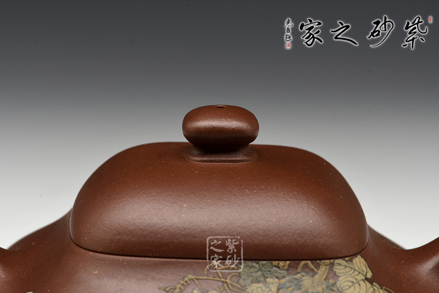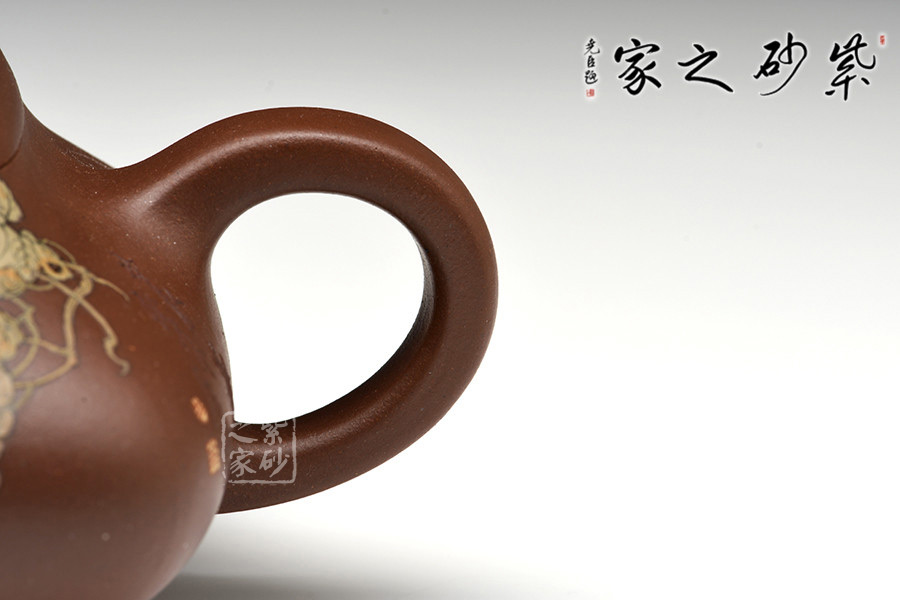 作品壺蓋上隆,中設(shè)扁形提鈕,短頸、鼓腹。就制作的難度來看,成型難度相當(dāng)高,甚至可謂是紫砂陶器中,最具挑戰(zhàn)性的幾個器形之一,最是考驗陶手的制壺功力。