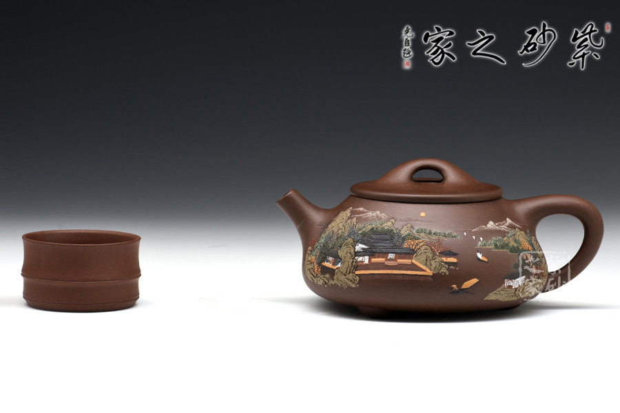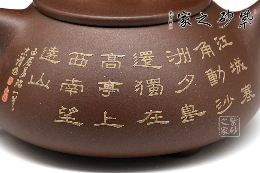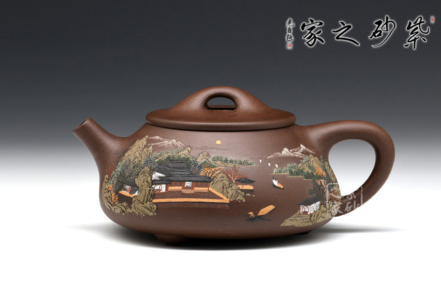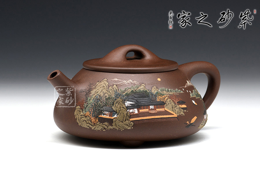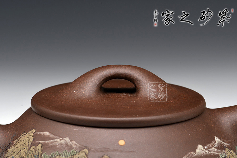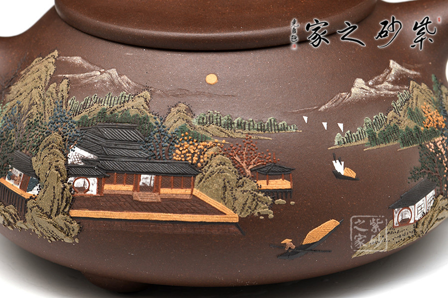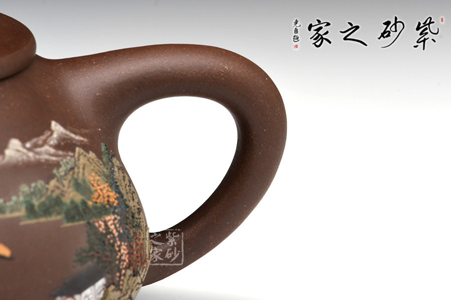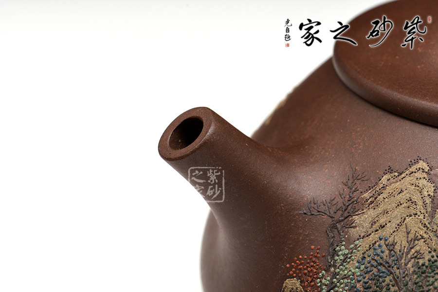 壺形優(yōu)美,氣韻大雅,剛?cè)嵯酀?jì),壺穩(wěn)重而不失輕盈,壺身較為寬大,宜書宜畫,老師親自在壺身泥繪山水畫意圖,并輔以詩句,提升了石瓢壺的人文氣韻。