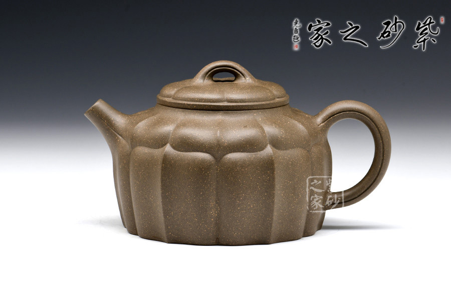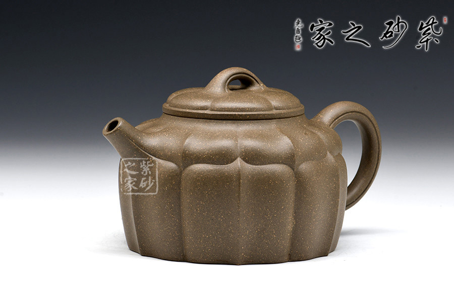 菱花壺整體造型優(yōu)雅別致,精細(xì)規(guī)整,此壺采用兩層菱花形態(tài)組成。一層,菱花線條由蓋向要腹線延伸,筋紋規(guī)整嚴(yán)密,蓋、身相應(yīng)成一朵盛開的菱花,形象典雅出塵。接下來是由壺腹向壺底的筋紋分布,連貫而通暢,明確而清晰,豐富了造型形體。