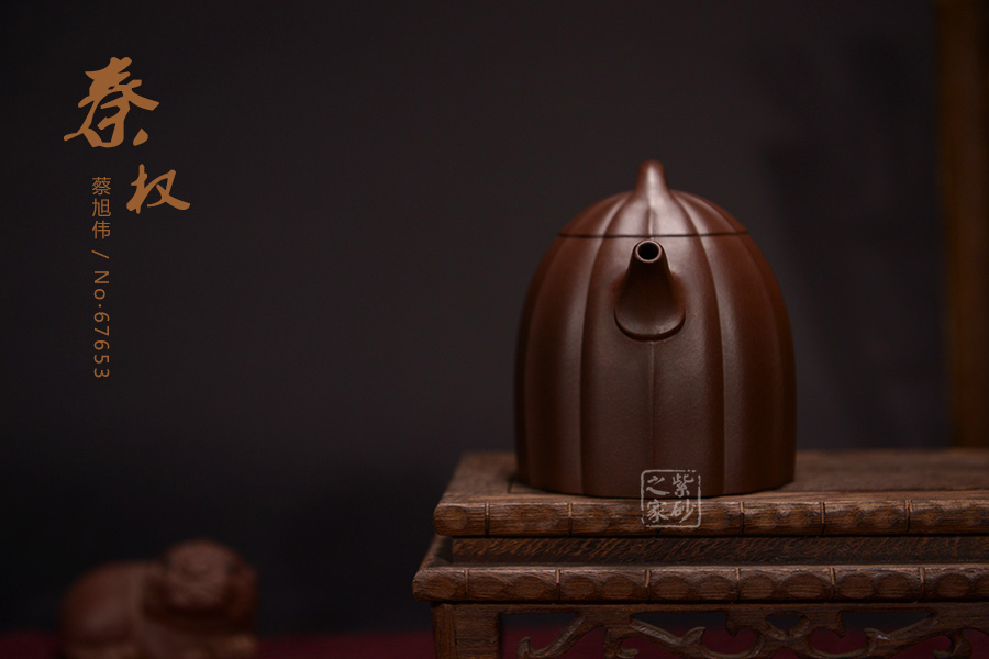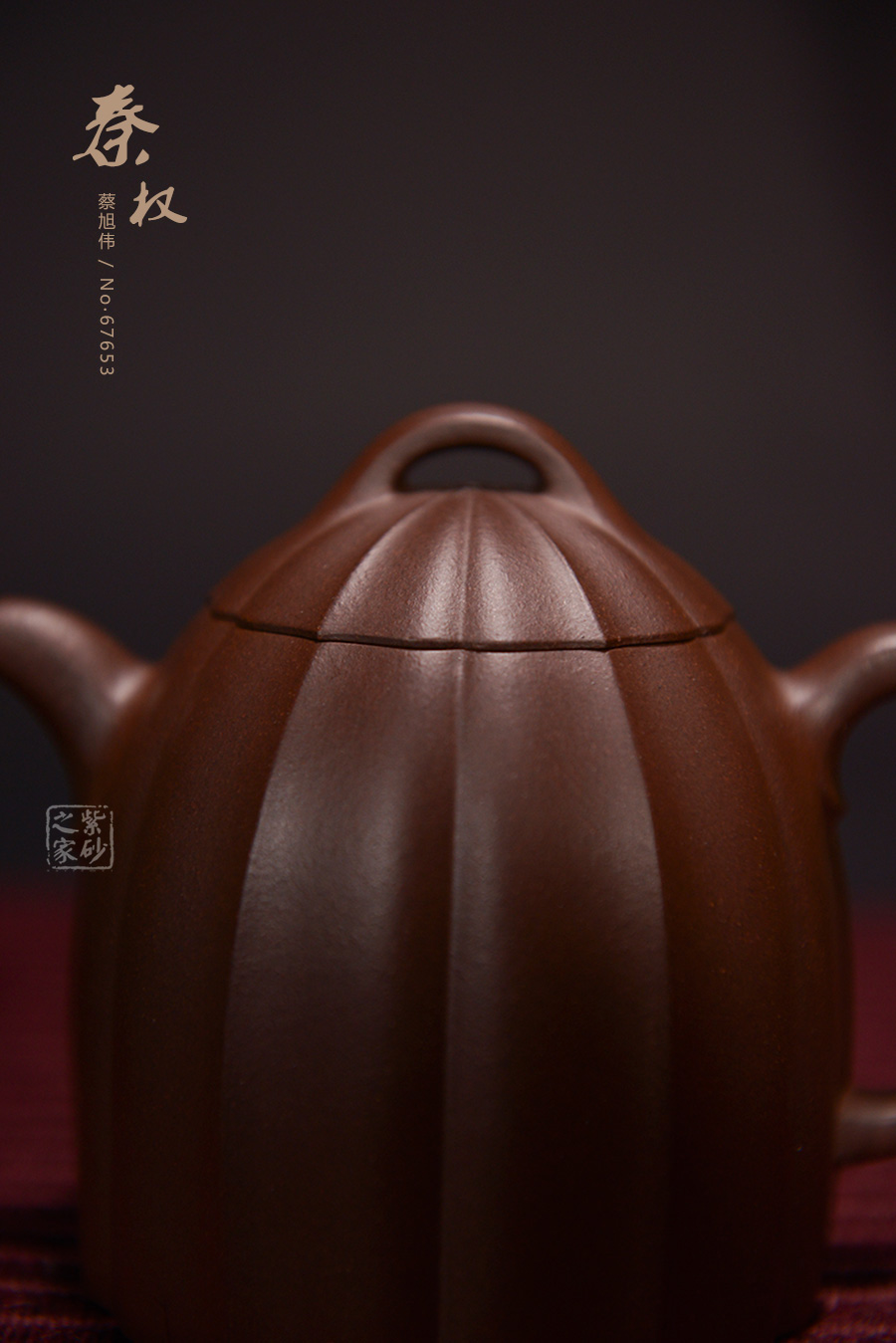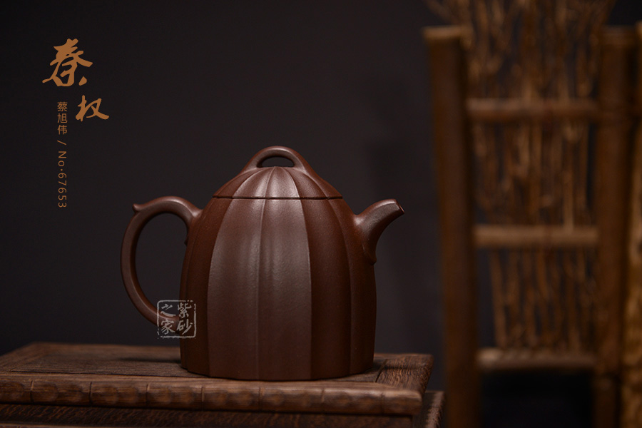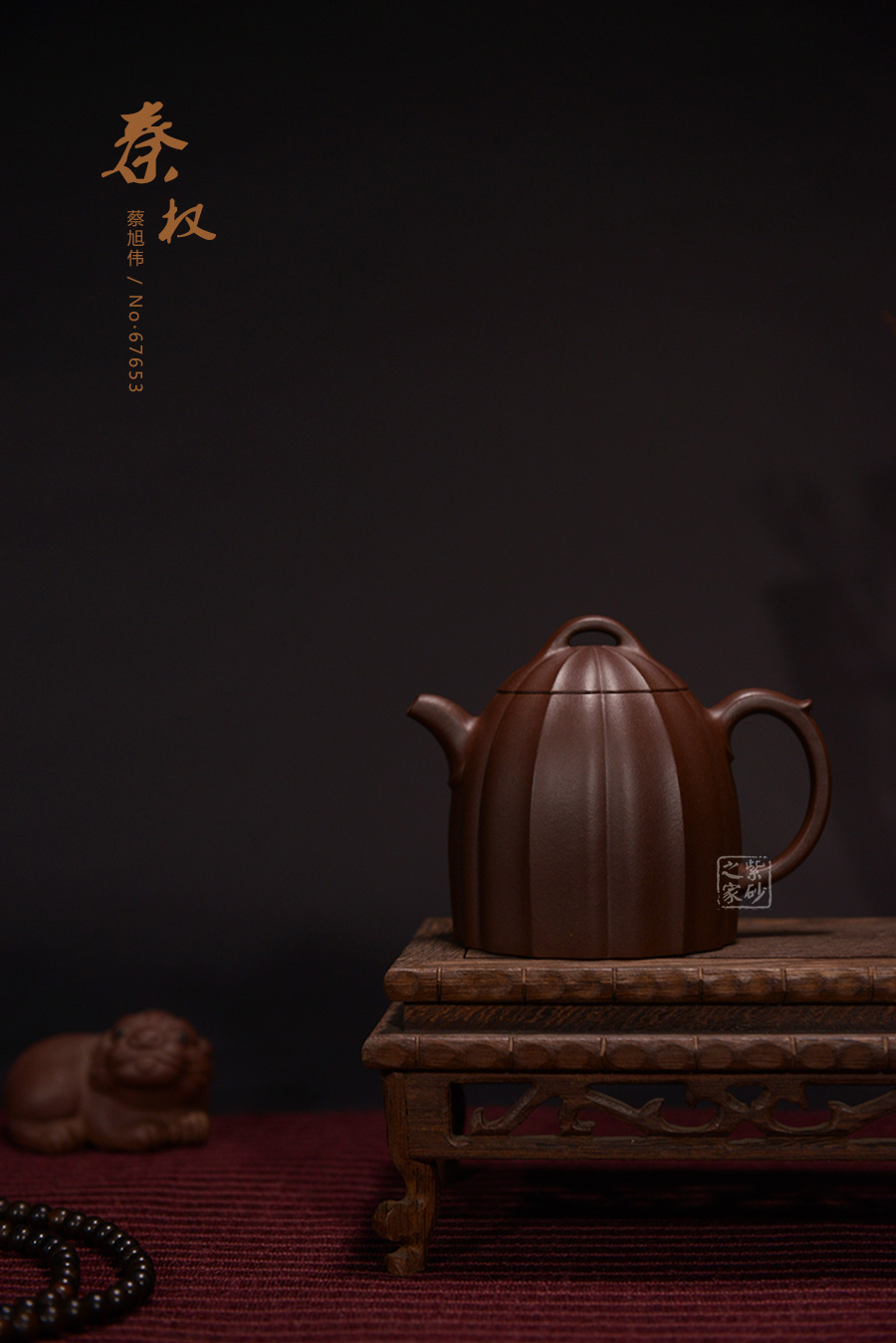 作品是在秦權(quán)基本款型的基礎(chǔ)上,結(jié)合筋紋器型制成。以自然的筋紋入壺,由壺蓋至壺身等分均勻,整齊協(xié)調(diào),組成精密嚴(yán)格的結(jié)構(gòu),壺體隨著造型形體的變化而深淺得宣,紋理清楚,具有強烈的節(jié)奏韻律美。