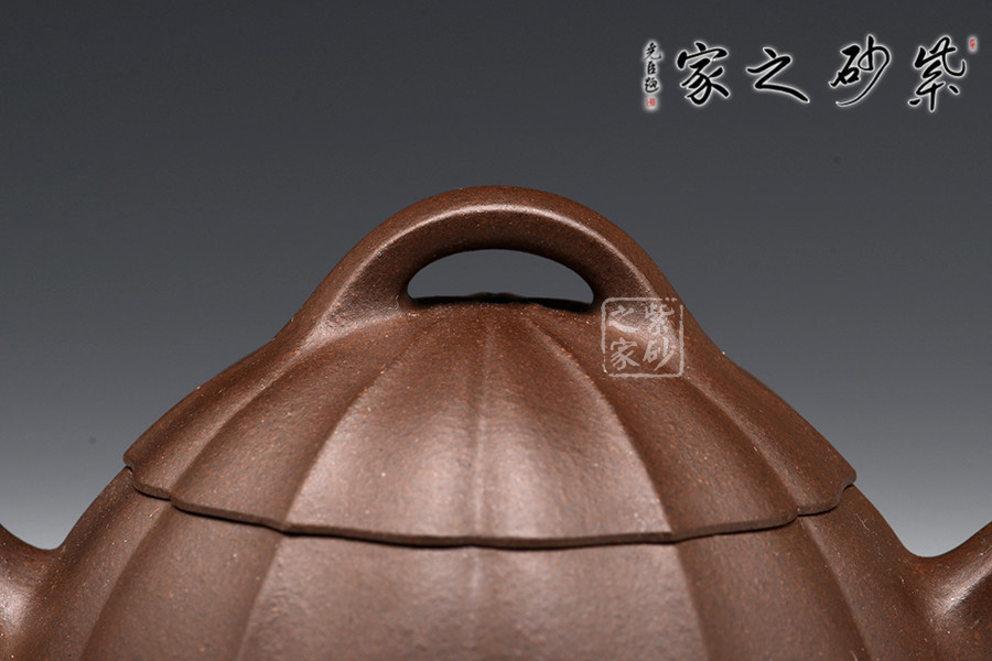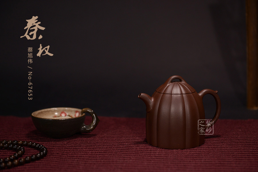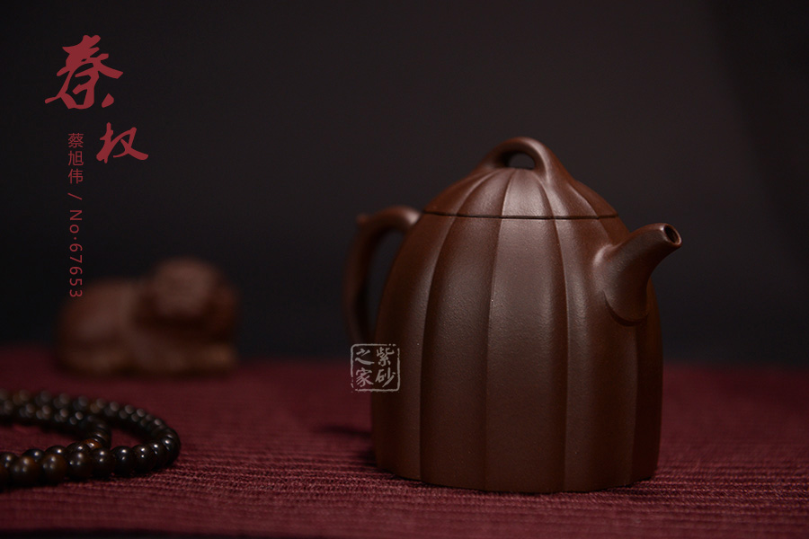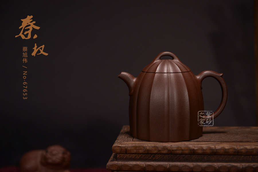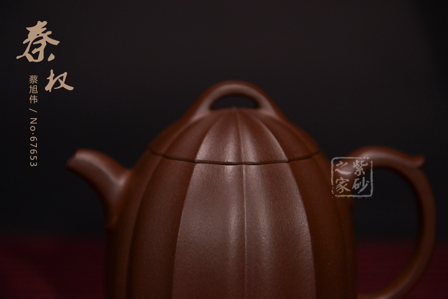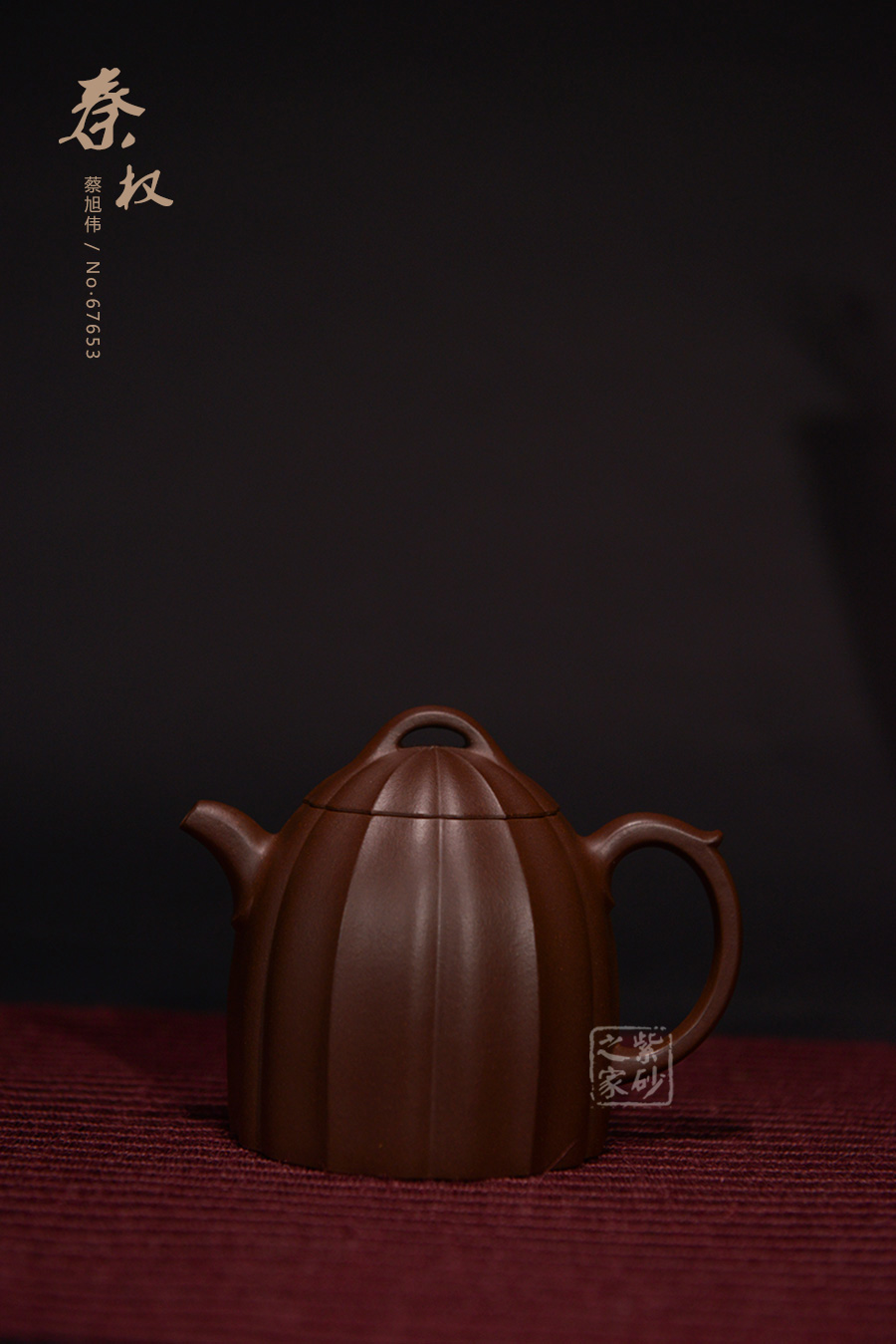作品是在秦權(quán)基本款型的基礎(chǔ)上,結(jié)合筋紋器型制成。以自然的筋紋入壺,由壺蓋至壺身等分均勻,整齊協(xié)調(diào),組成精密嚴(yán)格的結(jié)構(gòu),壺體隨著造型形體的變化而深淺得宣,紋理清楚,具有強烈的節(jié)奏韻律美。