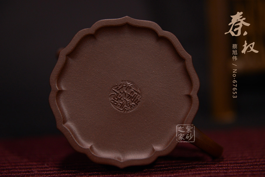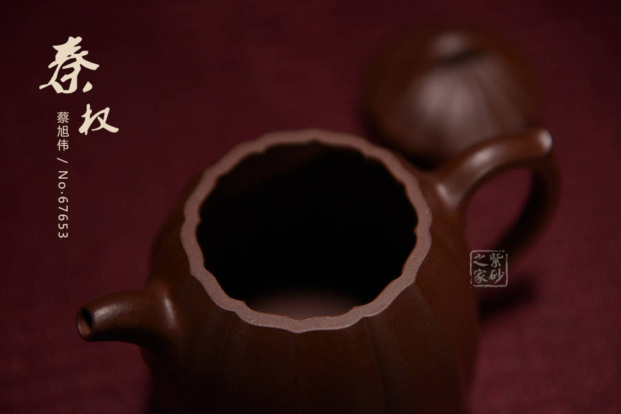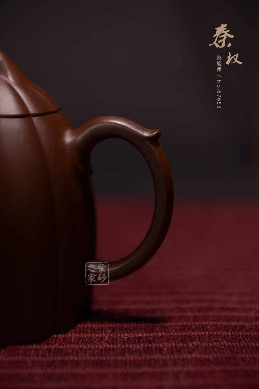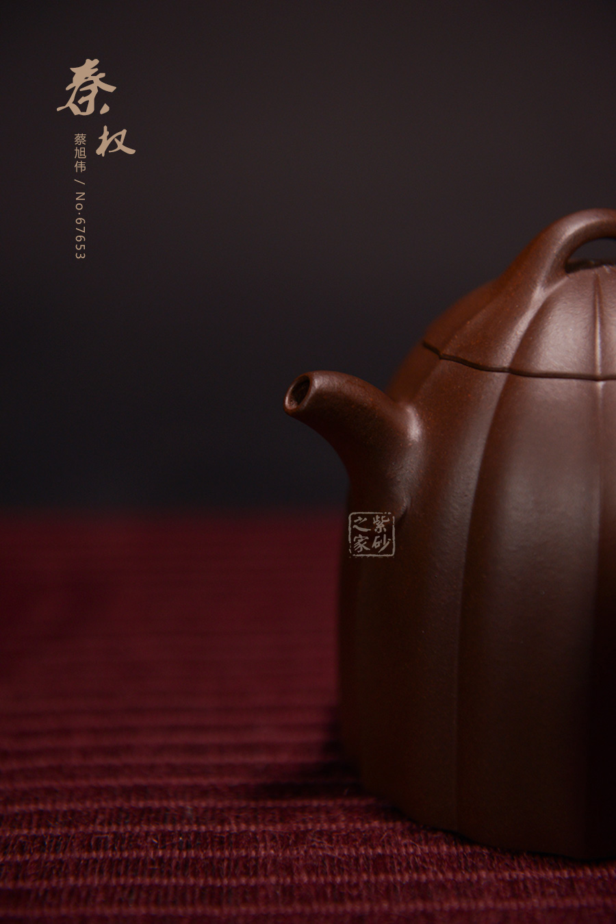 秦權(quán)為壺,壺形似鐘,氣度泰然,剛正不阿,光面古拙中意象萬千,穩(wěn)重沉著。壺身高聳,上部收斂,自然流暢。流向上微,屈力十足,流而有勁。環(huán)耳形把手,不矯不揚。嵌蓋微鼓,沿蓋相合,渾然一體。鈕似橋頂,應(yīng)信權(quán)之系耳。秦權(quán)款,有王者風(fēng)范,猶如六合在握,穩(wěn)守金湯,實乃壺之王者。
