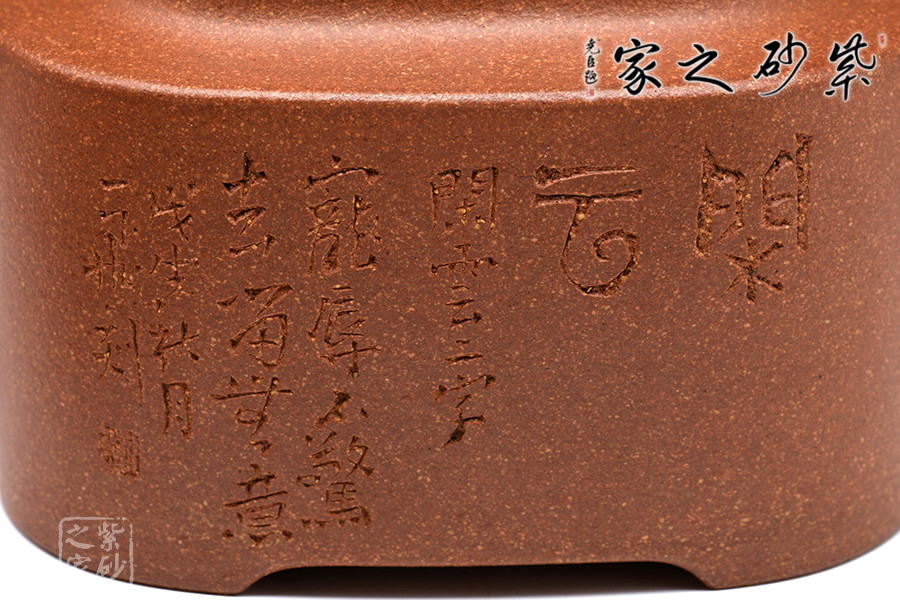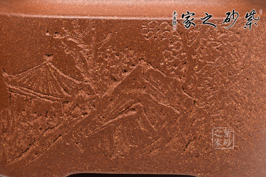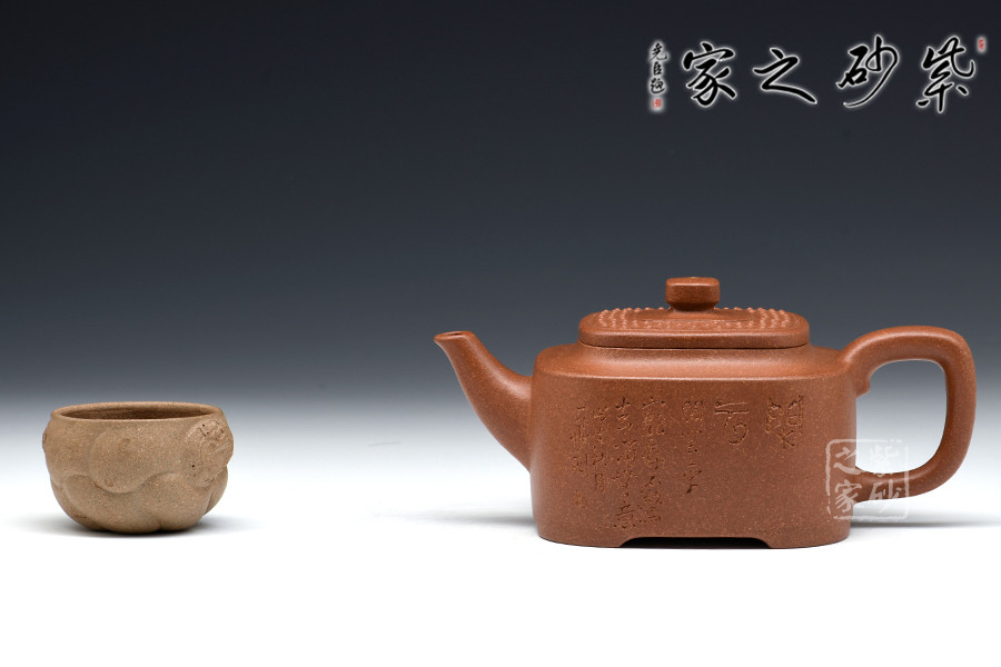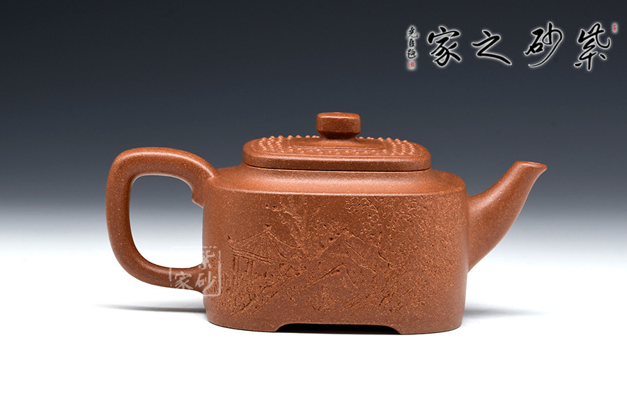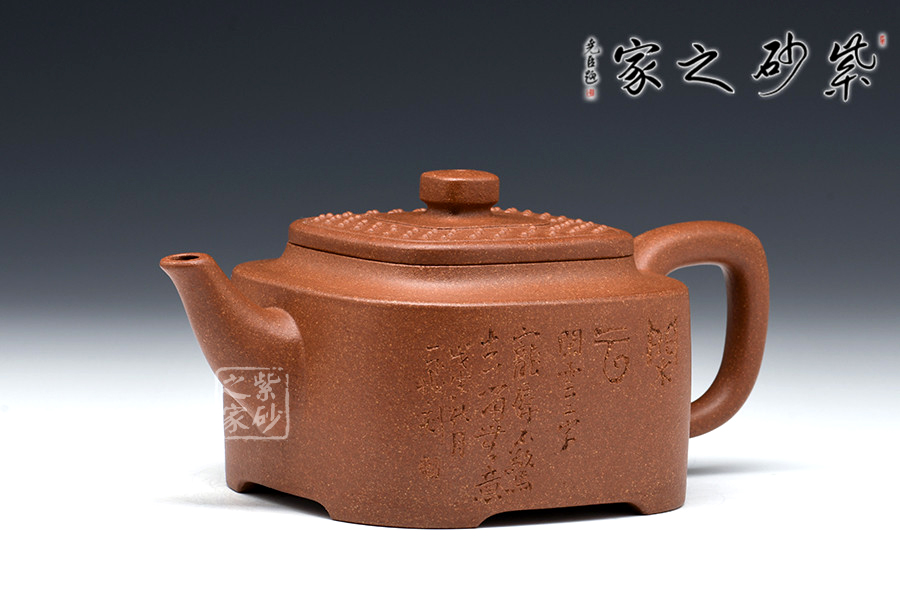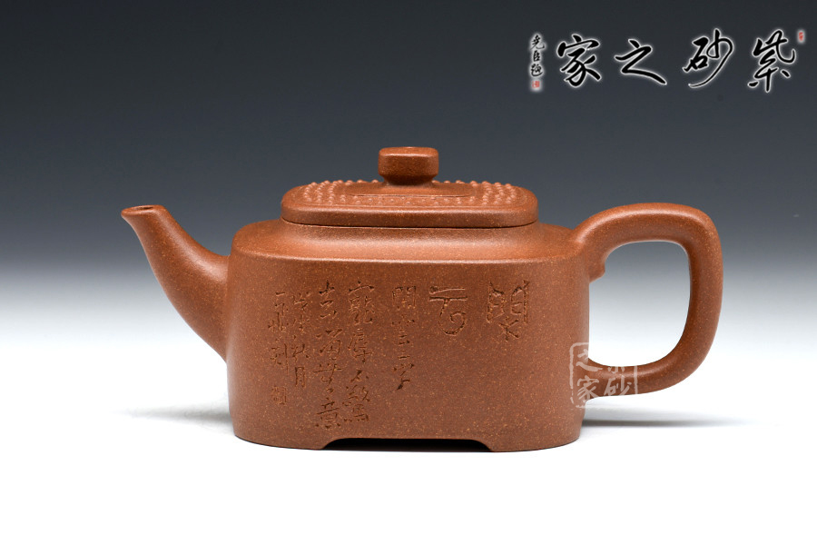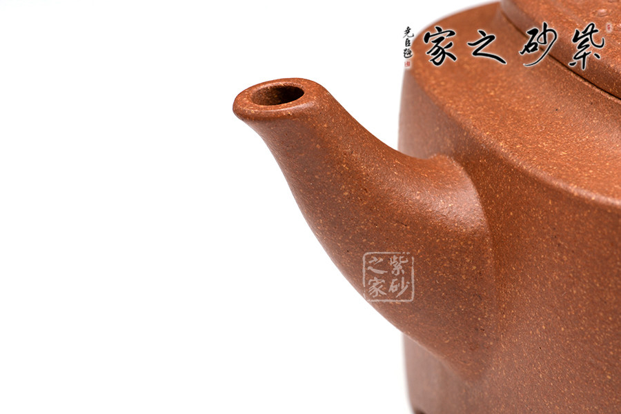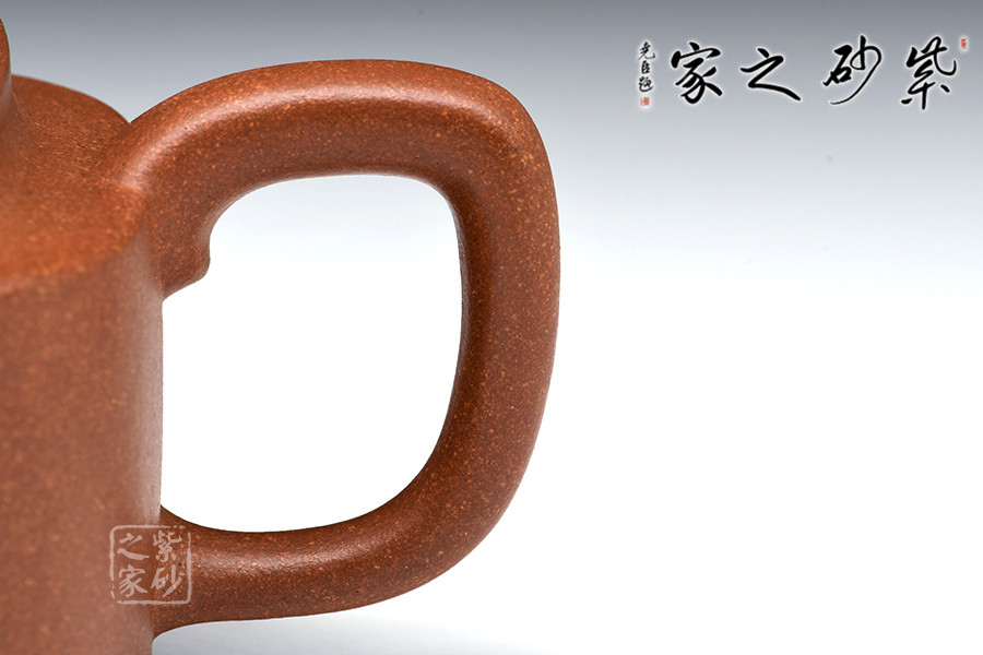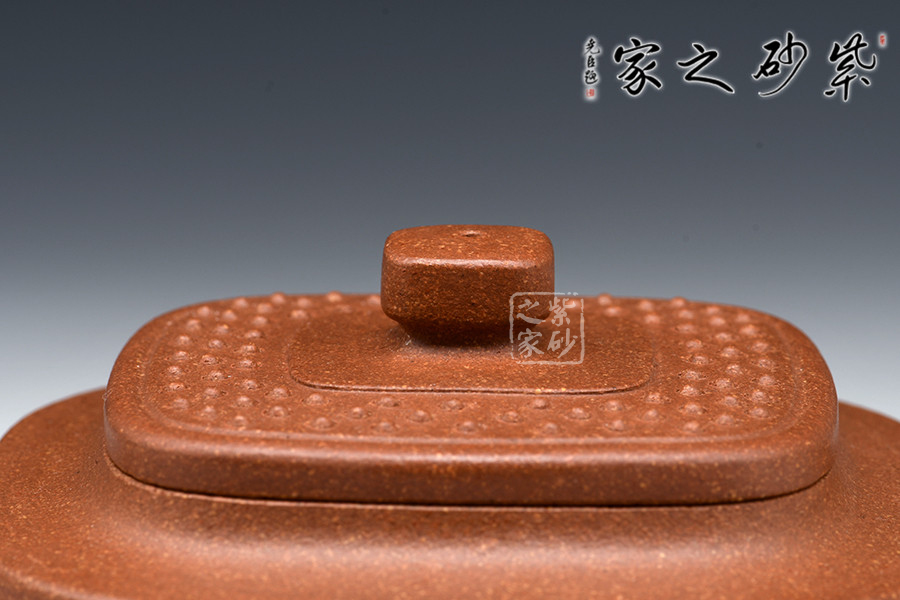 此壺構(gòu)思巧妙,制作精良,壺身端莊大氣、方中見圓;壺蓋嚴(yán)絲合縫,四方壺鈕頗具新意,與壺身四方呈呼應(yīng)之妙;壺嘴舒出自然,比例適度;壺把方中圓滑,彎曲有度。