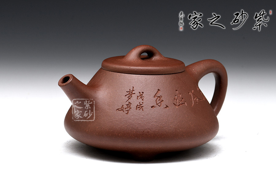 該壺繼承了傳統(tǒng)的子冶石瓢壺精粹,整個(gè)壺身呈“金字塔”形,周身皆以圓弧線條構(gòu)成,豐潤(rùn)飽滿,由于重心下垂使用很穩(wěn)當(dāng),更具有極大的觀賞性。底部三圓足立起全身,使壺顯得挺括有神,展露出一種大氣風(fēng)范。