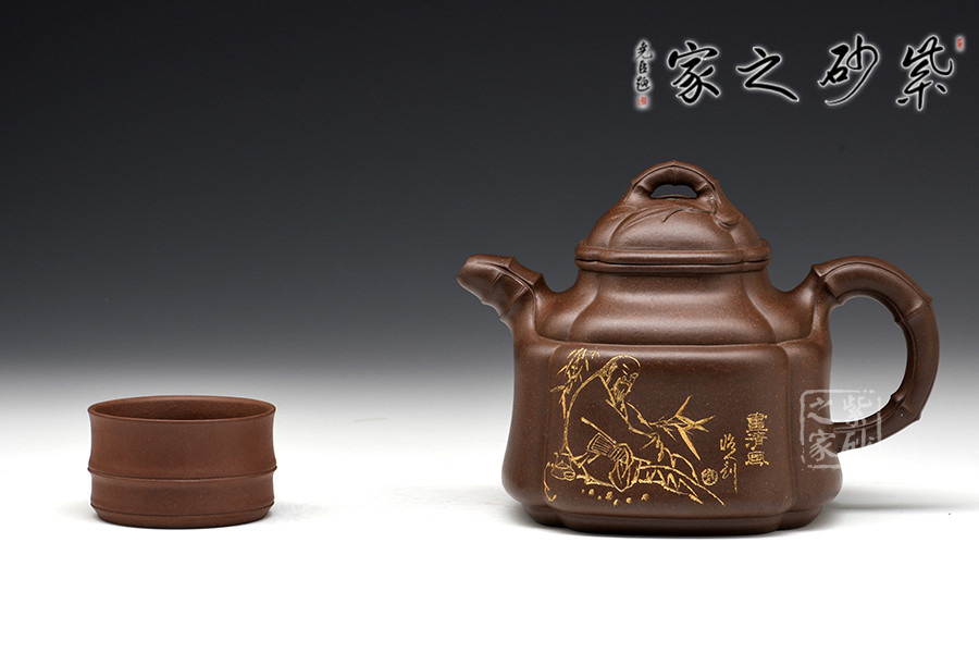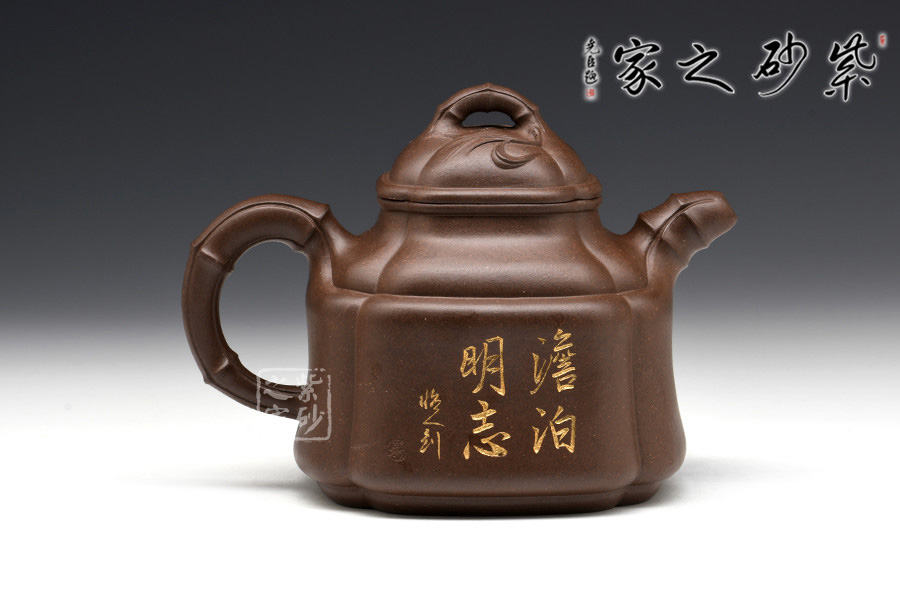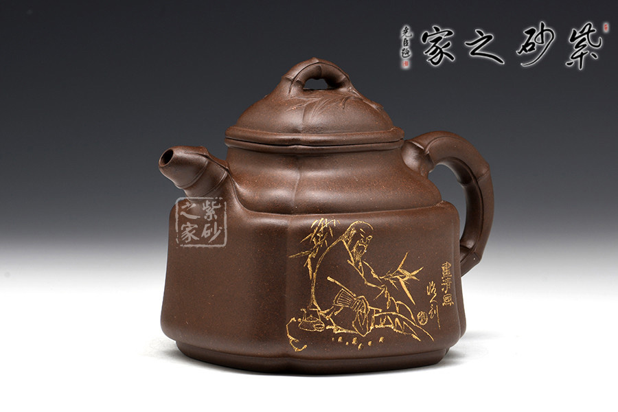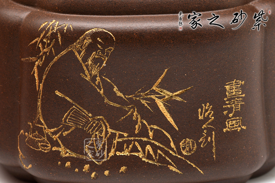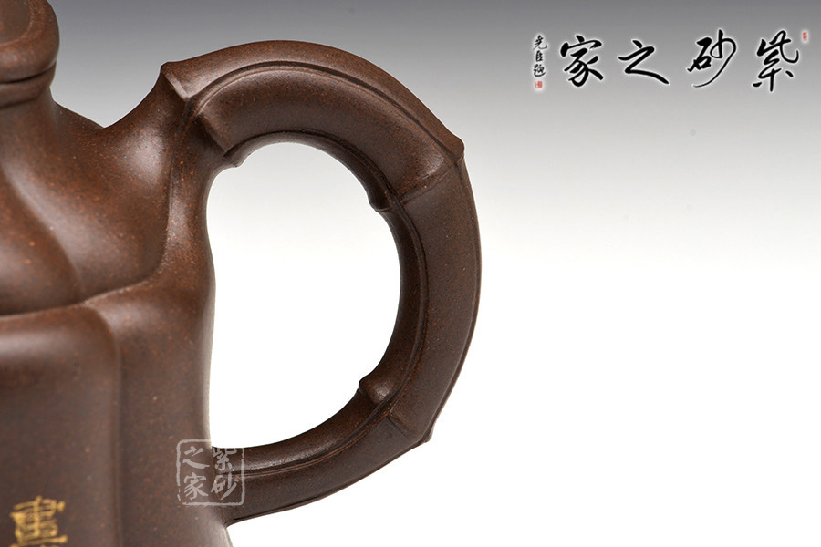 整器以竹為題材,以物抒情,頌竹之品格,贊竹之勁節(jié)。流、紐、把皆塑成竹節(jié)狀,自紐延展出一枝竹葉裝飾壺蓋,蓋與壺身皆作四方隱角,壺身刻繪均以描金裝飾,全器比例均勻,俊秀大方。