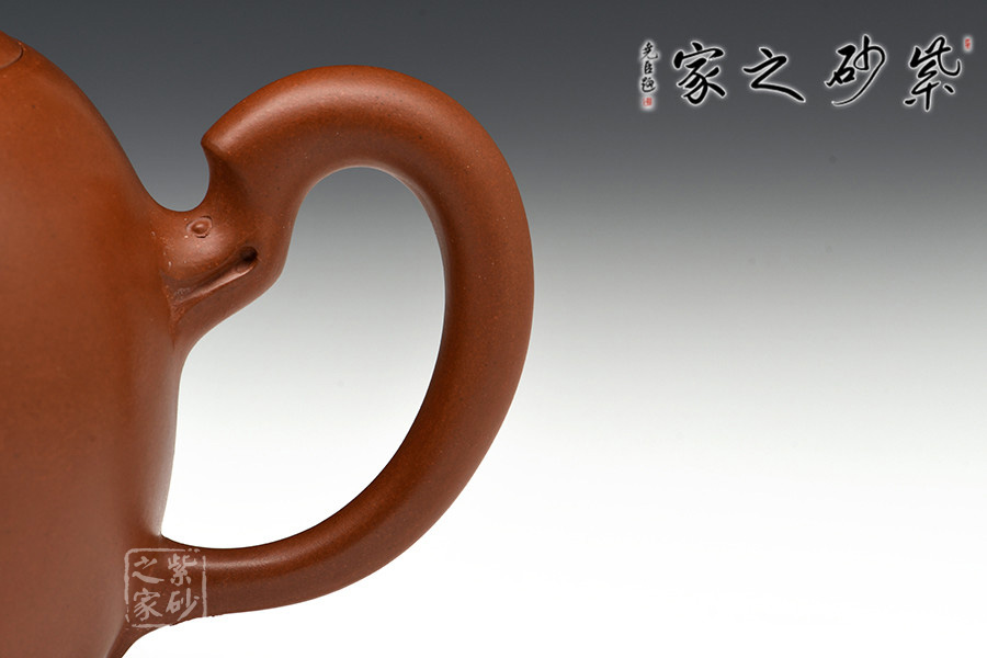 整個(gè)壺身與壺蓋結(jié)合為橢圓體,狀似蛋形,殊為可愛(ài),壺身以橢圓線構(gòu)成基本輪廓,造型單純流暢,粗獷敦厚,耳把大而垂,似玉龍狀,使全器平添一種拙味和稚氣,整體感強(qiáng)。