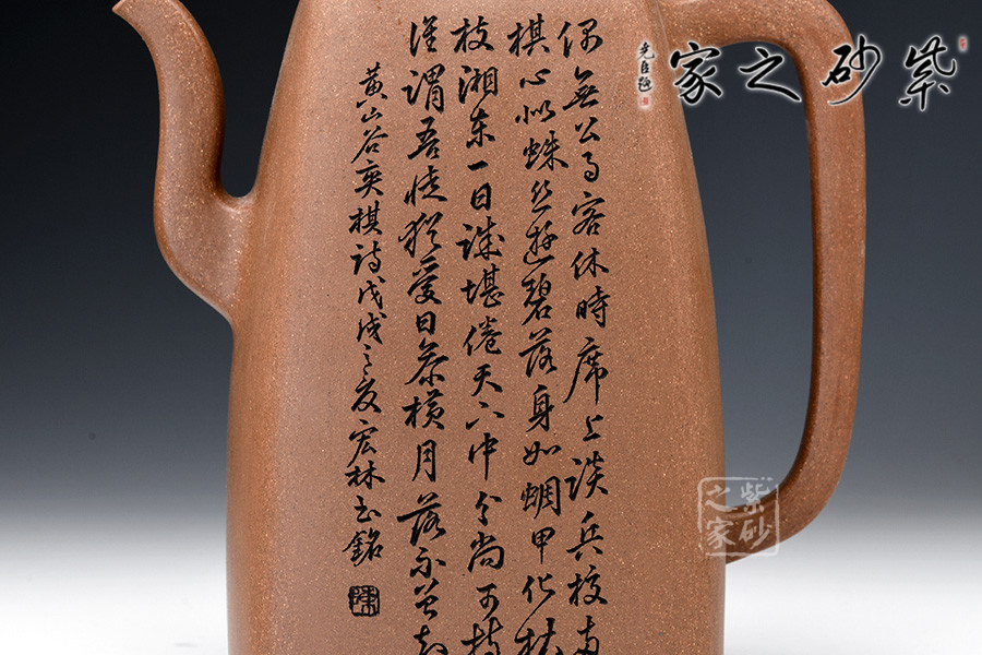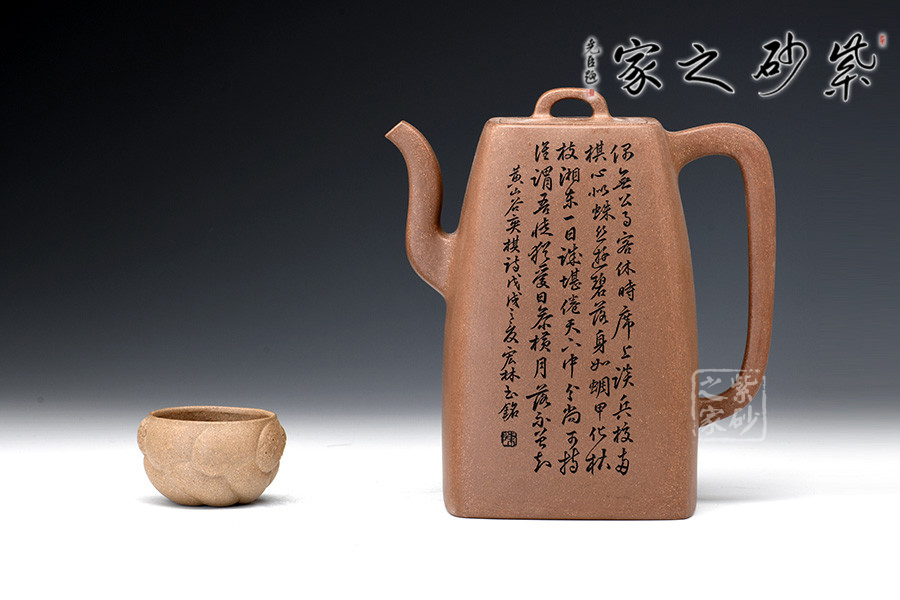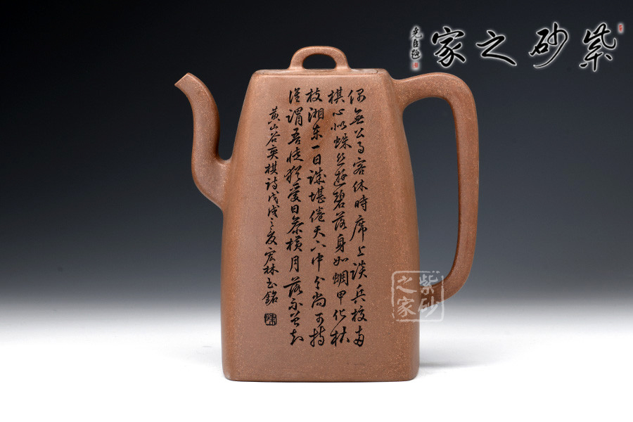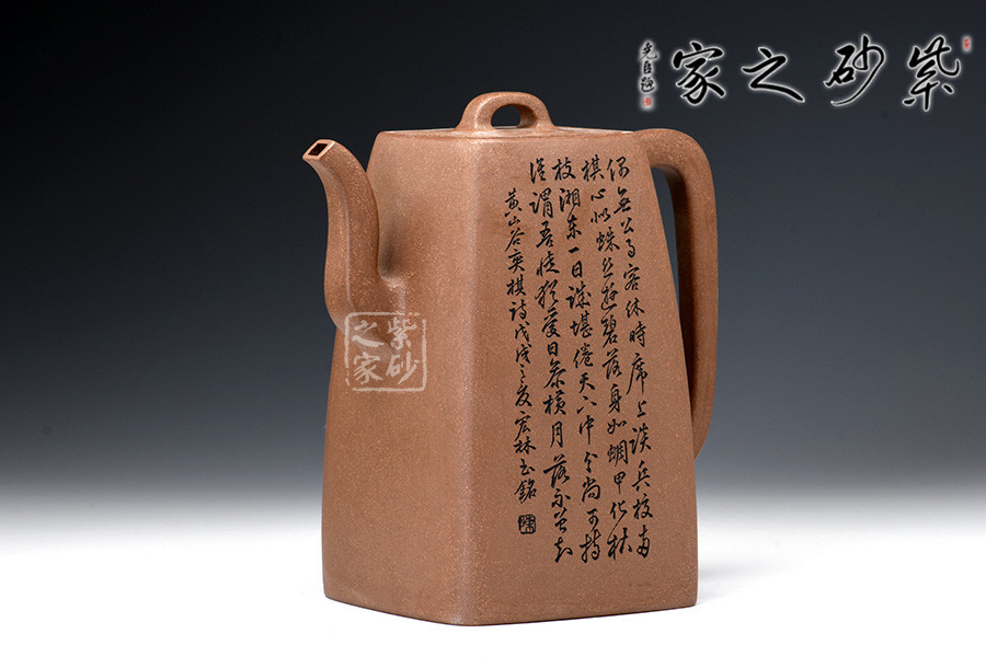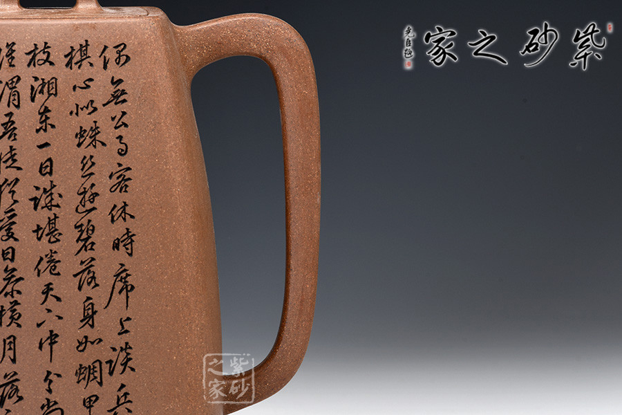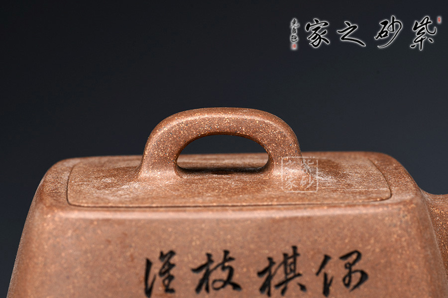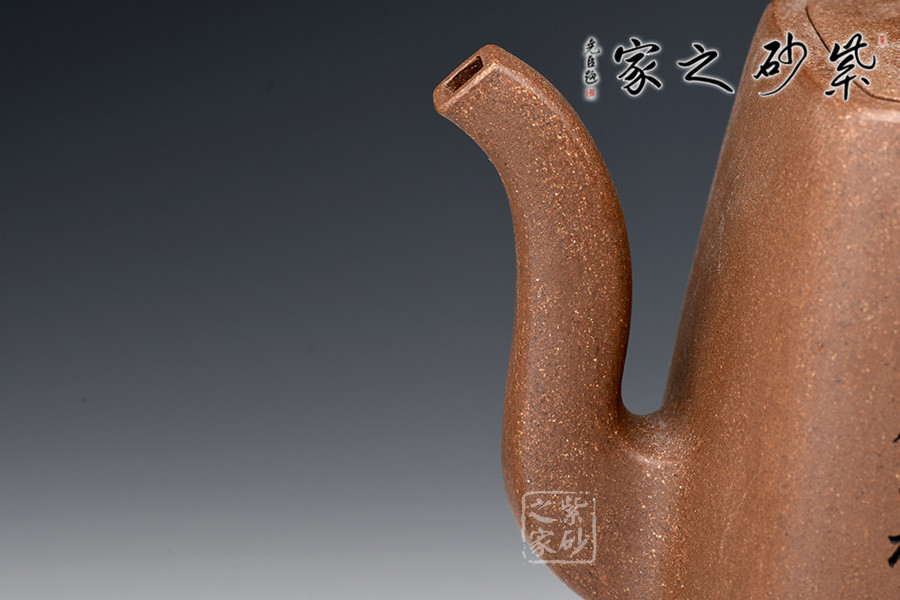 原礦段泥手工制作,色澤明亮,鮮明淡雅。壺身四方,上斂下豐,棱線明朗,折轉(zhuǎn)分明。壺嘴三彎,蜿蜒而上,出水不易流延。壺把攏長,從壺肩直至底端,極為個性。橋形鈕,嵌蓋設(shè)計,融合一體,技藝不俗。壺身高挑,線條細(xì)膩幽長。以此壺沖茗,可留香不散。