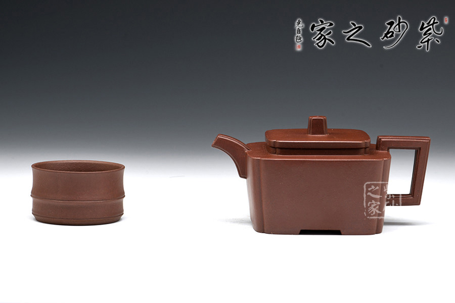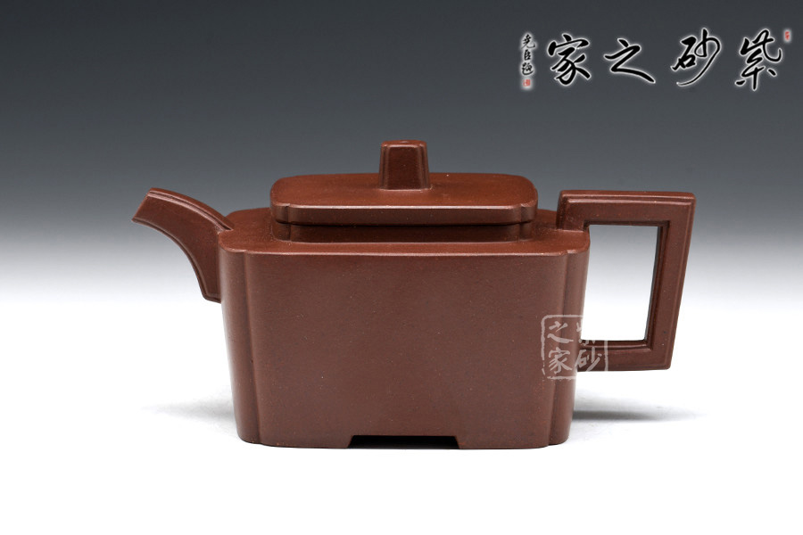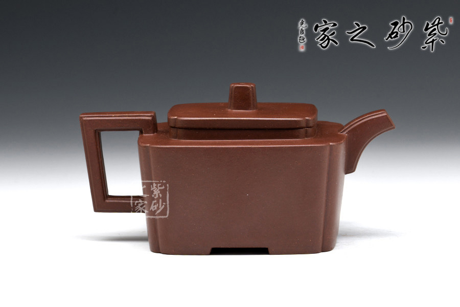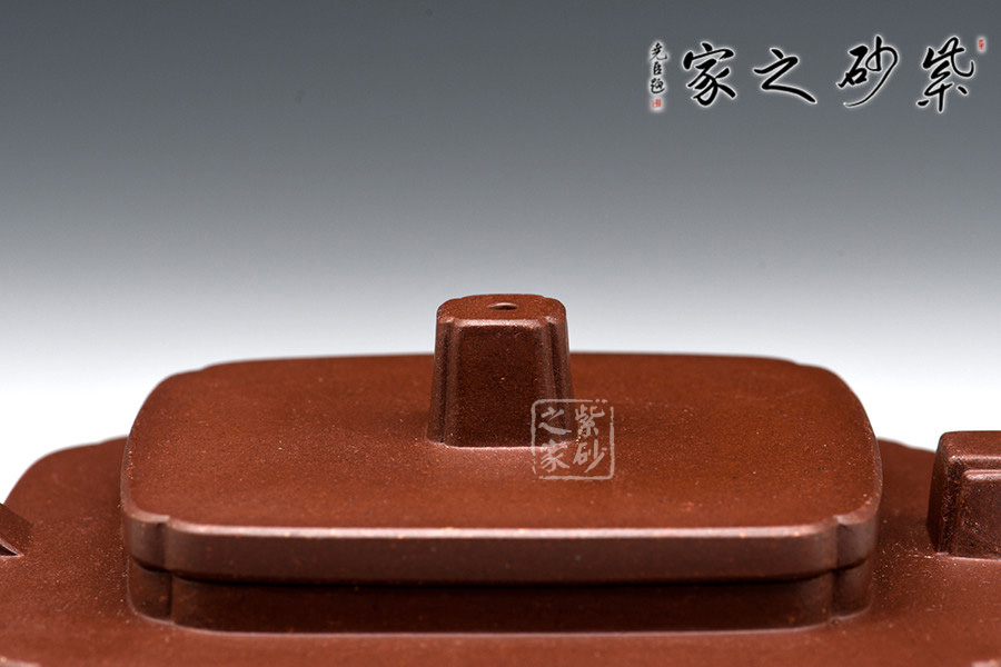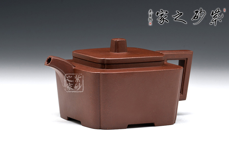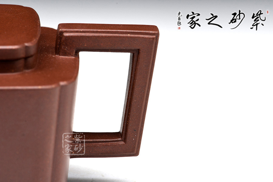 此壺身、蓋、流、把與足之四角外皆作凹筋;身、蓋、足、流并于內(nèi)側(cè)出筋。短彎流之弧形曲線巧妙而流暢,恰到好處,與四方形的壺把成圓與方的對(duì)話(huà);藝匠一絲不茍,精工之極,見(jiàn)之于所有細(xì)節(jié)處。比例權(quán)衡,全面觀照,造型近于完美,簡(jiǎn)約又不失于變化的幾何造型,充滿(mǎn)簡(jiǎn)約素雅之美感。