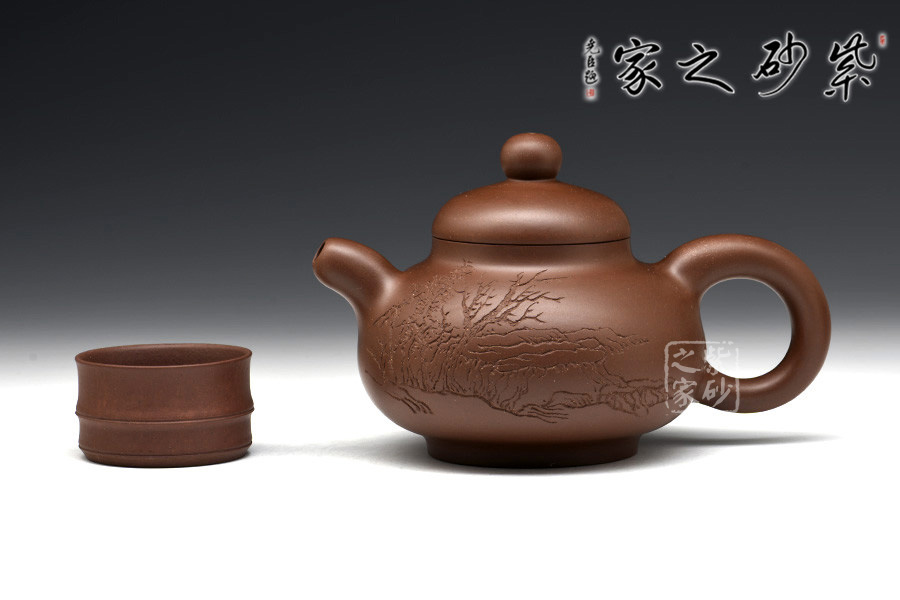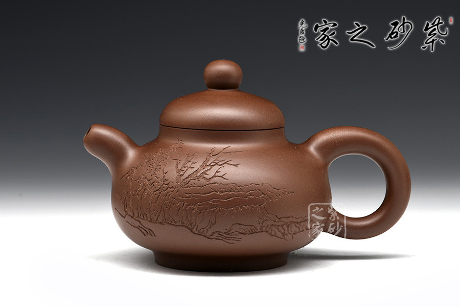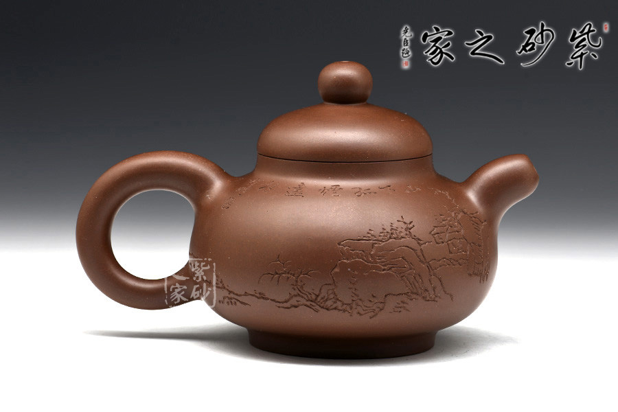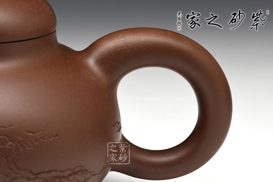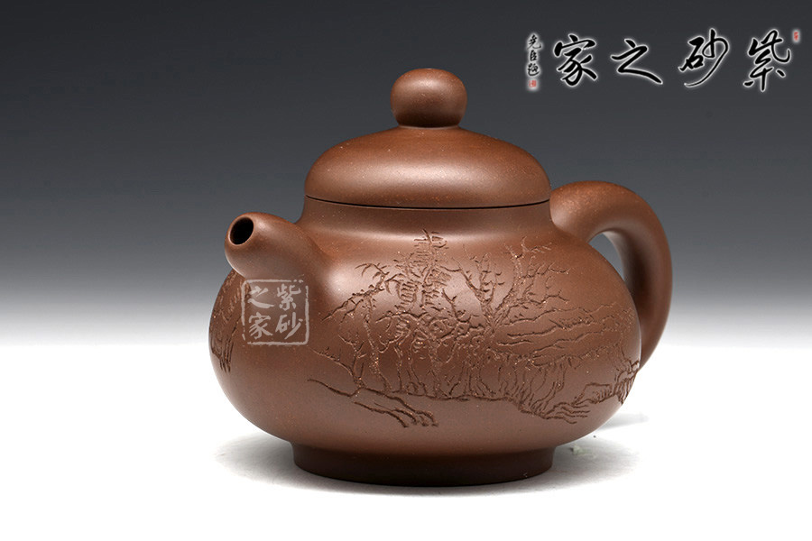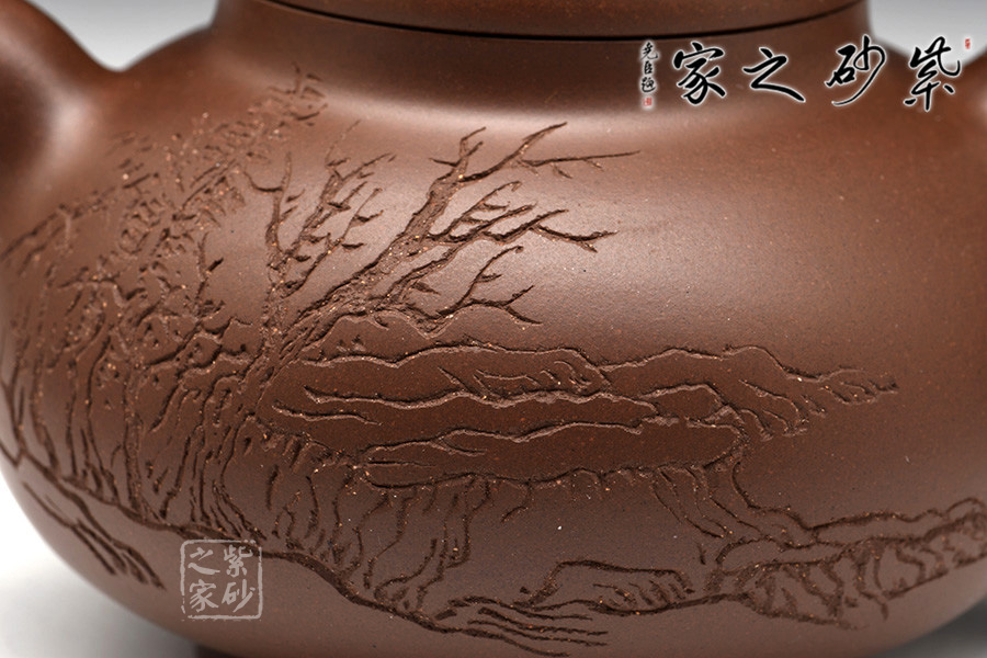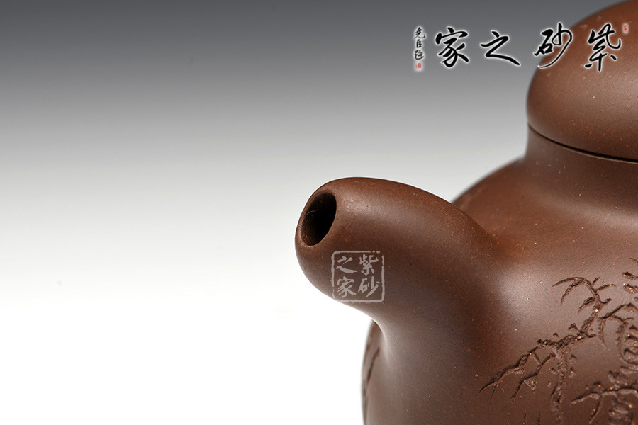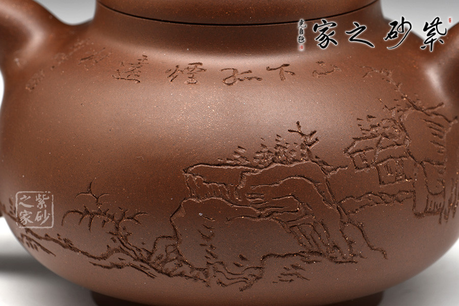 光貨離不開裝飾。俗話說“壺隨字貴,字隨壺傳”:光壺不刻字,就是一把光壺;壺上面刻了大師、名人的字,一把壺的含金量就高了,收藏價值就更高,升值潛力就更大。王福君與中國工藝美術(shù)大師譚泉海合作最多,其次是徐安碧、鮑志強、毛國強(均為中國工藝美術(shù)大師、中國陶瓷藝術(shù)大師)。
