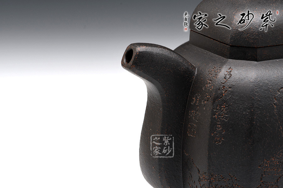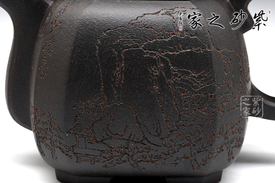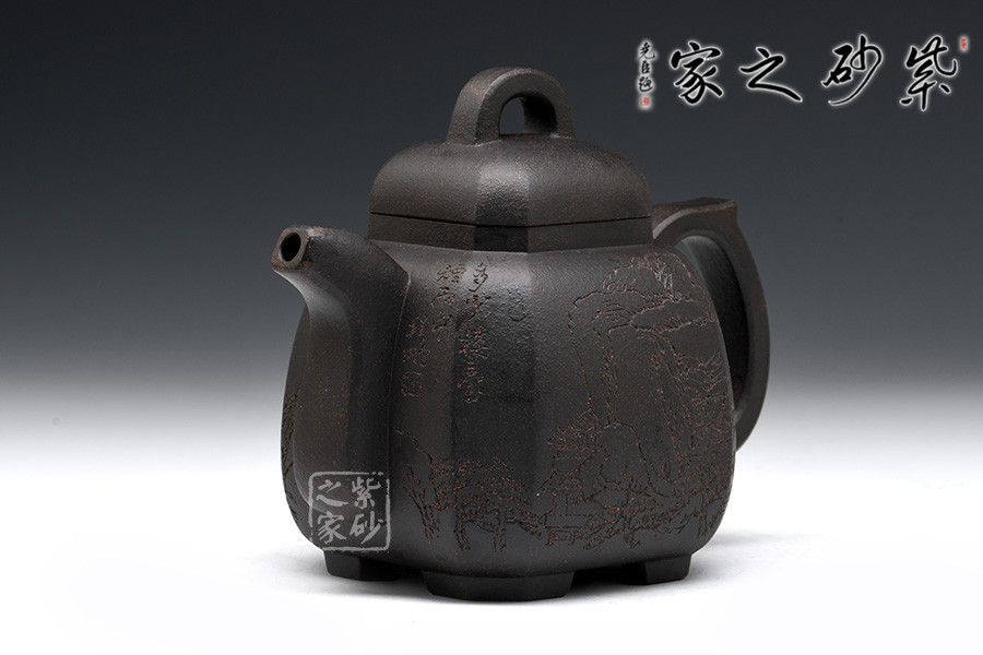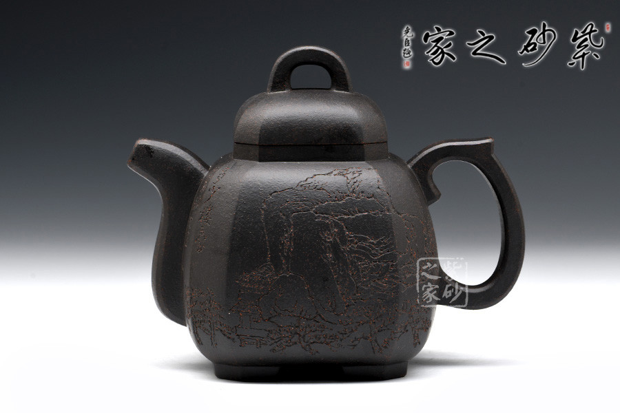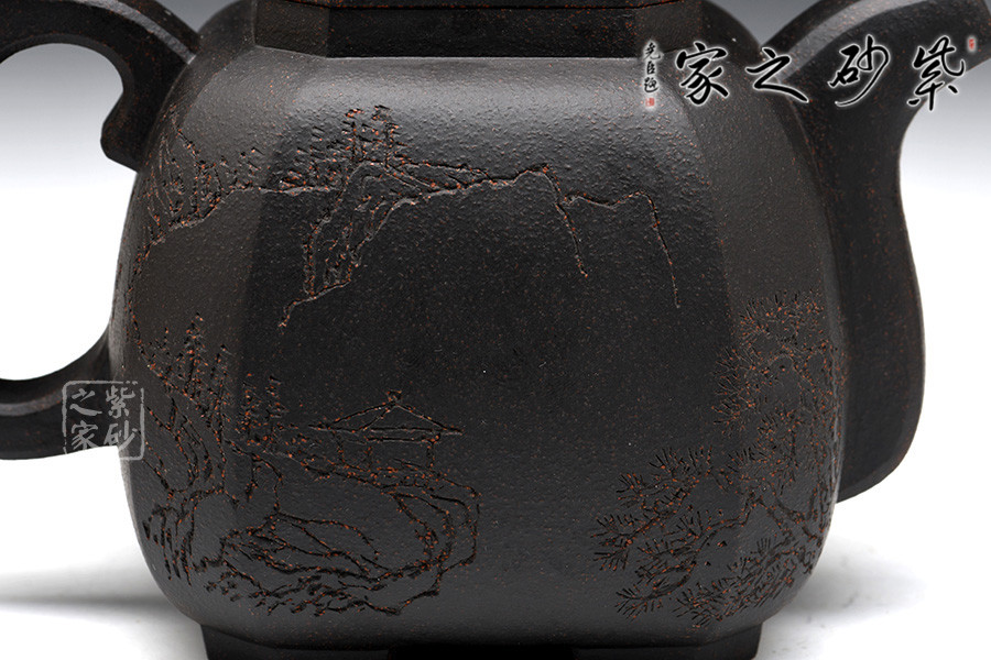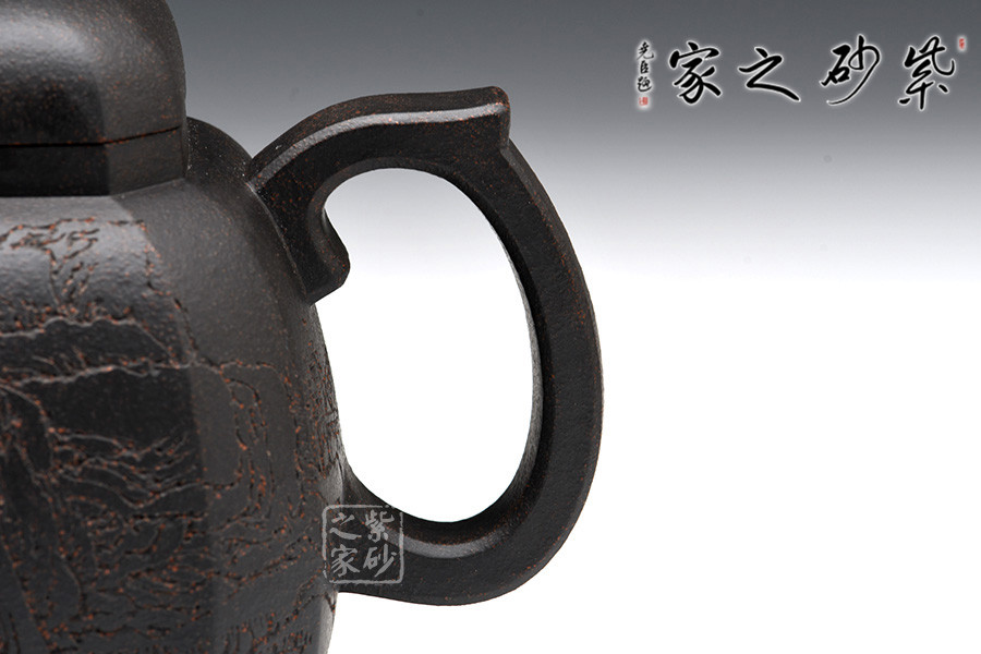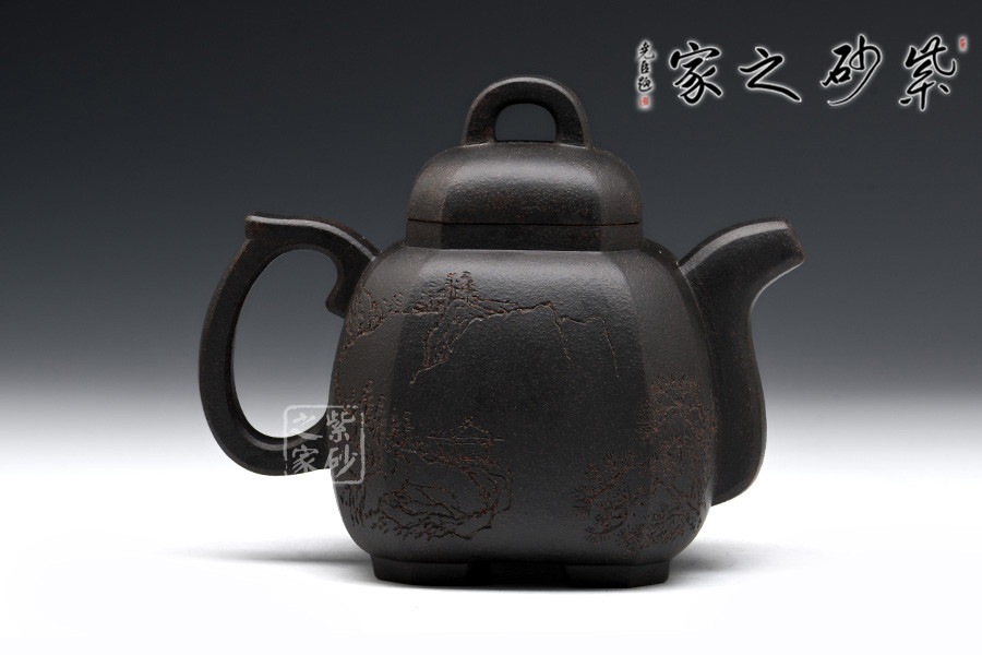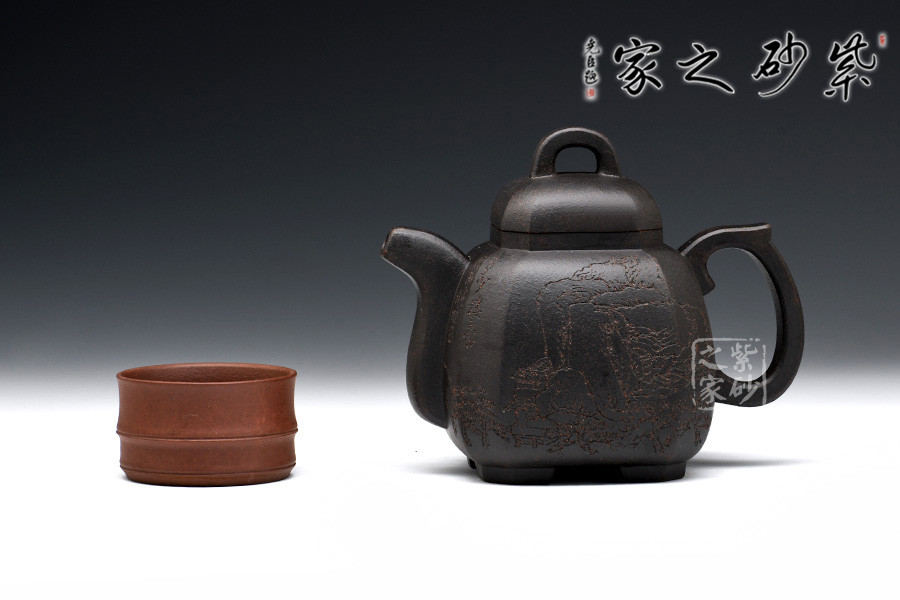 紫砂制作名匠王福君,對泥料選用極為講究,著名書畫家程鵬刻繪,素雅的作品增添一份文人雅趣。家藏極品泥料黑金泥制作,適茶性廣,透出神秘感。