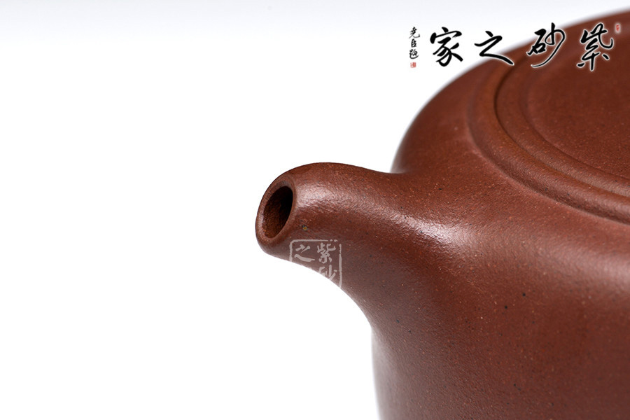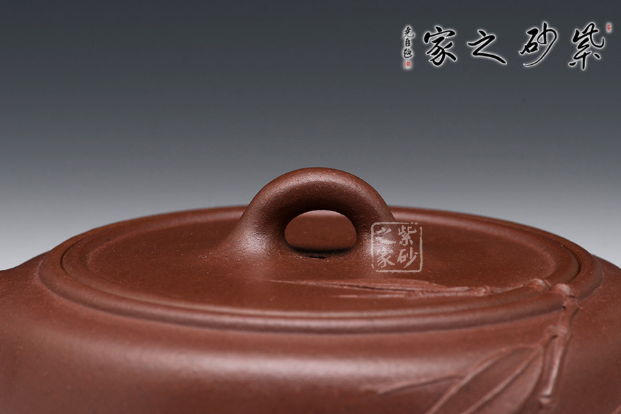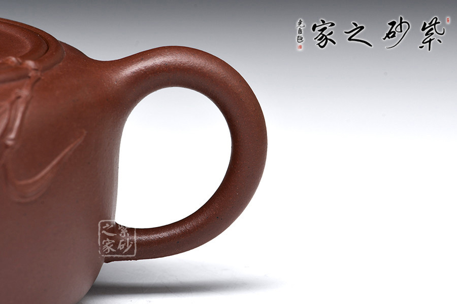 此把潤竹壺壺體以圓為基礎(chǔ),壺身為一個大圓球,略有壓扁,但線條卻因此柔和且富有變化,將圓形的線條演繹得出神入化,真可謂是獨樹一幟;壺蓋采用嵌入式,壺柄也都塑成竹枝之形,又塑造新嫩竹枝自竹枝上長出之態(tài),頗能長人之志氣,此壺細節(jié)刻畫到位,仿生精妙,竹有清谷,以此壺泡茶茶湯必清澤潤喉,甘醇生香。
