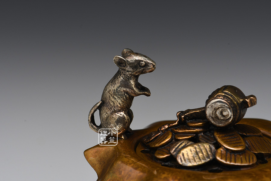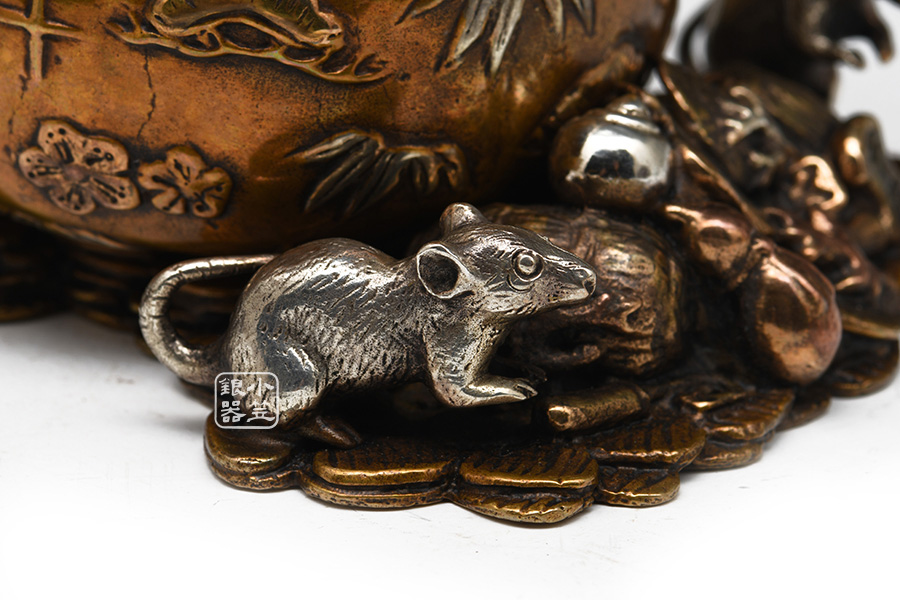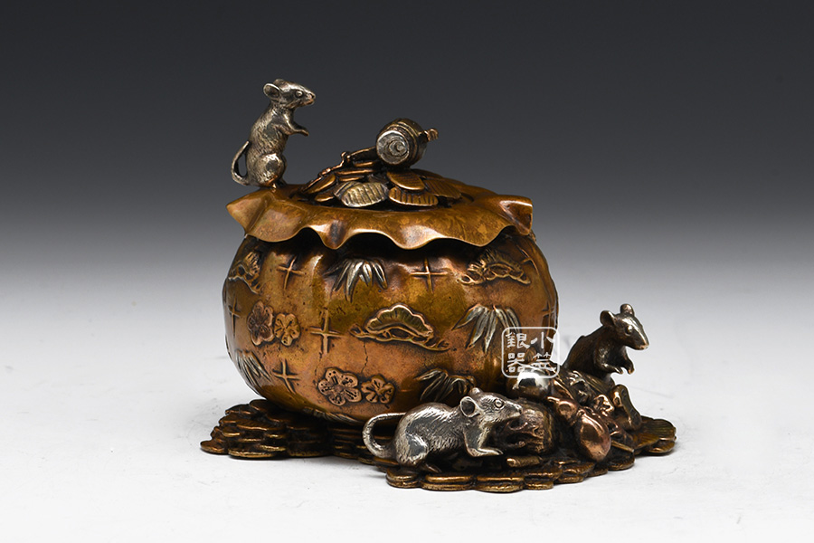 喜泉堂匠心之作,純銅制,精密蠟鑄工藝,金錢鼠主題,爐身似福袋裝,可裝福納福,福袋之上鏨刻梅花、竹與松等圖案,彰顯高雅之器,乃招福旺財(cái)吉兆。鼠刻畫精致巧妙,嬉鬧玩耍傳神生動(dòng),葫蘆諧音“福祿”,同為吉祥之意,整器無論是造型還是做工,均堪稱精工典范。