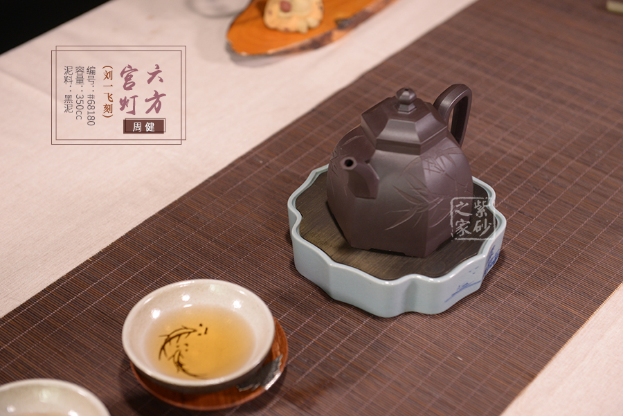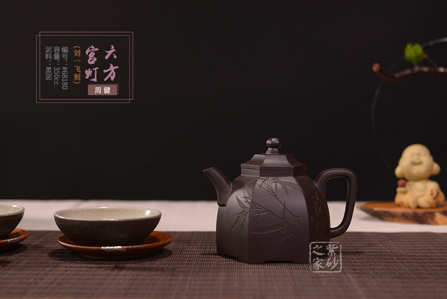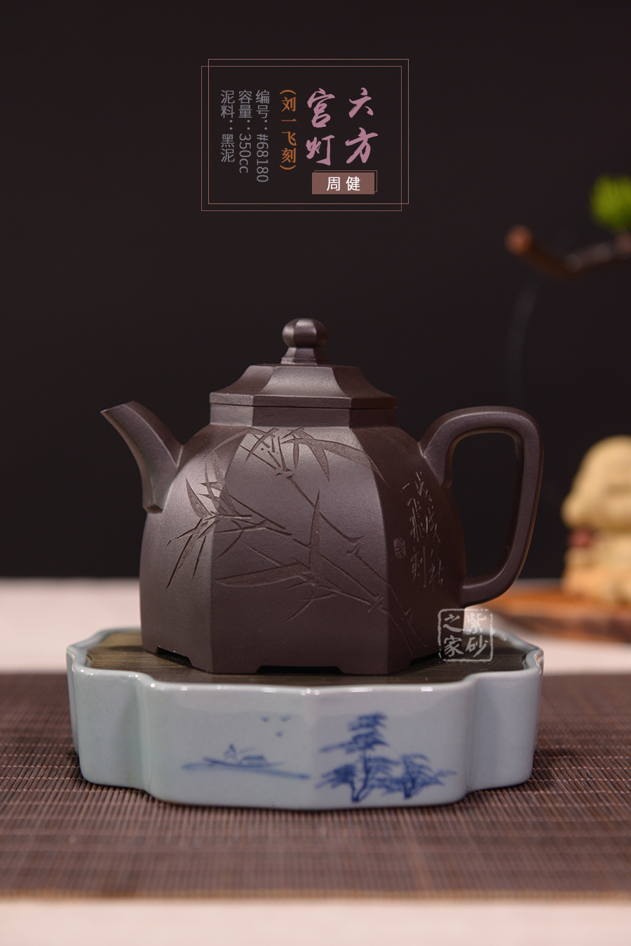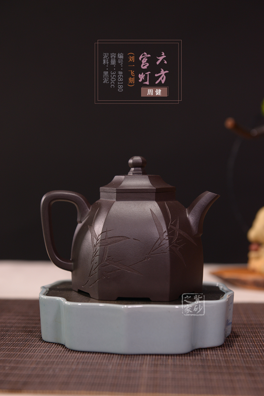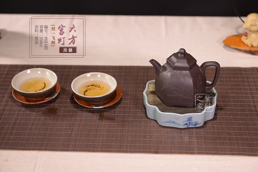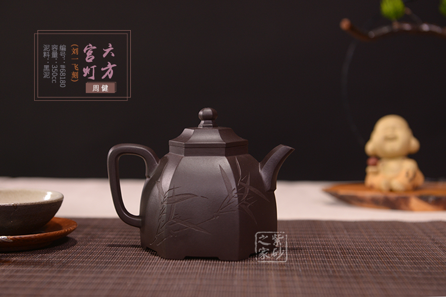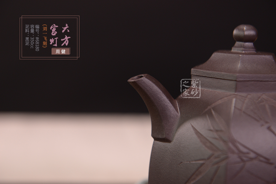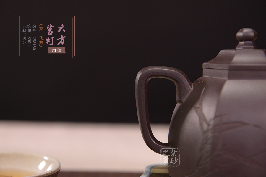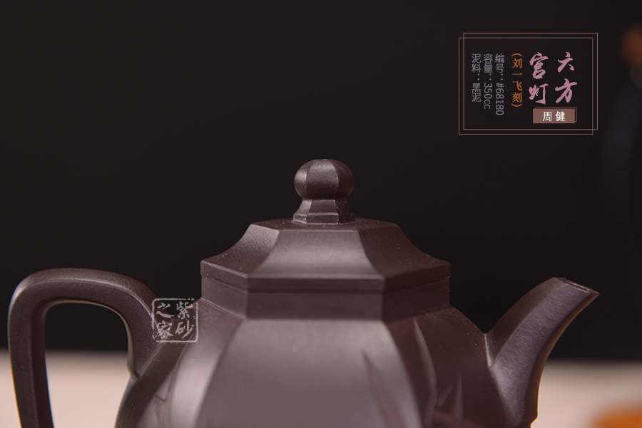 選用古代宮燈為造型,壺鈕、壺蓋、壺嘴、壺身均采用六方造型,古典優(yōu)美,氣韻高雅。六方壺鈕方中見圓,溜肩造型極其優(yōu)美,增添了壺的藝術(shù)感,雅致非常。