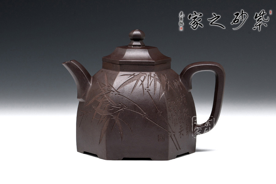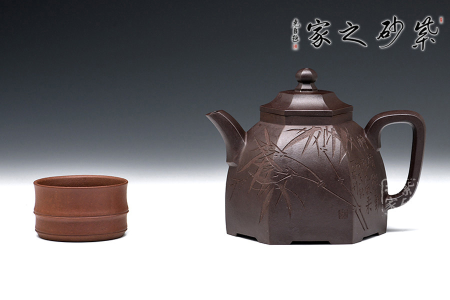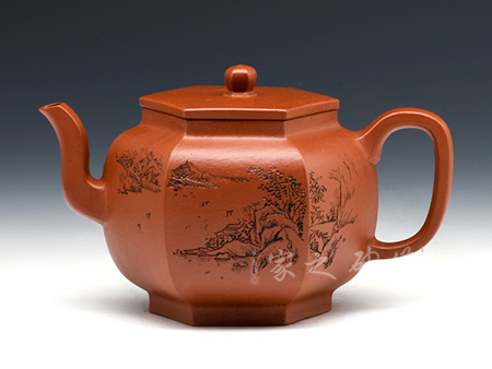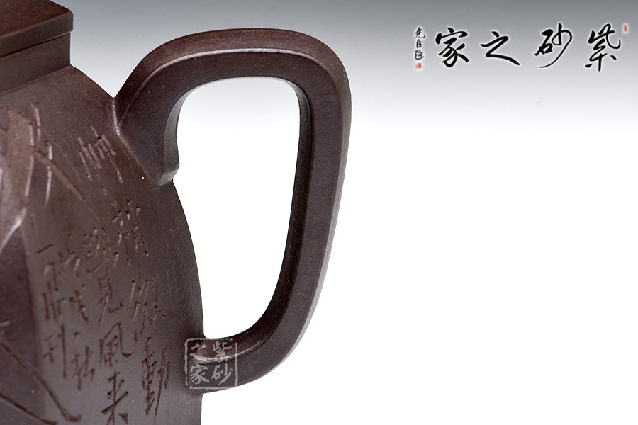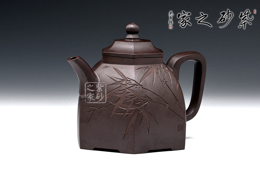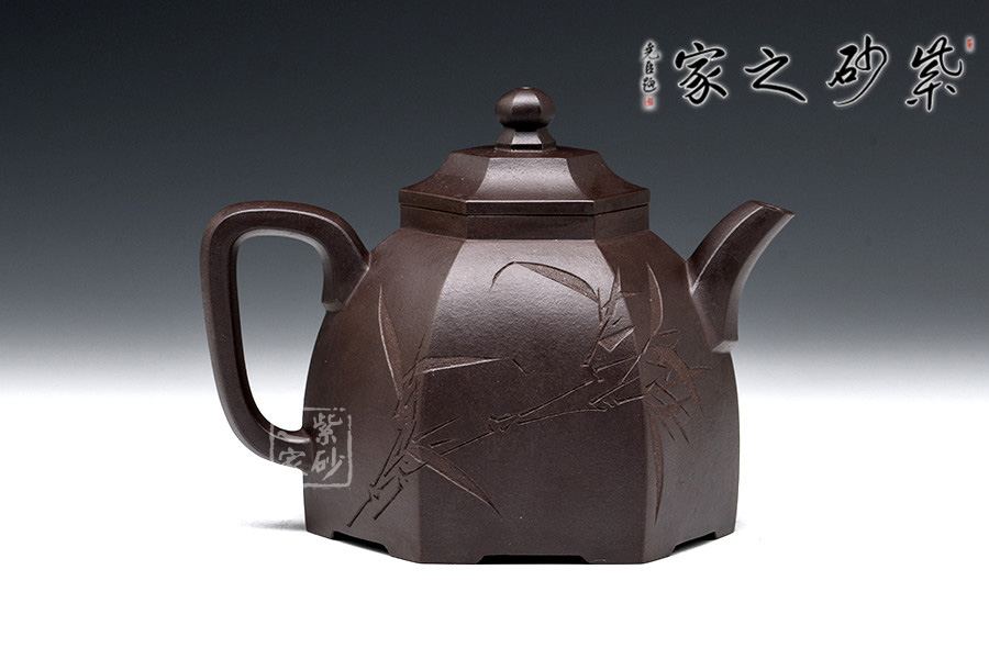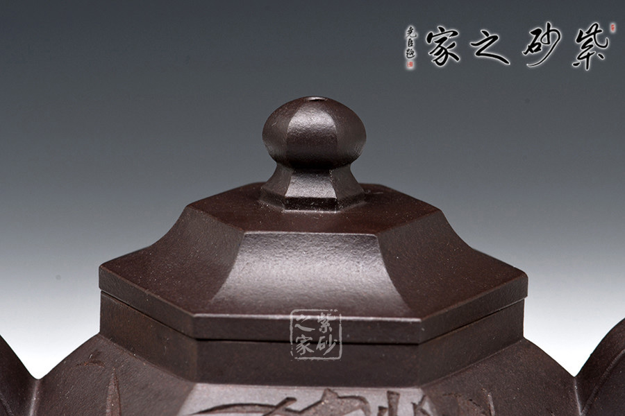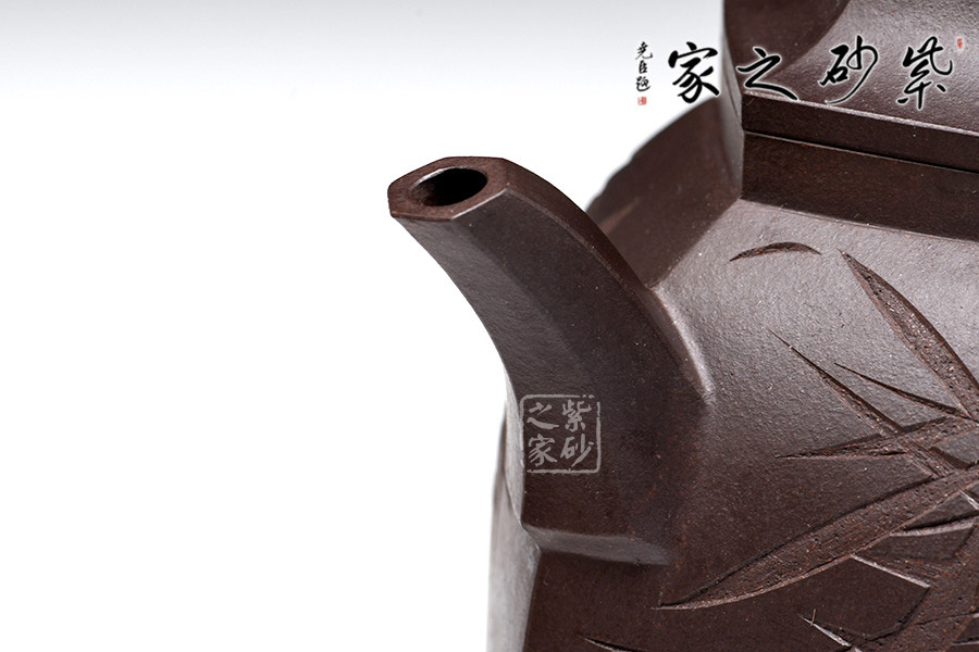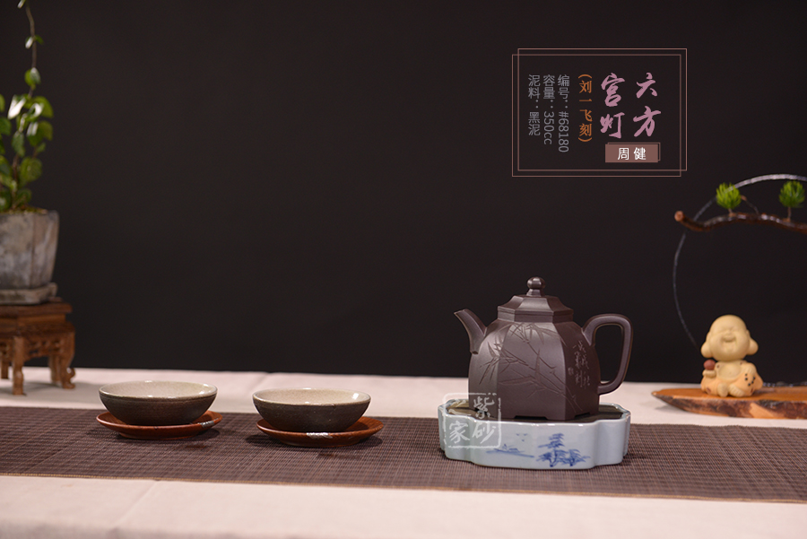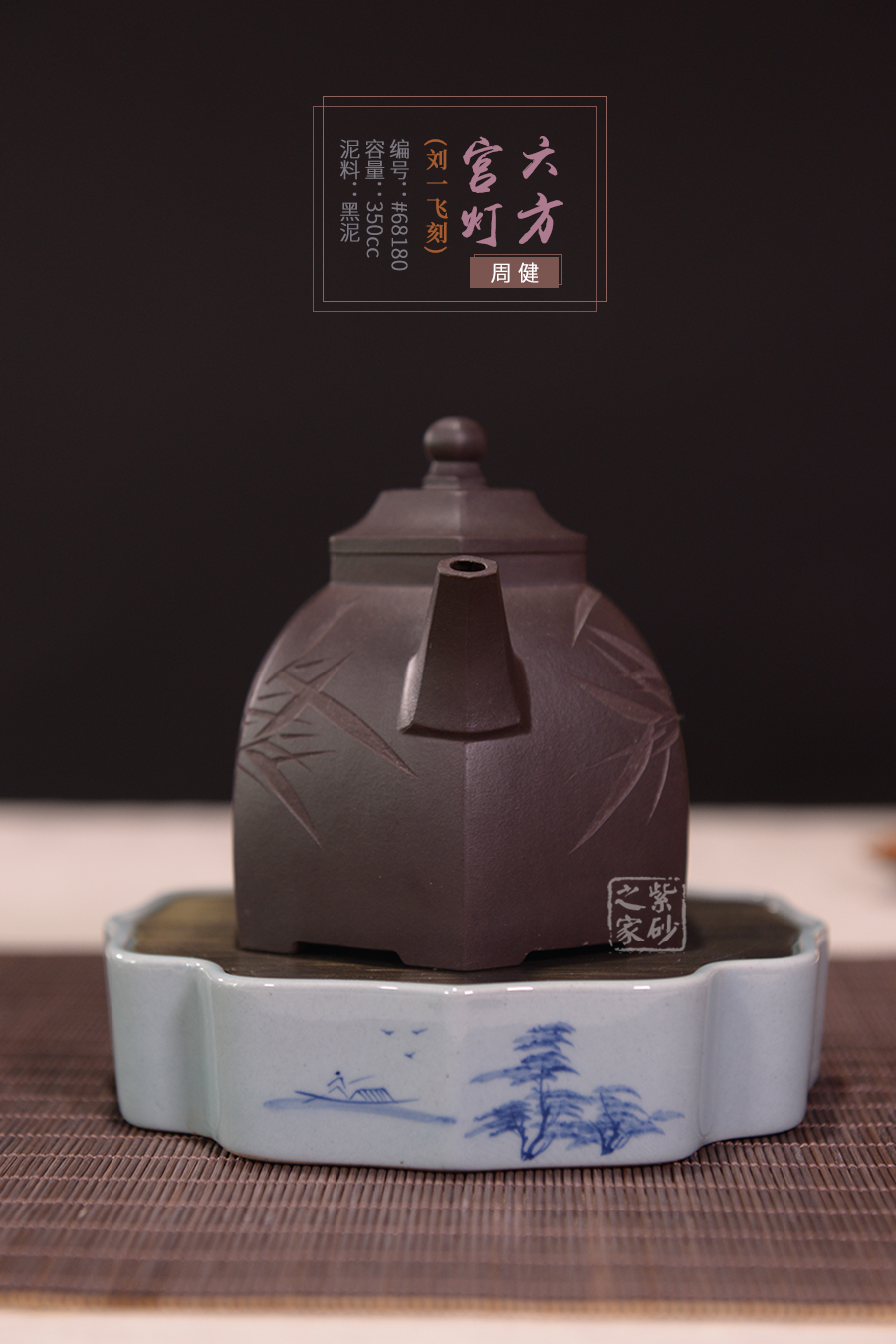 選用古代宮燈為造型,壺鈕、壺蓋、壺嘴、壺身均采用六方造型,古典優(yōu)美,氣韻高雅。六方壺鈕方中見圓,溜肩造型極其優(yōu)美,增添了壺的藝術(shù)感,雅致非常。