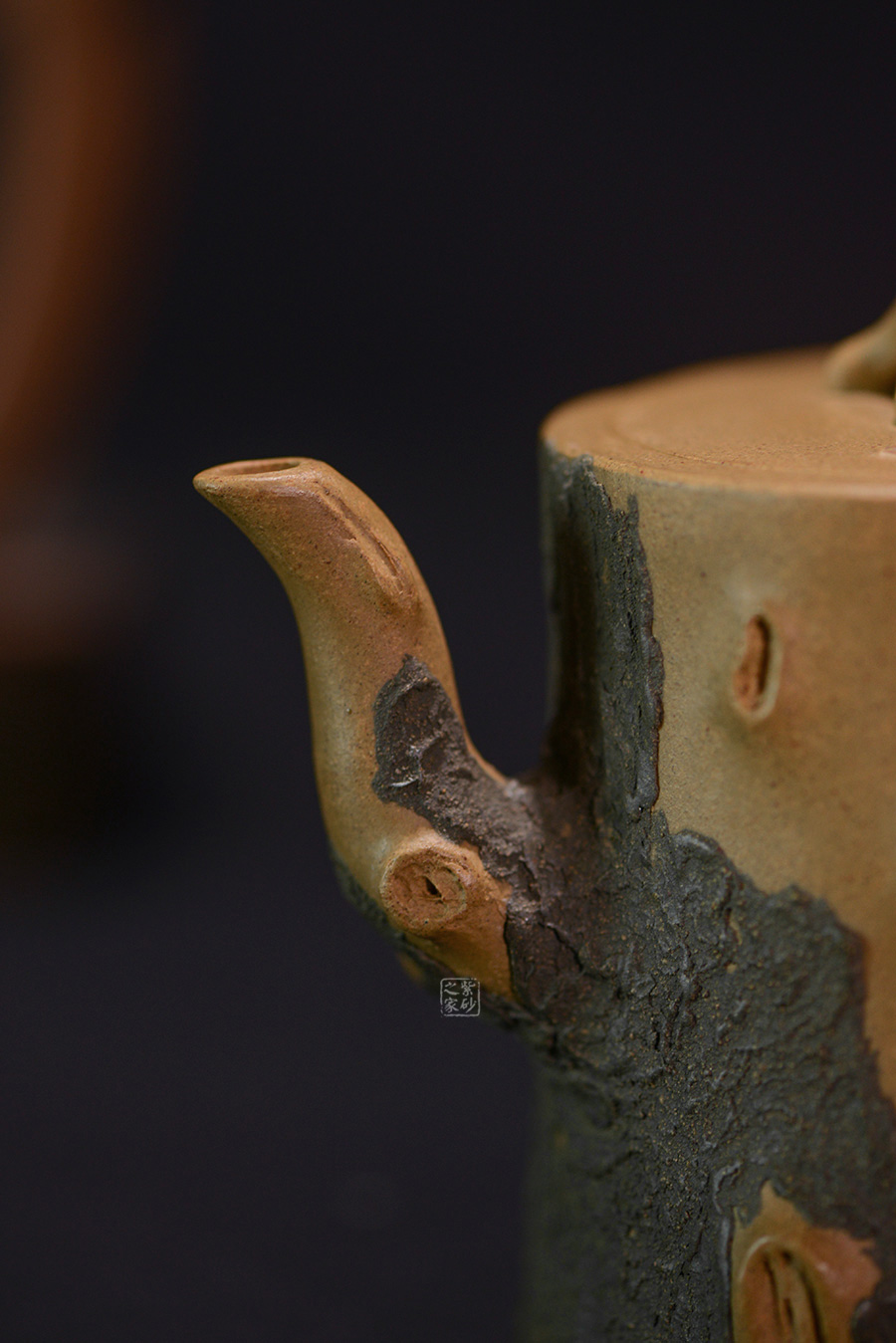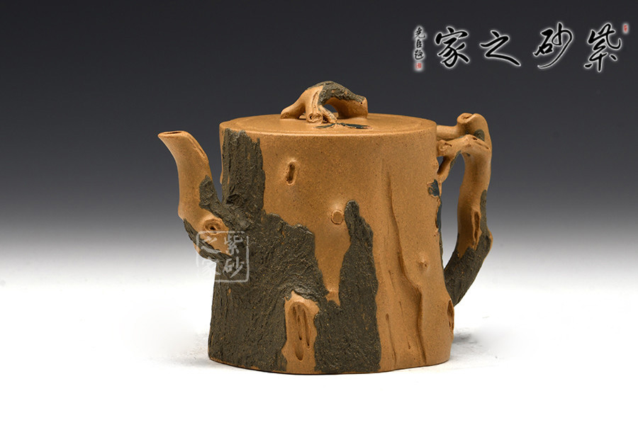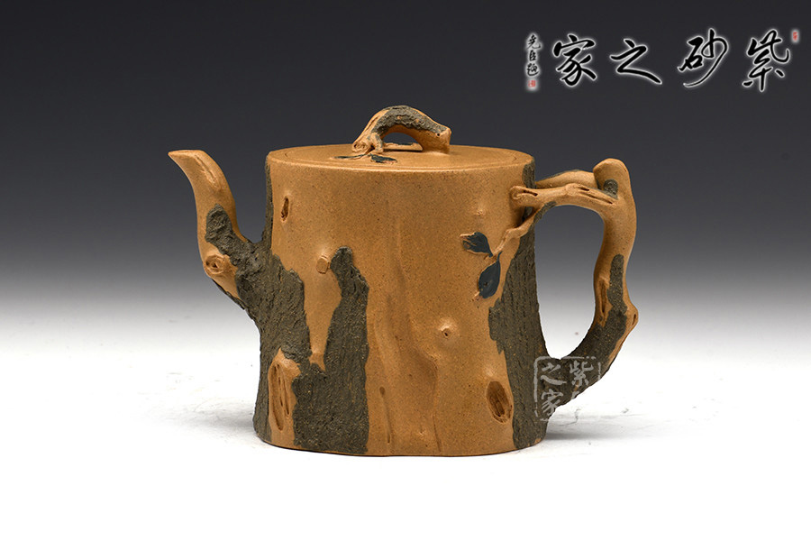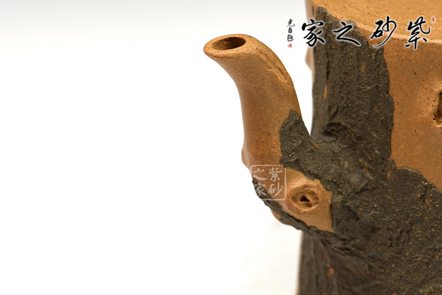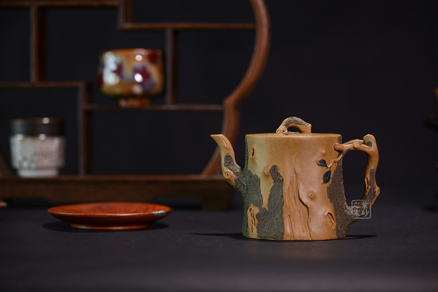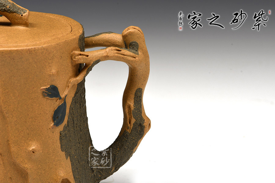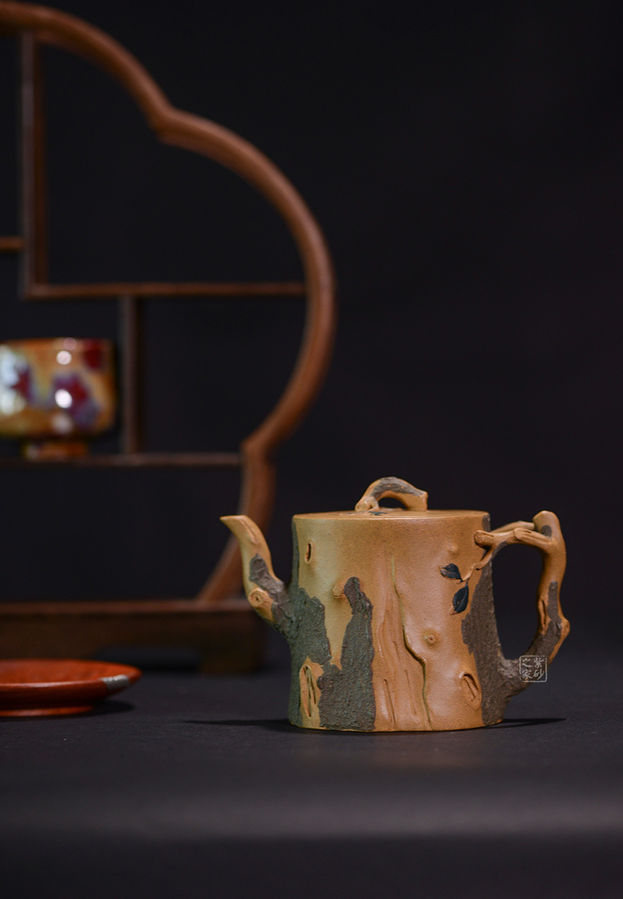 作品壺身、流、把、鈕全部是用極富生態(tài)的殘樁及纏枝組成,本山綠泥泥漿堆積塑造成型,栩栩如生,感受秋風(fēng)之下的自然生姿。