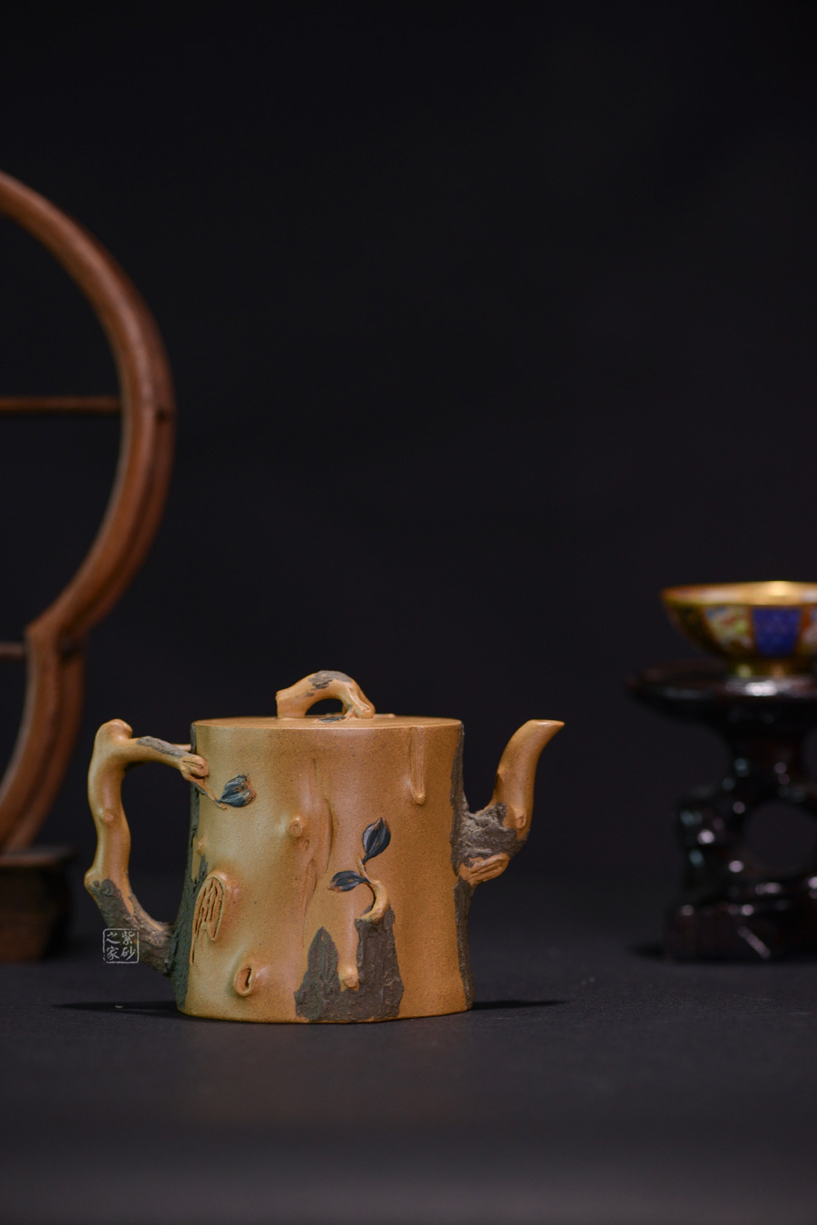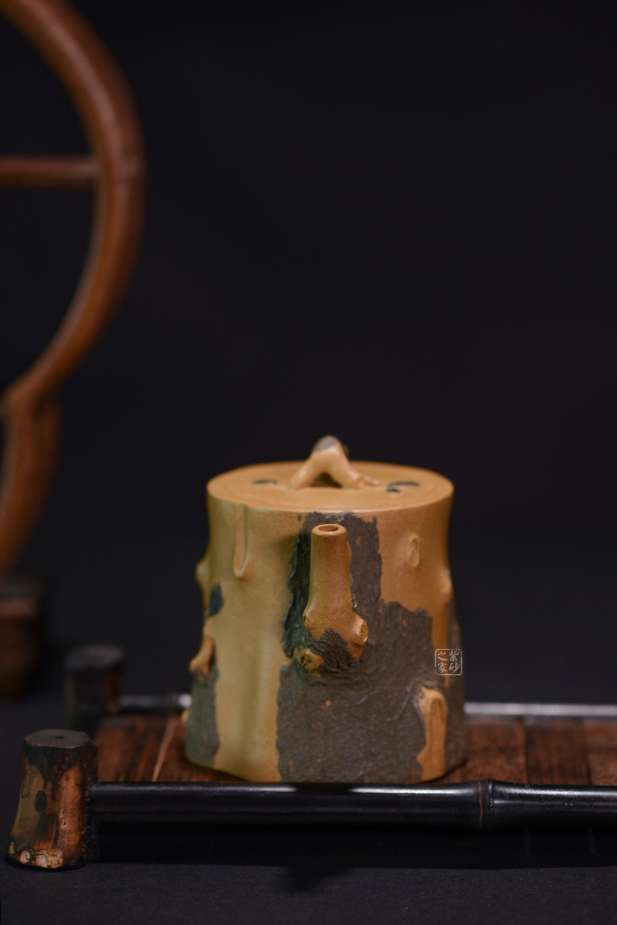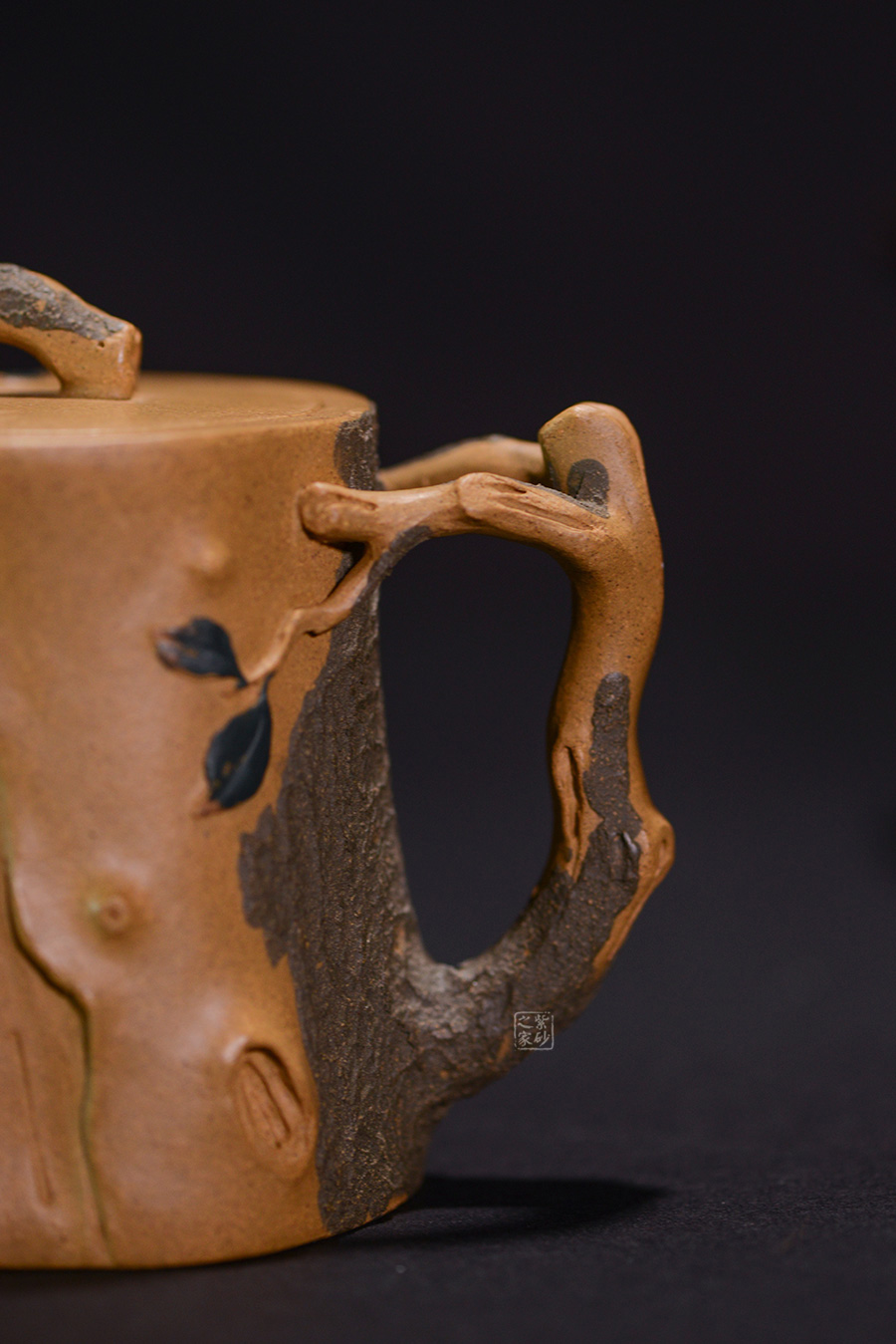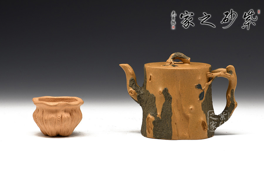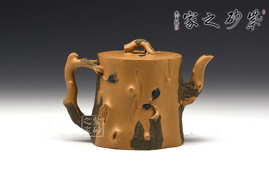 作品壺身、流、把、鈕全部是用極富生態(tài)的殘樁及纏枝組成,本山綠泥泥漿堆積塑造成型,栩栩如生,感受秋風(fēng)之下的自然生姿。