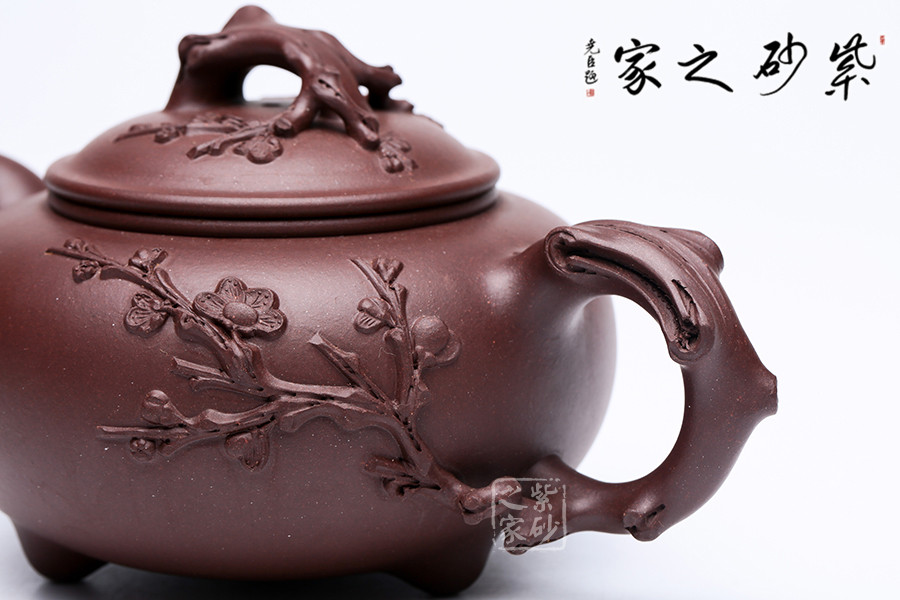 這把三足春暉,是范建華老師用原礦紫泥純手工制作而成,整把壺采用三乳足,以梅枝為壺把、壺嘴、壺扭。而三處梅枝各具形態(tài),每處梅都是旁逸斜出而又神態(tài)各一,有含苞待放的,有怒放盛開的,把玩此壺就有一種守著一片梅園,有暗香浮動,處處生花。真切體會到陸游賞梅的感覺:何方化作身千億,一樹梅花一放翁。