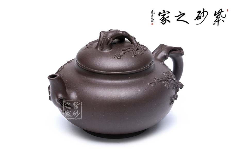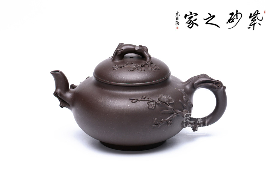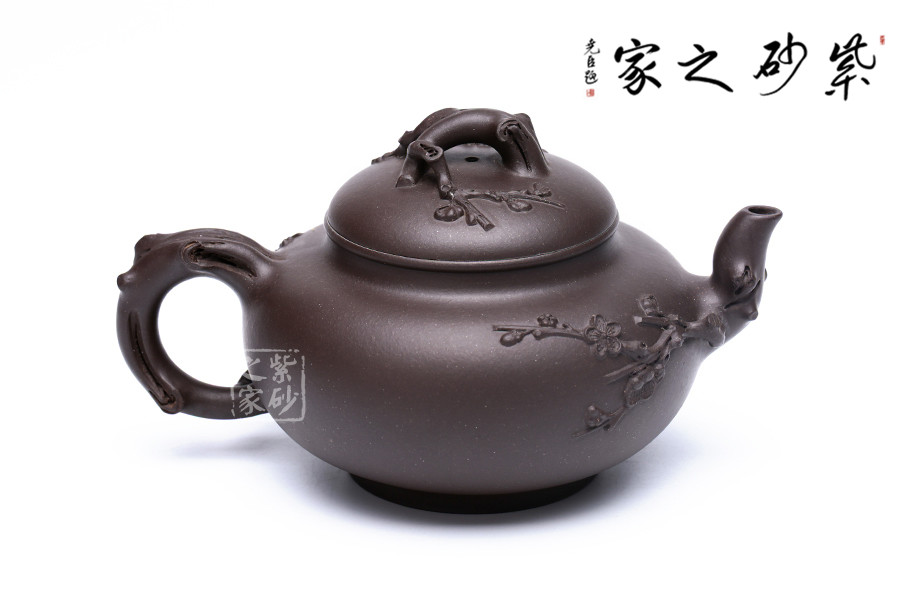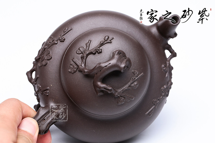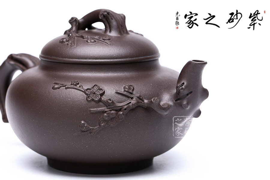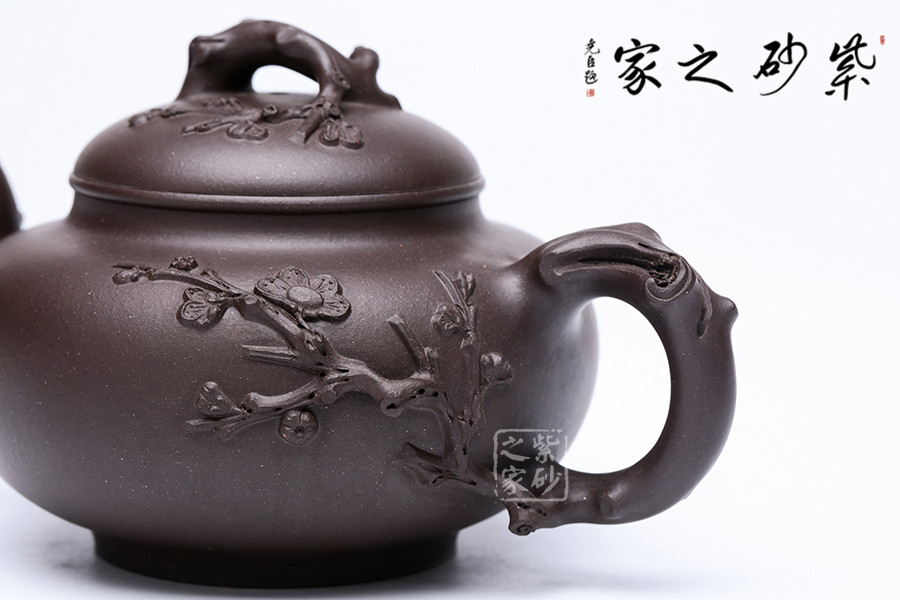 范老師擅長(zhǎng)梅竹入壺,這把壺也是以梅花為題材,由于紫壺泥色較深,梅枝較粗,使?jié)饽夭实拿坊ǜ兴囆g(shù)表現(xiàn)力。此壺是原礦紫泥純手工制作,泥色古樸自然,壺把壺蓋壺嘴皆以梅花入手,梅花入口清潤(rùn)韻香,讓人倍感清馨。