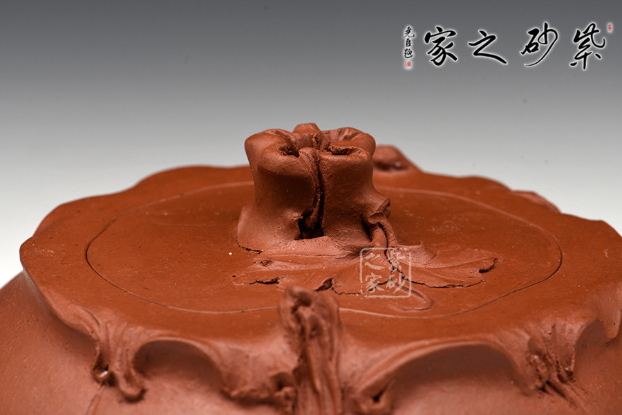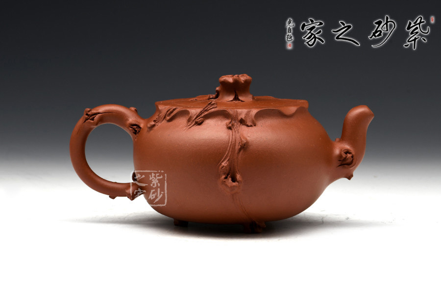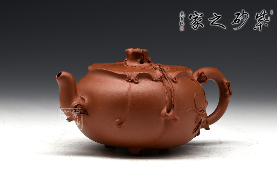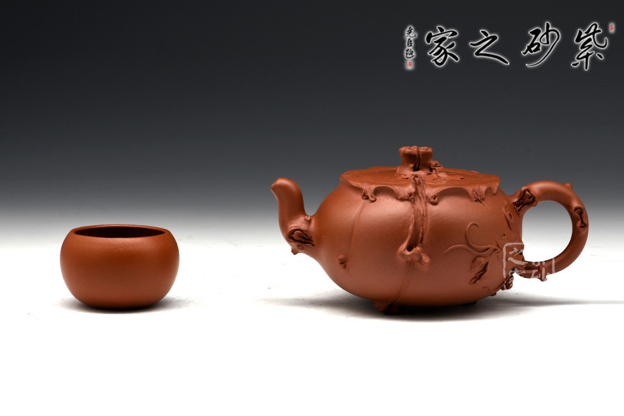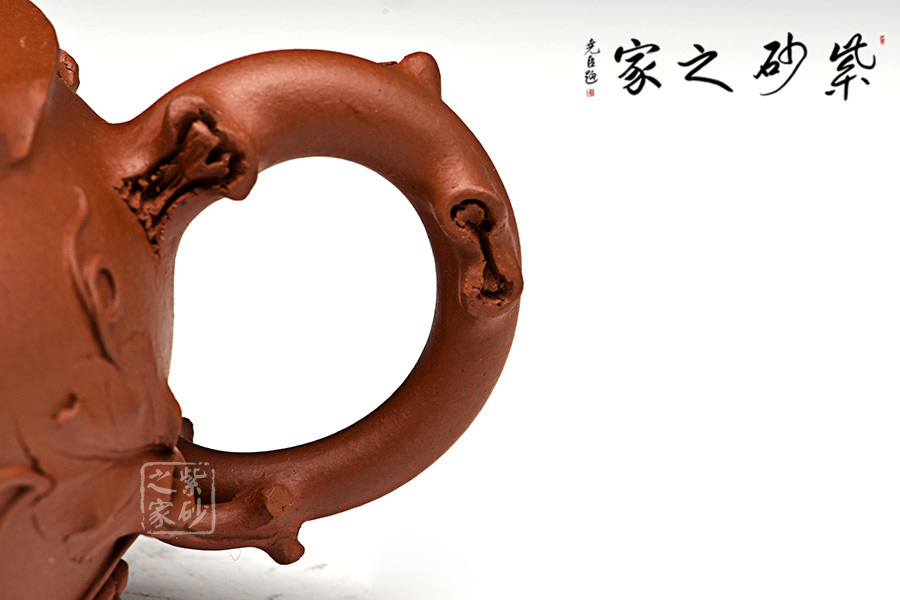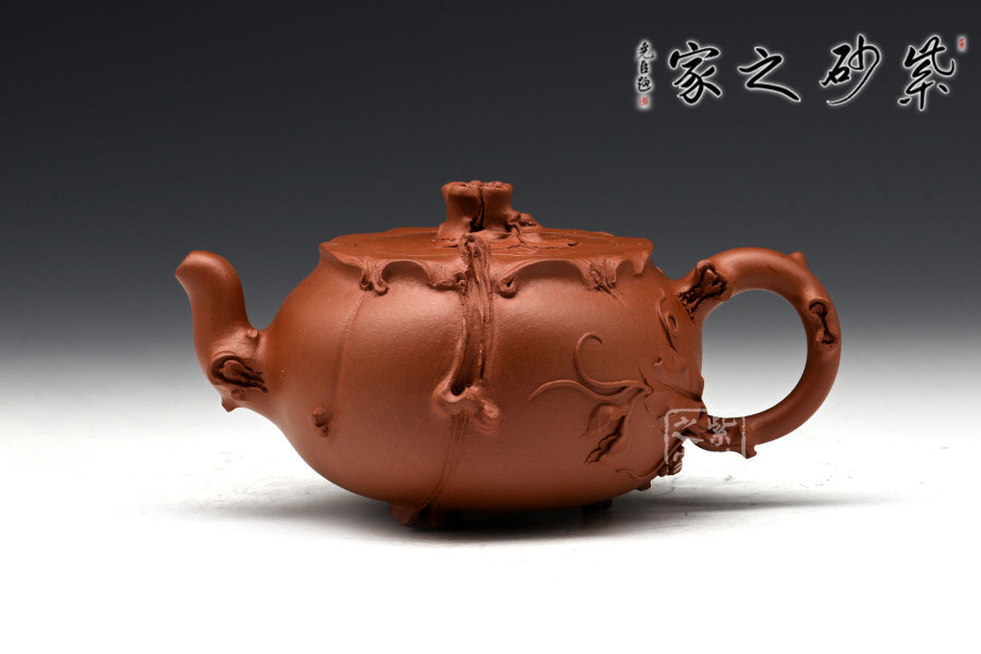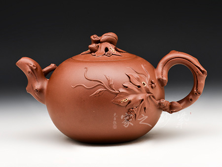 這一壺形充分展示了紫砂壺仿真象形的非凡造詣:葡萄新藤交錯(cuò)盤繞,藤葉鮮嫩欲滴,惟妙惟肖,充滿了無限情趣。