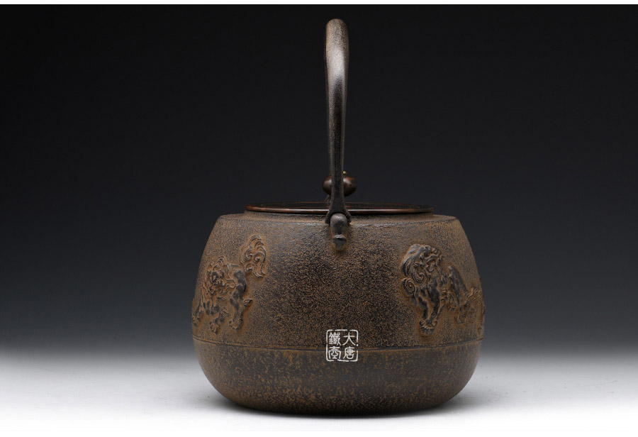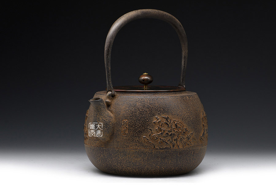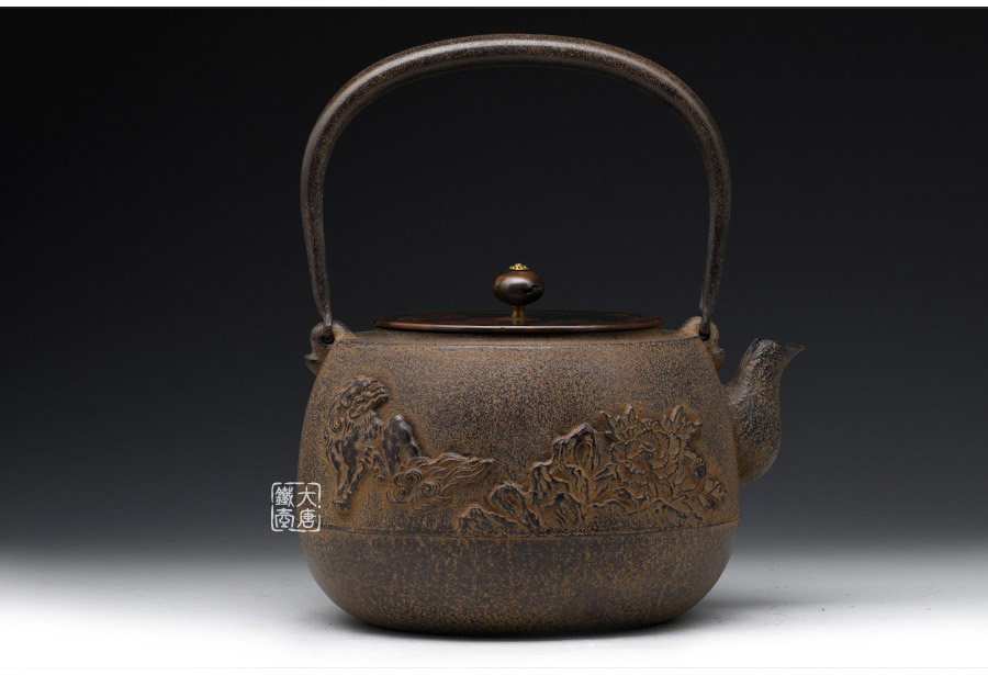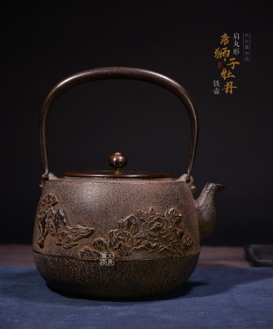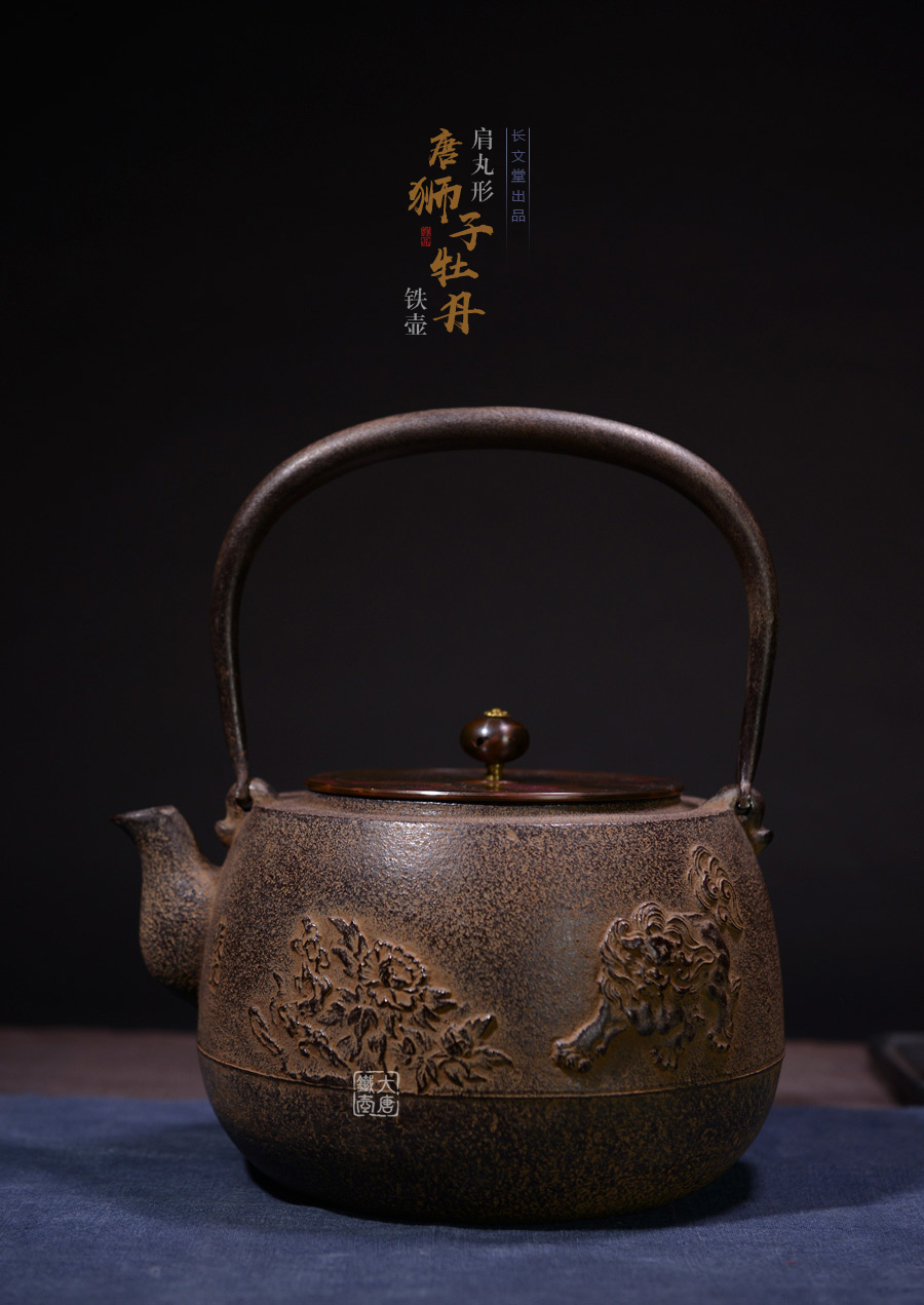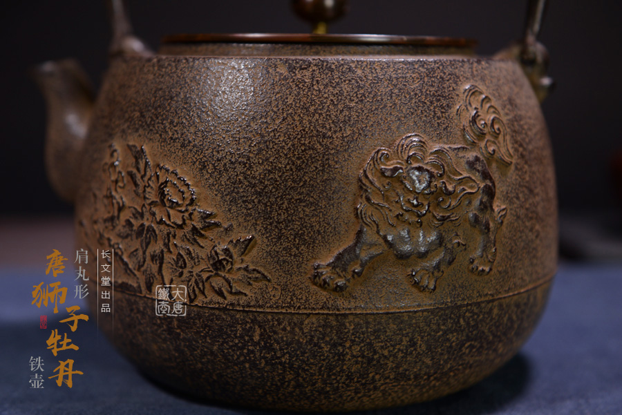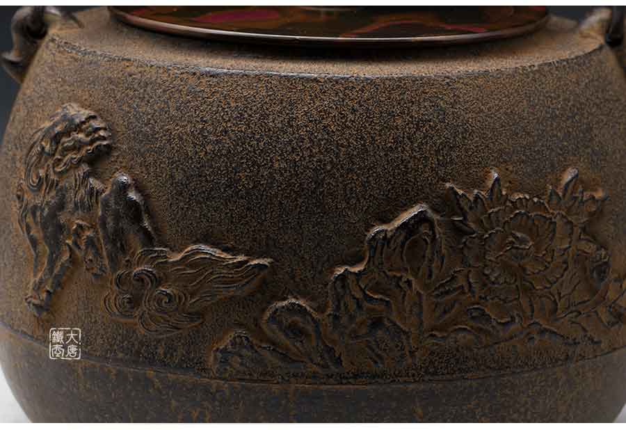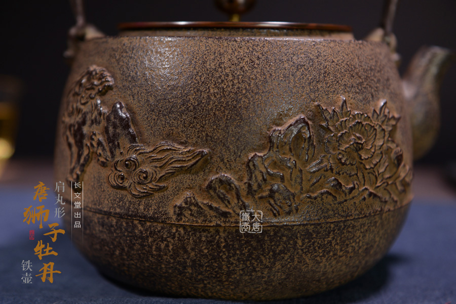 長文堂 肩丸形唐獅子牡丹鐵壺 [ 編號:68667 ]