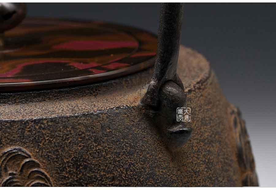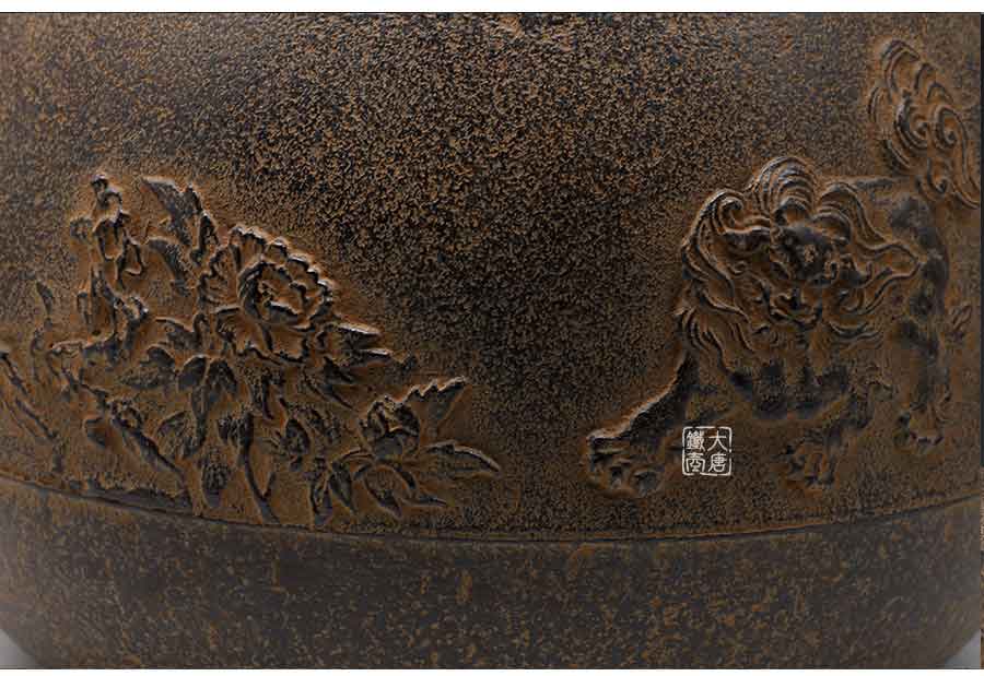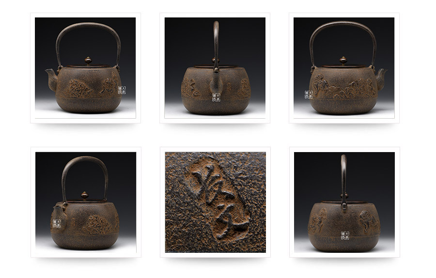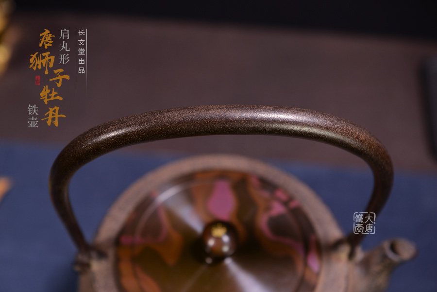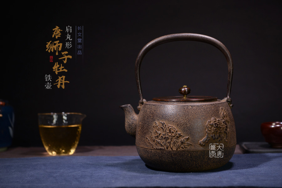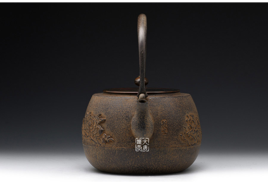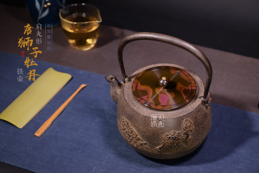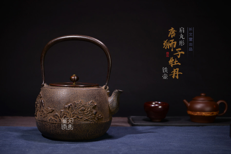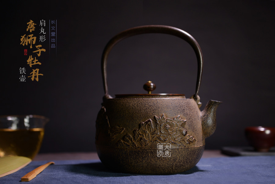 長文堂 肩丸形唐獅子牡丹鐵壺 [ 編號:68667 ]