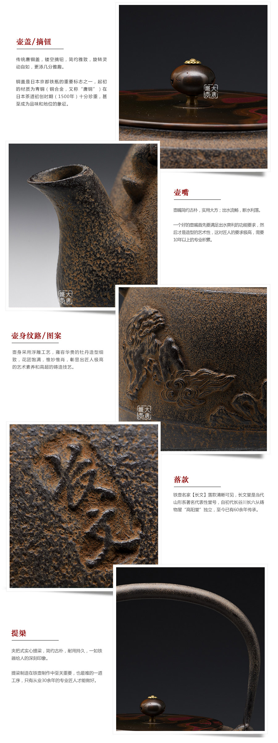 昭和27年(1952年)長文堂初代長谷川長六從鑄物屋“高陽堂”中獨(dú)立,自設(shè)工房,從事鐵瓶和湯釜的制作。昭和39年(1964年),長六逝世,其子長谷川文雄繼承父業(yè),成為二代目,并在山形縣銅町設(shè)立新的工房,取其父親名中的“長”和自己名中的“文”,合名為長文堂。此后,長谷川文雄常以藝名“長文” 制作和出席各類活動。