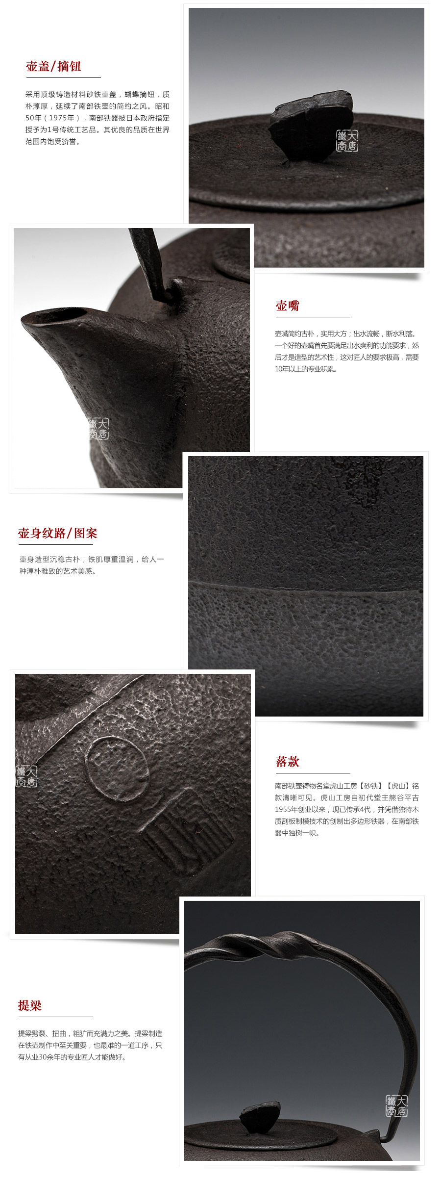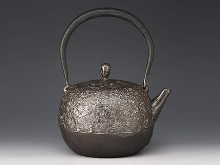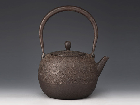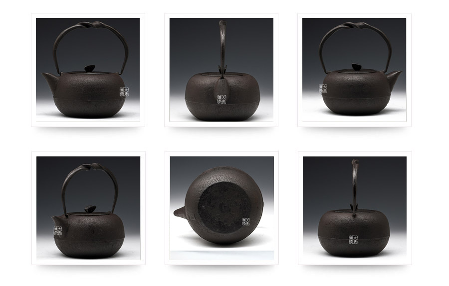 虎山工房創(chuàng)立于1955年,位于盛岡市手作村,是日本南部鐵器中的重要代表?!被⑸健敝从诔醮獛熜芄绕郊某錾厥且郧澳喜糠曫B(yǎng)老虎的地方,故取“虎山”作為工房的名字。熊谷平吉擅長印刻湯釜和鐵瓶上的圖案,制作的鐵器帶有濃厚的藝術(shù)氣息,被視為鐵和火融合于一身的茶道藝術(shù)品。虎山工房制作的鐵瓶,主要以砂模澆鑄的方法為主,但是改進了木質(zhì)刮板的制模技術(shù),從而得以制作出多邊形的鐵器,在南部鐵器中獨樹一幟。