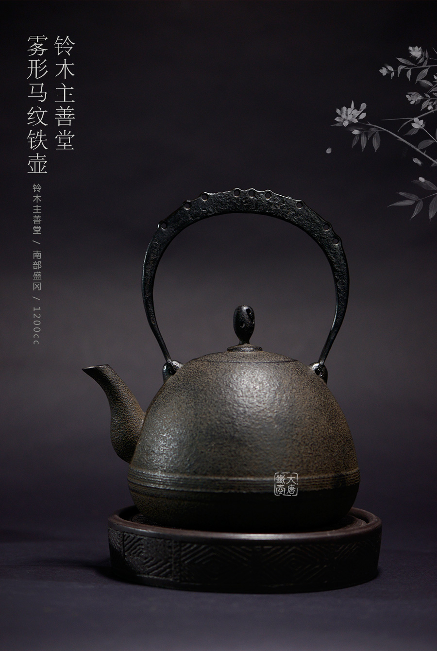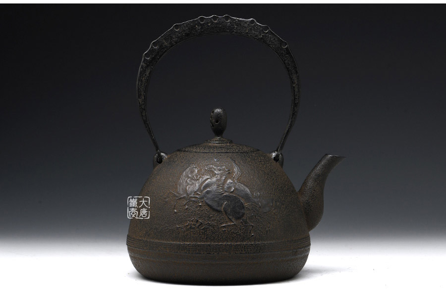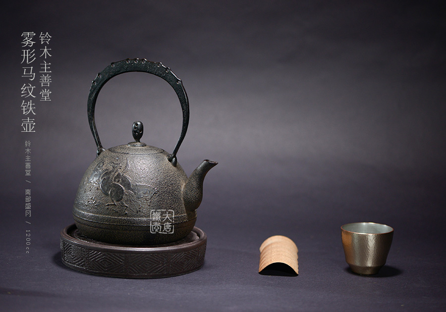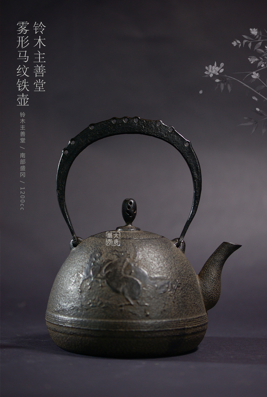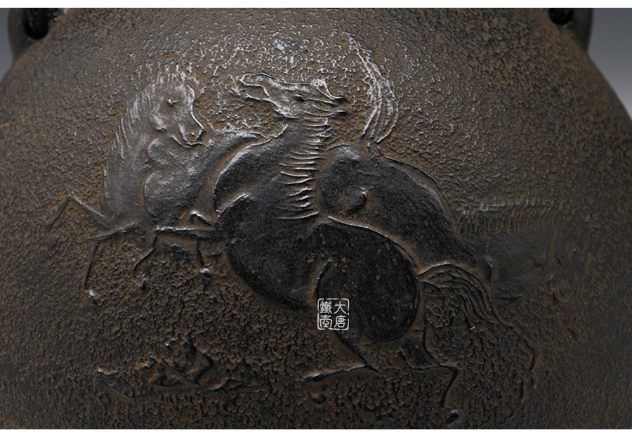 鈴木主善堂匠心之作,一模一具,純手工砂鑄成型。浮雕駿馬氣貫長(zhǎng)虹,奮蹄蹦躍,身姿矯健,精神抖擻,惟妙惟肖,展現(xiàn)出匠人極高的藝術(shù)素養(yǎng)的高超的鑄造技藝。