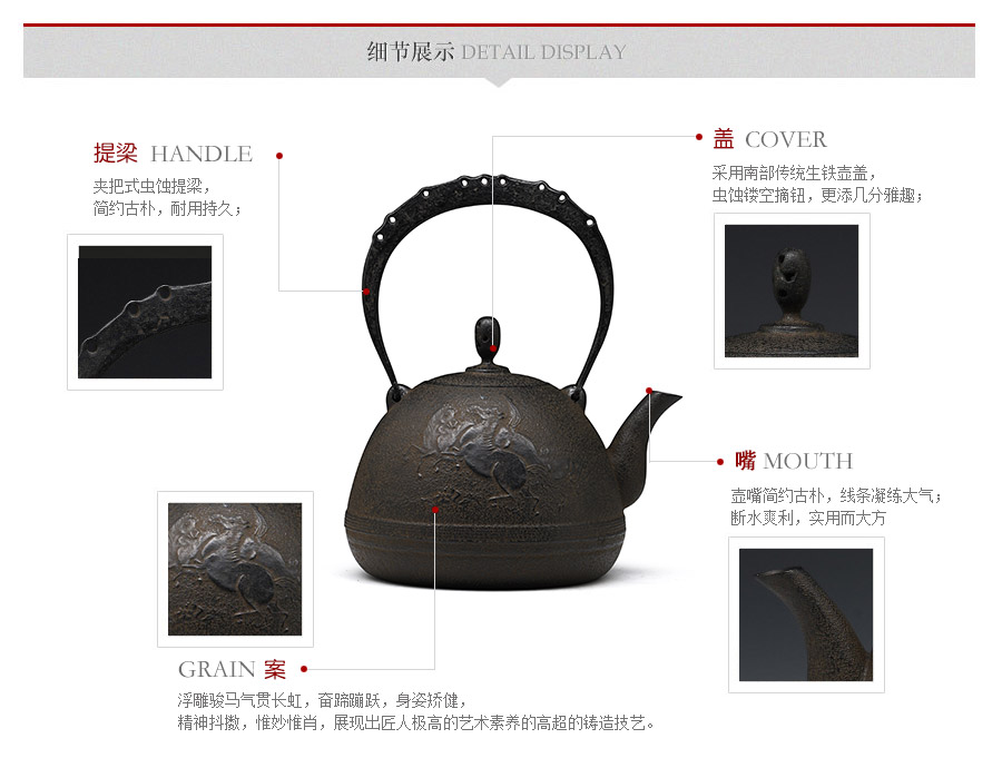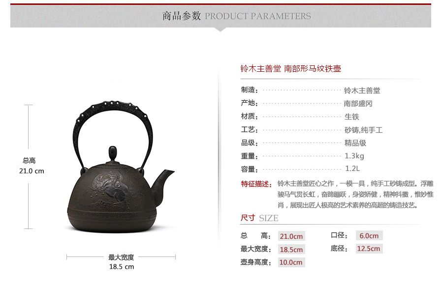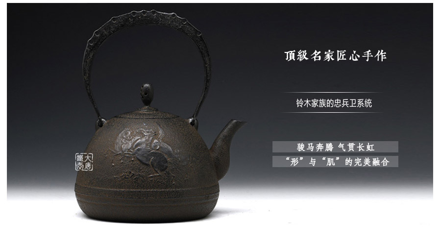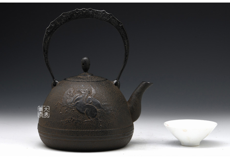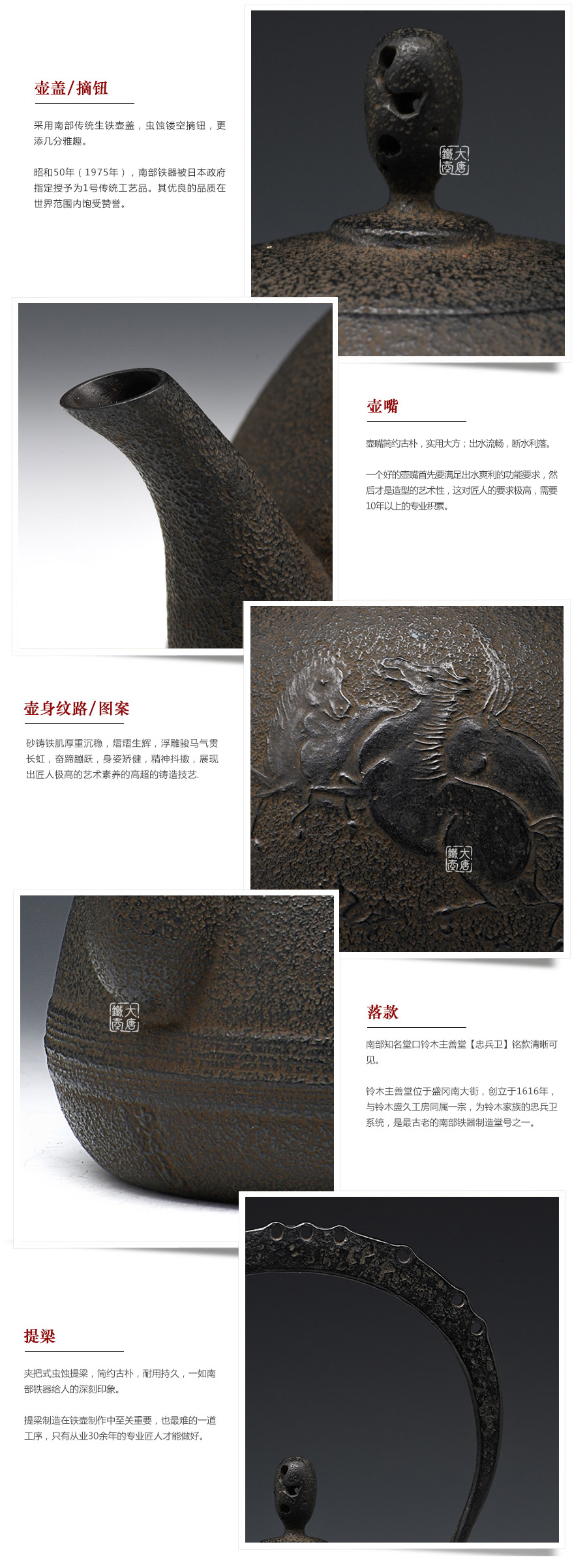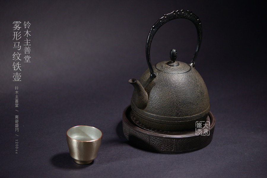 鈴木主善堂匠心之作,一模一具,純手工砂鑄成型。浮雕駿馬氣貫長(zhǎng)虹,奮蹄蹦躍,身姿矯健,精神抖擻,惟妙惟肖,展現(xiàn)出匠人極高的藝術(shù)素養(yǎng)的高超的鑄造技藝。