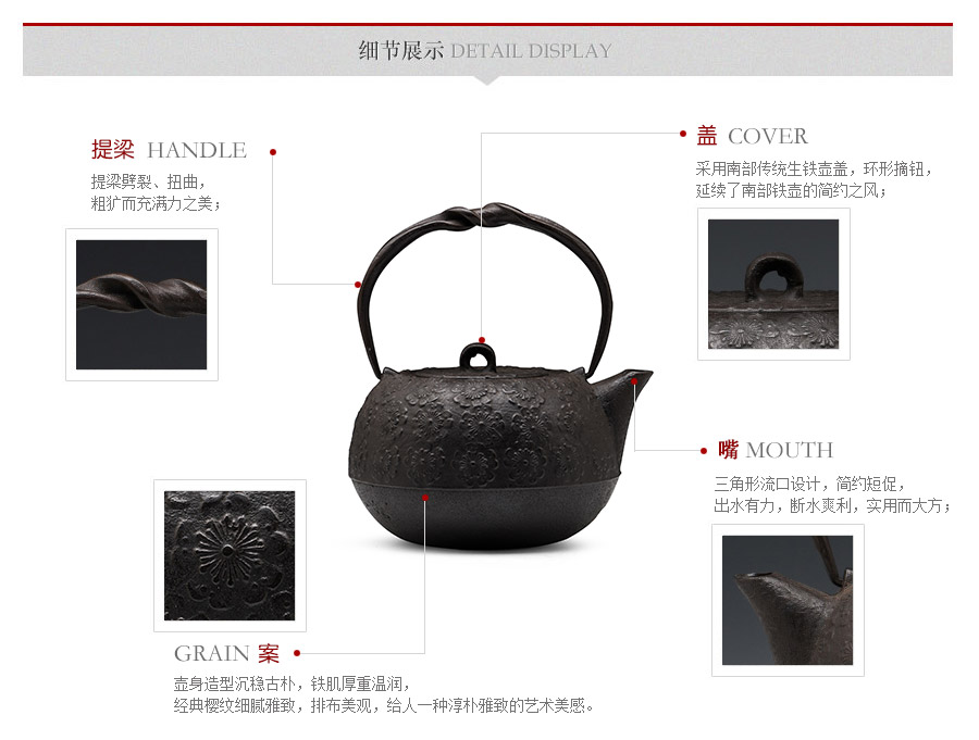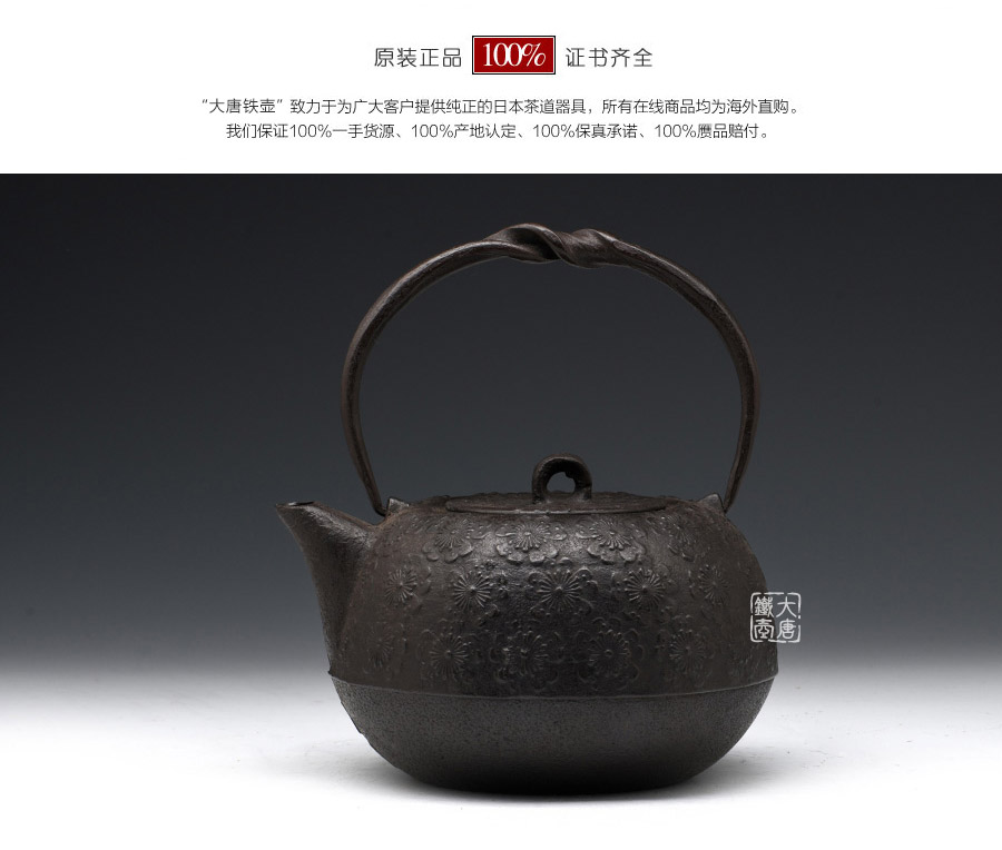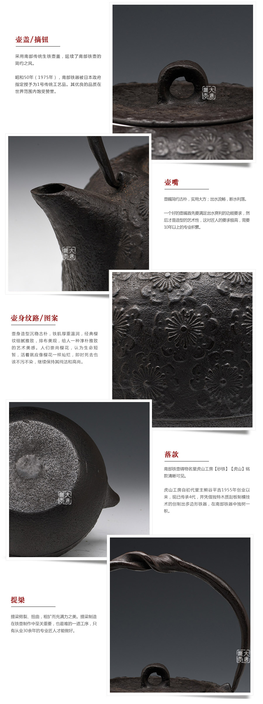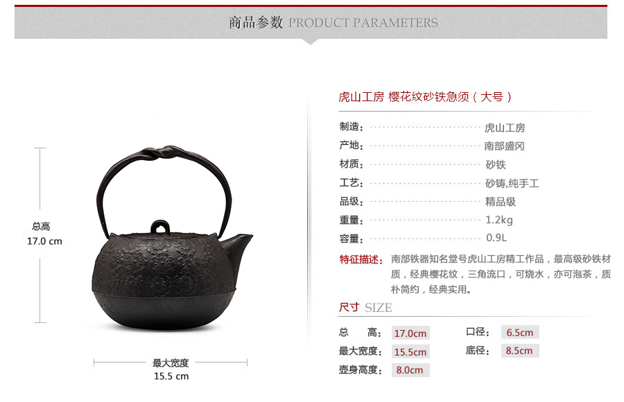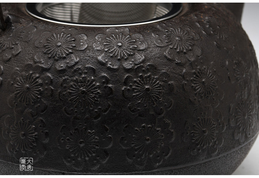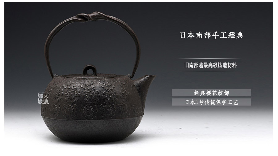 南部鐵器知名堂號虎山工房精工作品,最高級砂鐵材質(zhì),經(jīng)典櫻花紋,三角流口,可燒水,亦可泡茶,質(zhì)樸簡約,經(jīng)典實(shí)用。