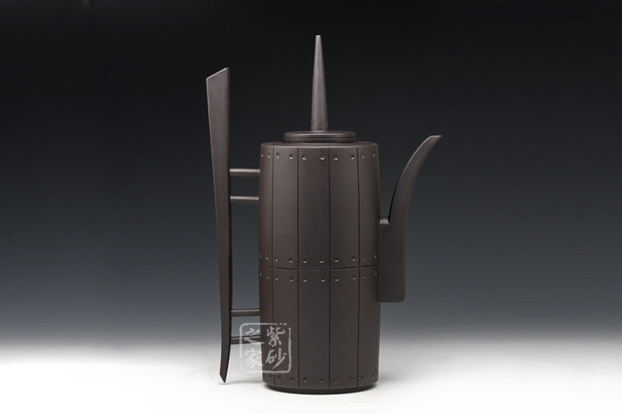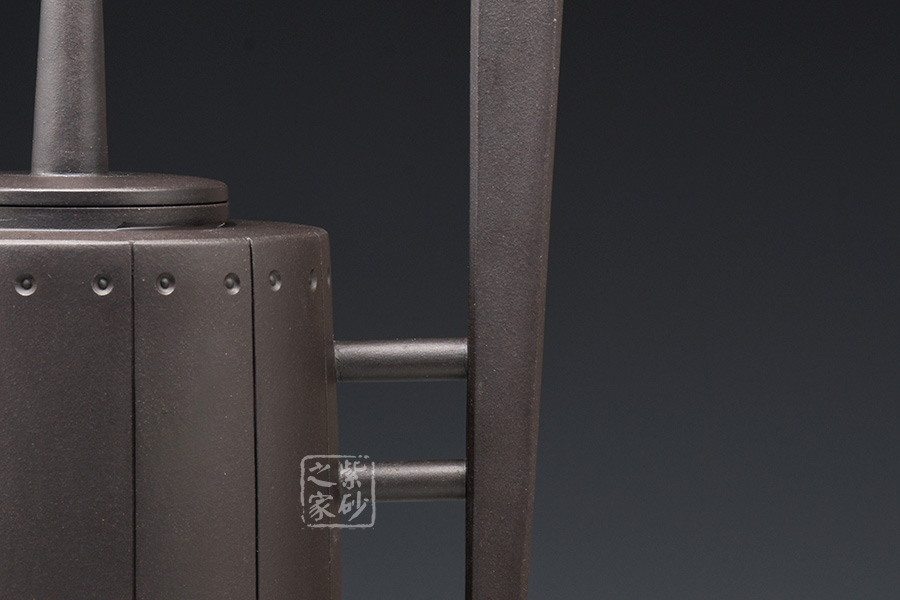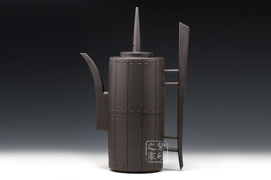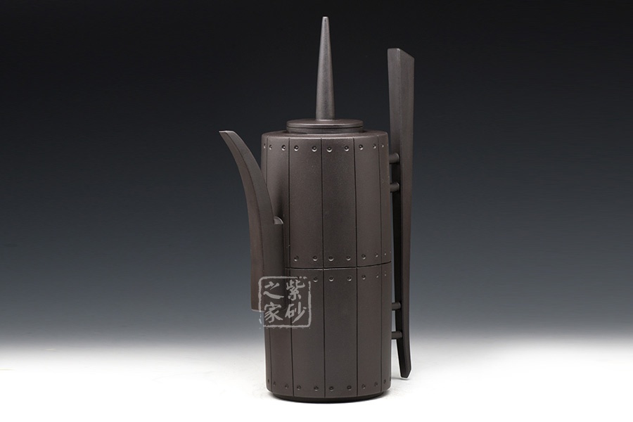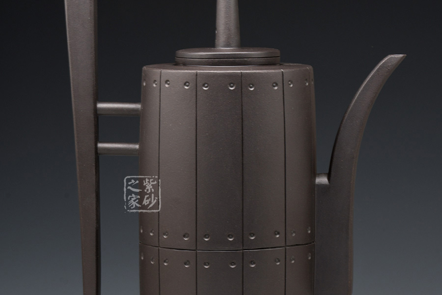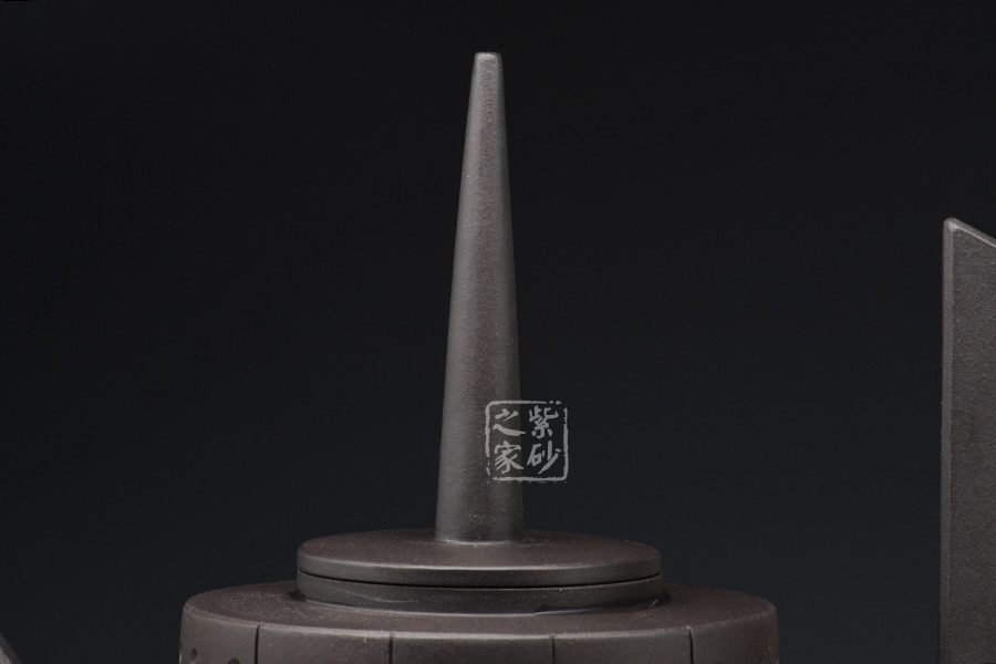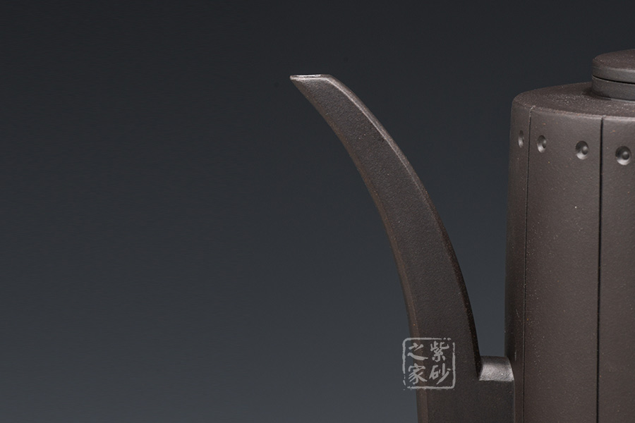 作品獨特的造型引人注目,此壺口沿密合,高瘦圓柱體壺身大氣自然。壺嘴、壺把線條優(yōu)雅流暢,過度自然,渾然天成,與壺身銜接處宛如自然長出。壺鈕獨特,高高直立,挺立的姿態(tài)宛如一正氣凜然的將士,使用起來手感更好、觀賞更佳。